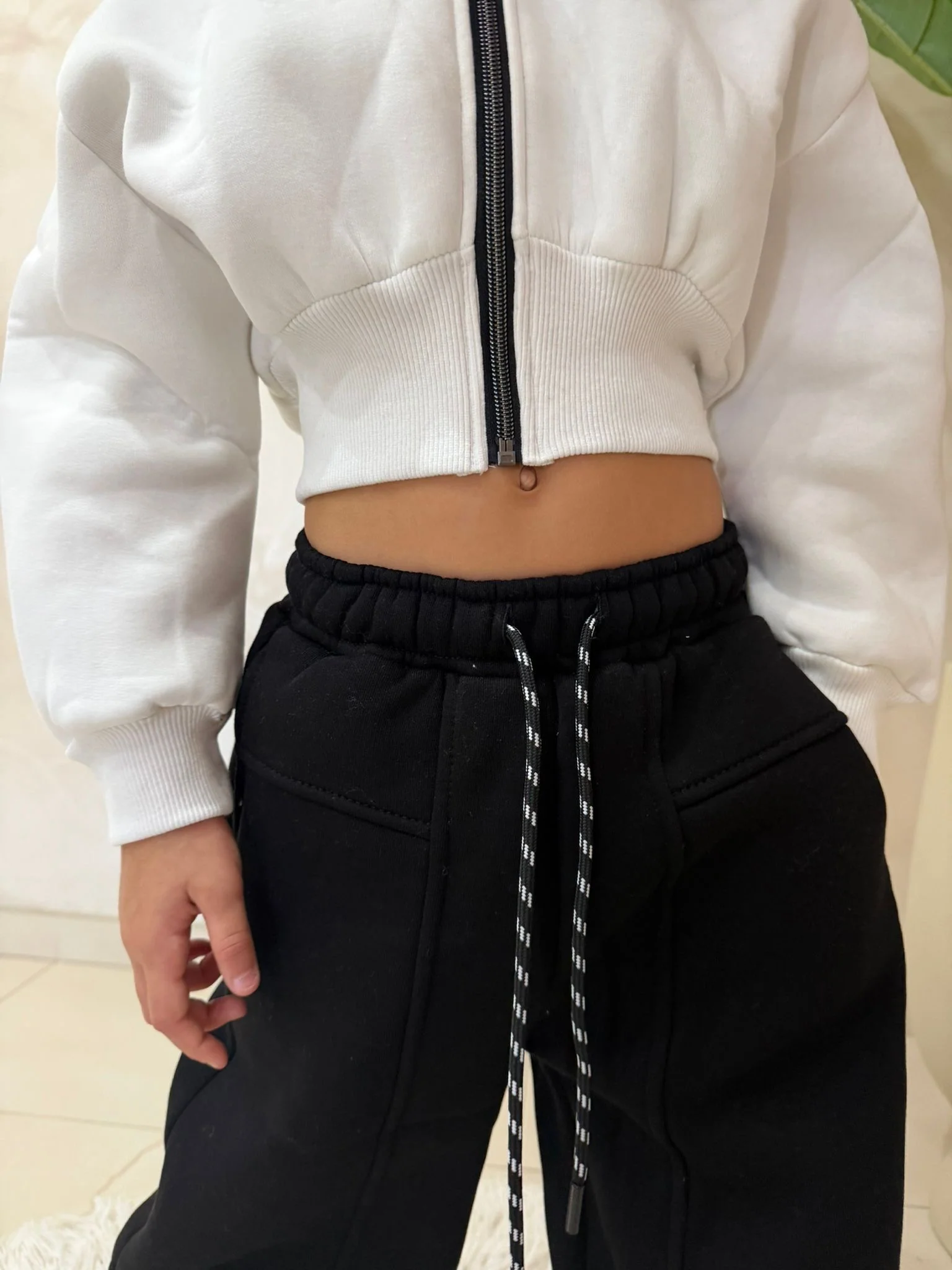 Dettaglio: Felpa cropped con zip e polsini elasticizzati; pantaloni a gamba larga con coulisse bicolore e tasche laterali