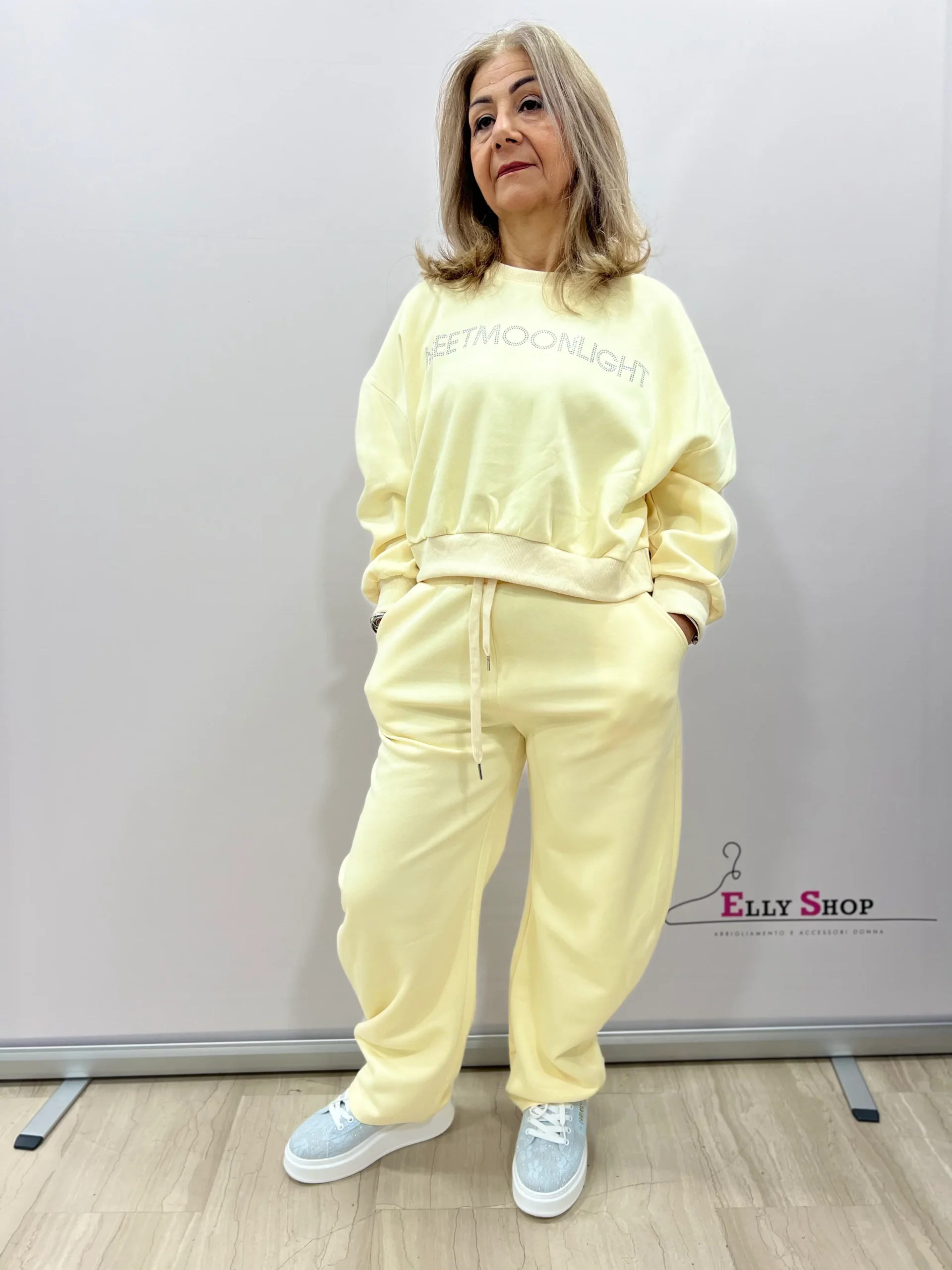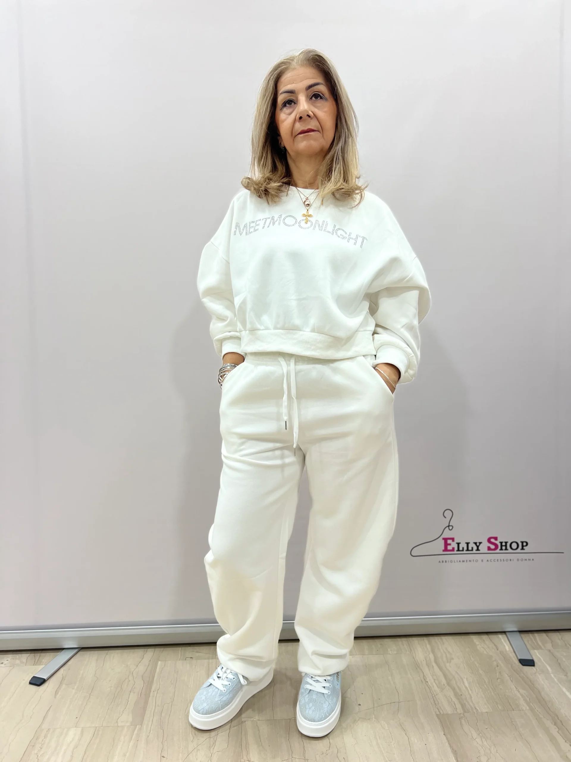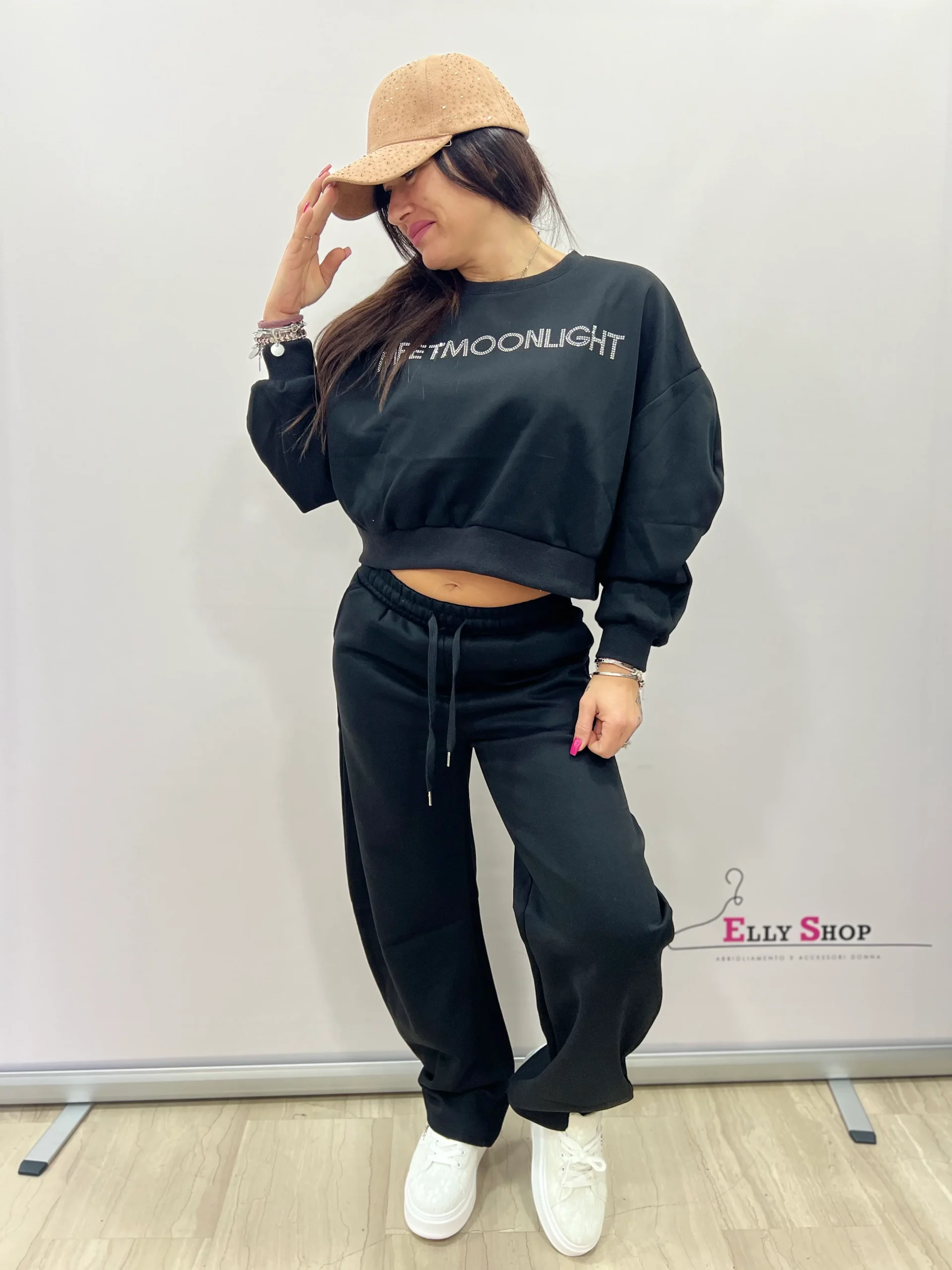 Completo Tuta Donna “Meet Moonlight” Completo tuta due pezzi dallo stile casual chic, perfetto per il tempo libero e per creare look sportivi ma curati. Composto da felpa cropped a manica lunga con scritta frontale luminosa e pantalone jogger coordinato, questo set unisce comfort e tendenza in un design moderno e femminile. La vestibilità morbida […]