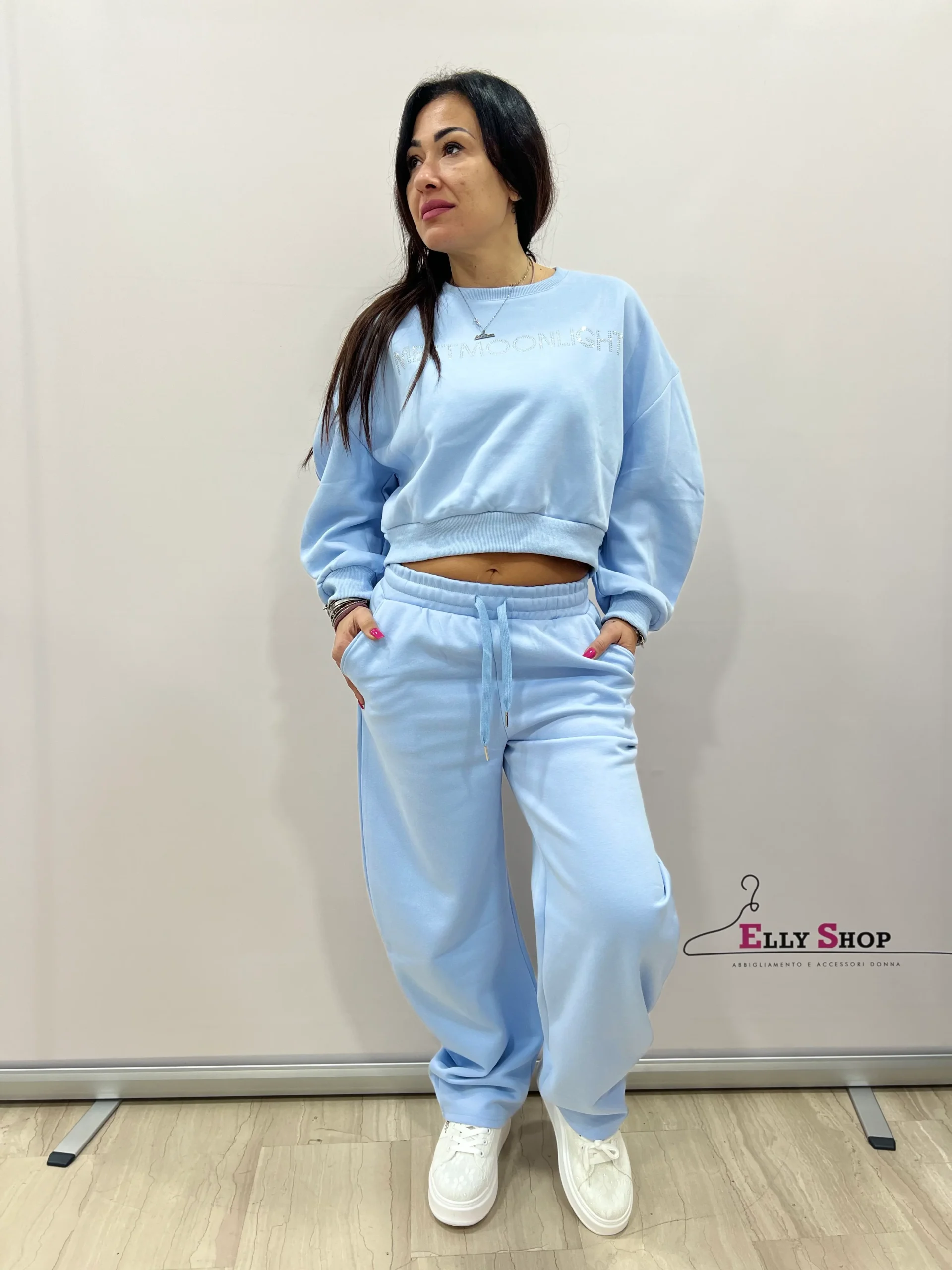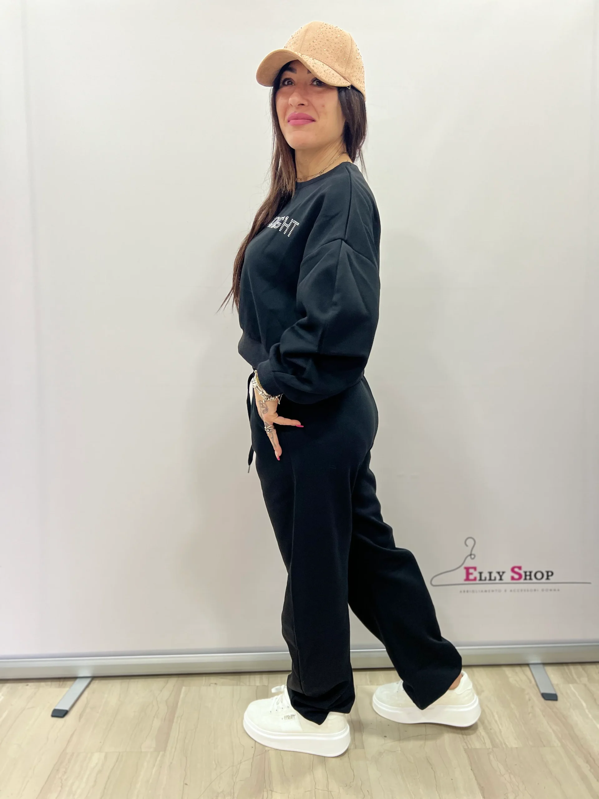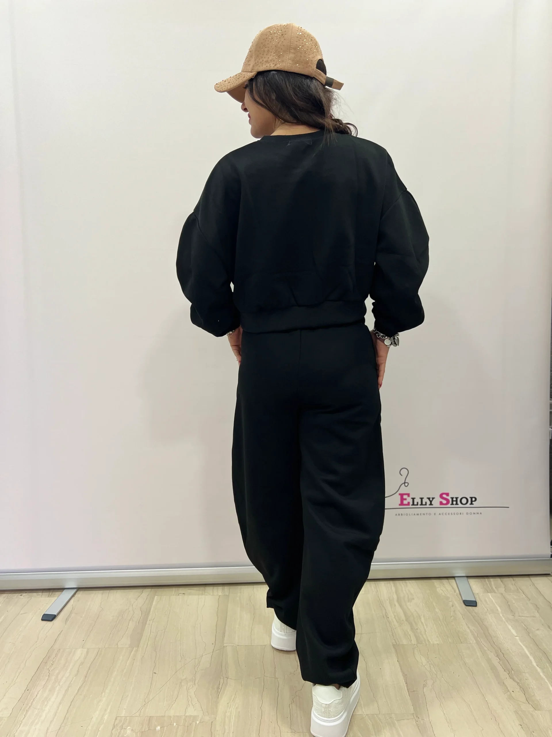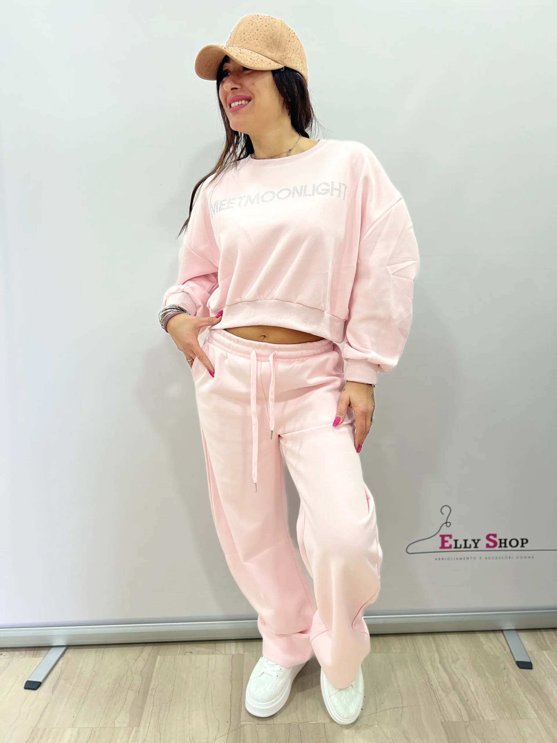 Completo Tuta Donna “Meet Moonlight” Completo tuta due pezzi dallo stile casual chic, perfetto per il tempo libero e per creare look sportivi ma curati. Composto da felpa cropped a manica lunga con scritta frontale luminosa e pantalone jogger coordinato, questo set unisce comfort e tendenza in un design moderno e femminile. La vestibilità morbida […]