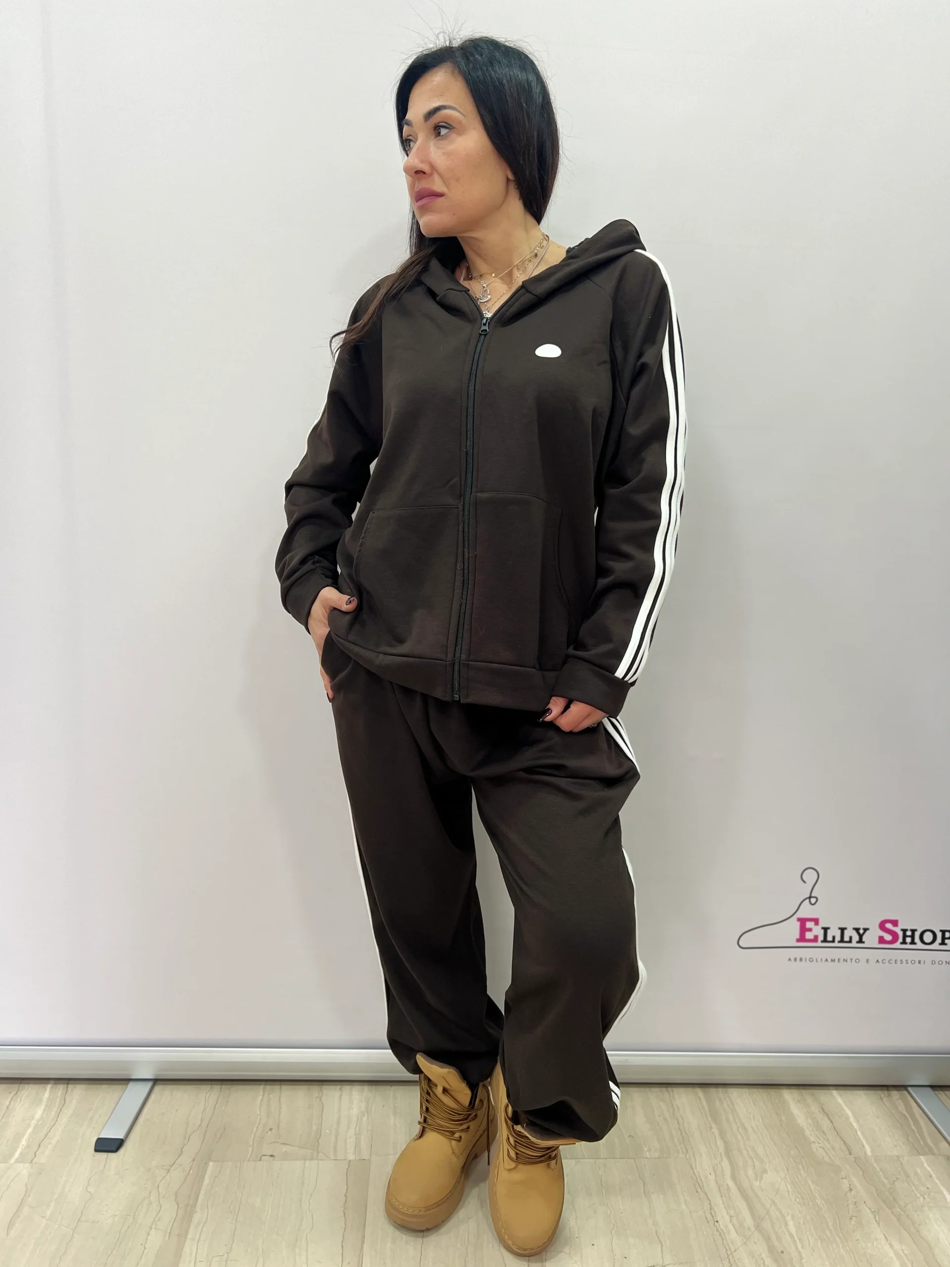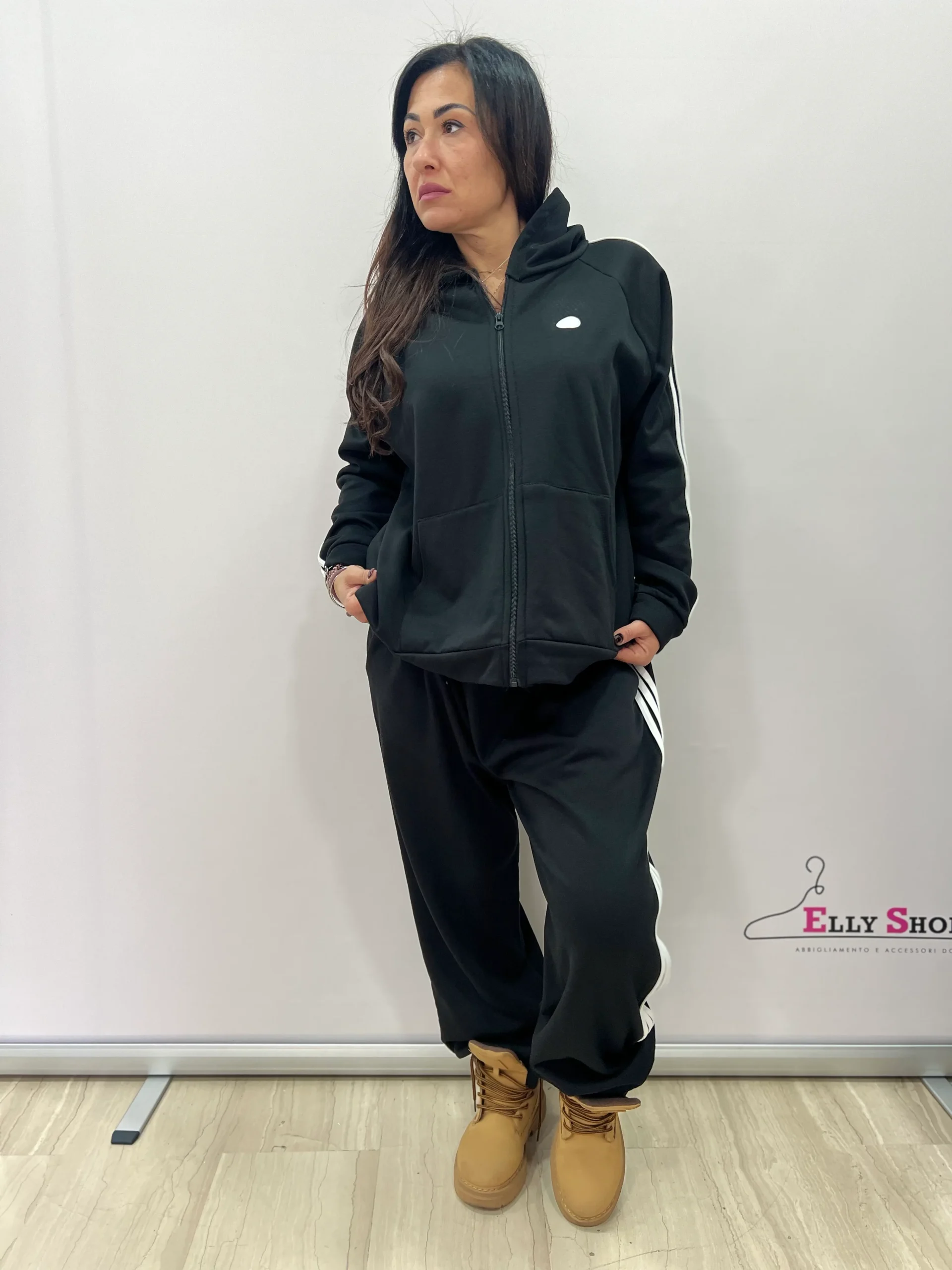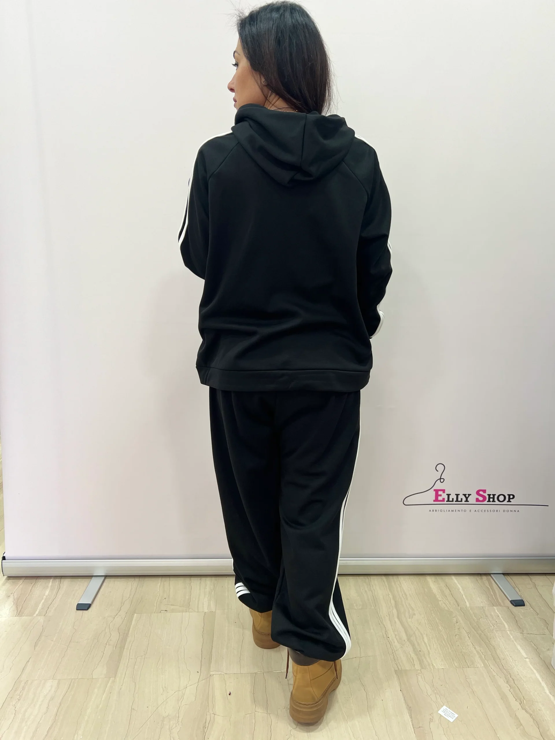 Dettaglio: Felpa con cappuccio e chiusura zip, tasche frontali, pantalone con elastico in vita e bande laterali a contrasto