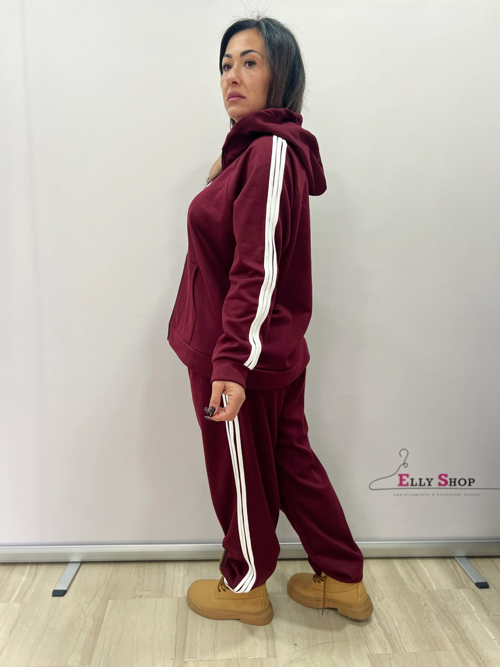 Completo tuta donna curvy dallo stile sportivo e deciso, pensato per valorizzare le forme con una vestibilità comoda e contemporanea. Il set è composto da felpa con cappuccio e zip frontale e pantalone coordinato, entrambi rifiniti con bande laterali a contrasto che slanciano la silhouette. Ideale per il tempo libero, viaggi o look casual urban, unisce praticità e carattere in un capo versatile e confortevole. Disponibile in colori intensi e di tendenza, perfetti per un outfit dinamico e moderno.
