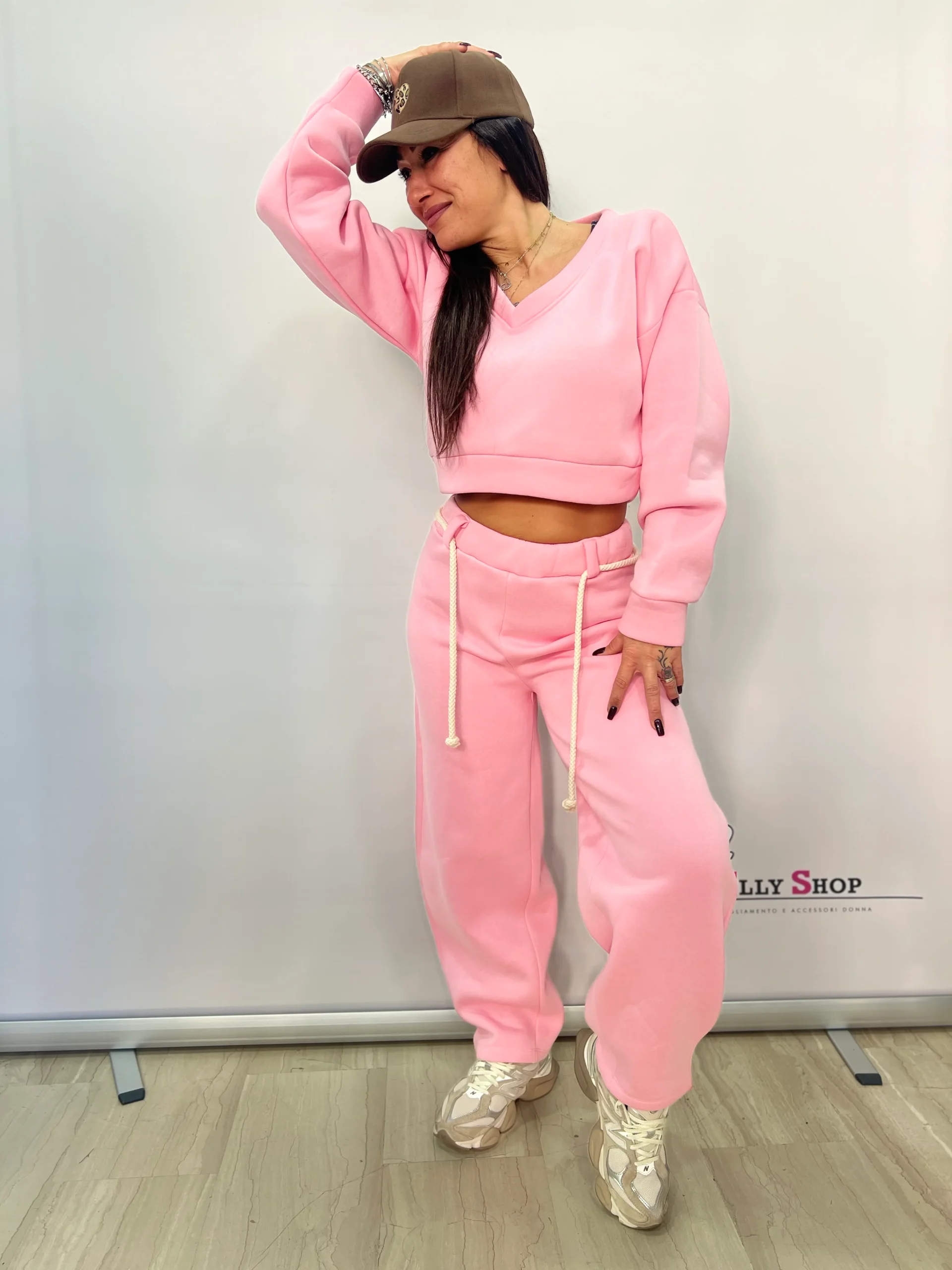 Dettaglio: Felpa corta con scollo a V e pantalone jogging con coulisse decorativa