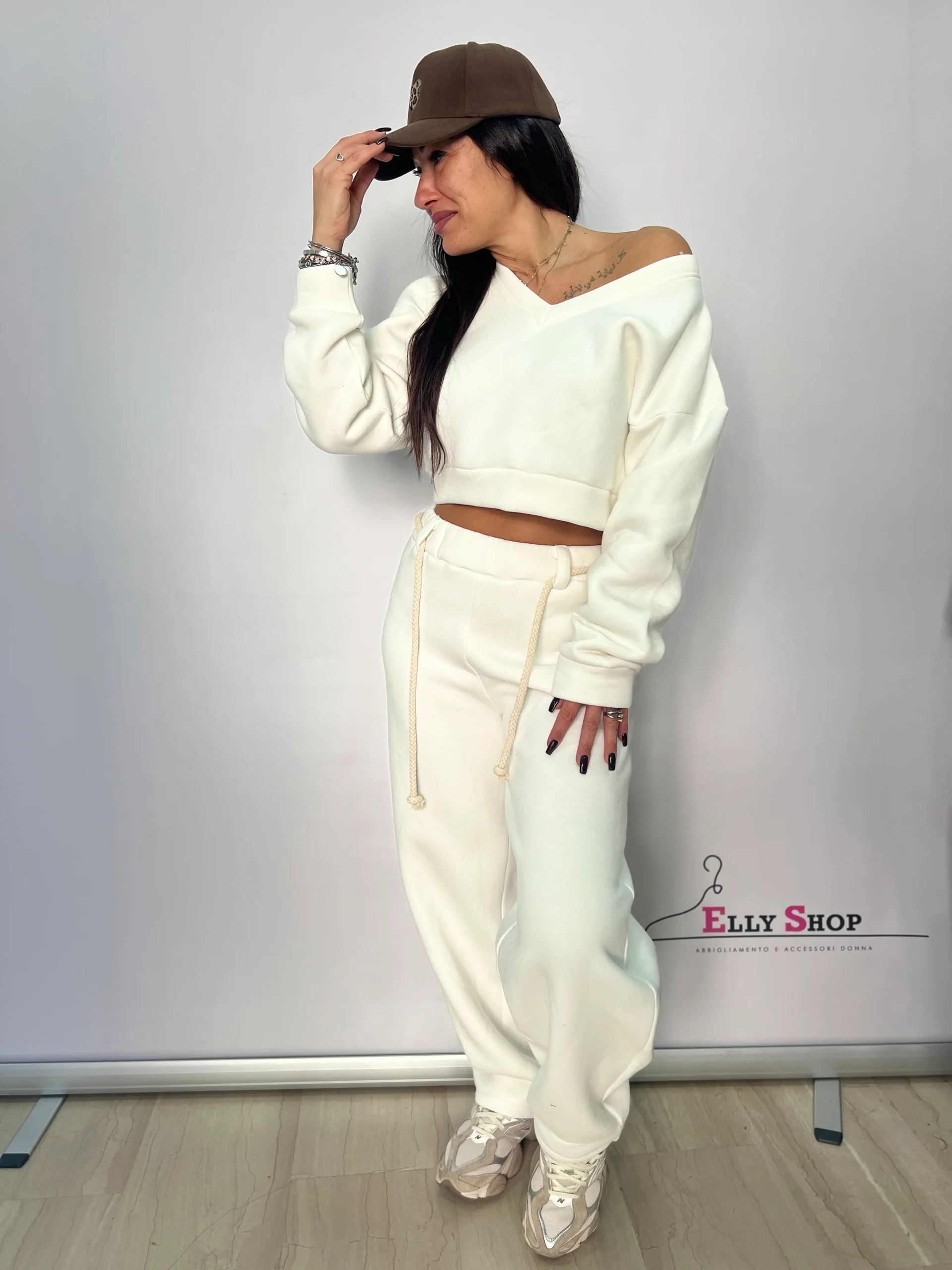 Completo due pezzi dal carattere casual e contemporaneo, ideale per chi ama uno stile sporty-chic senza rinunciare al comfort. La felpa crop con scollo a V valorizza la silhouette, mentre il pantalone jogging a vita elasticizzata garantisce una vestibilità comoda e rilassata. Perfetto per il tempo libero, look urban, viaggi o outfit quotidiani dal gusto moderno. Disponibile in diverse varianti colore per adattarsi a ogni stile.