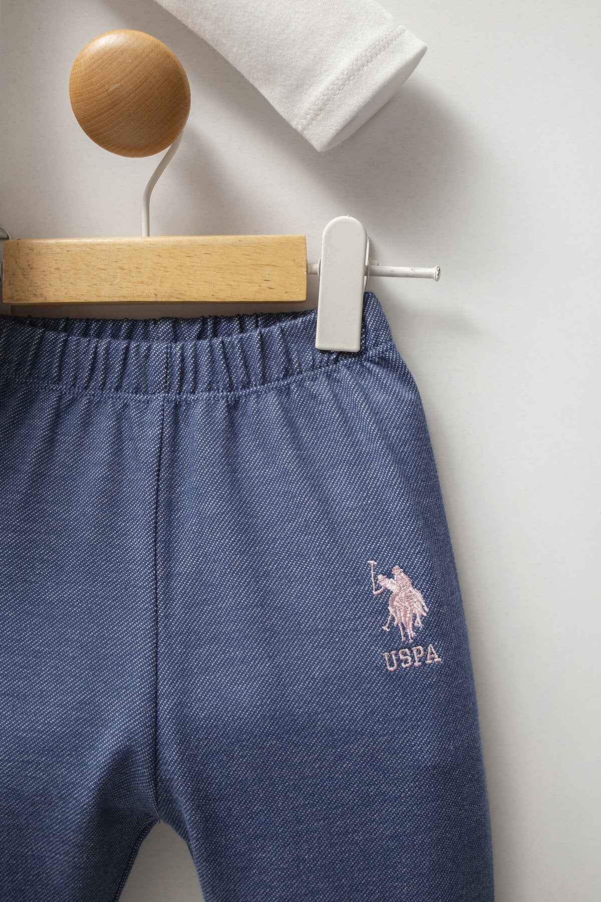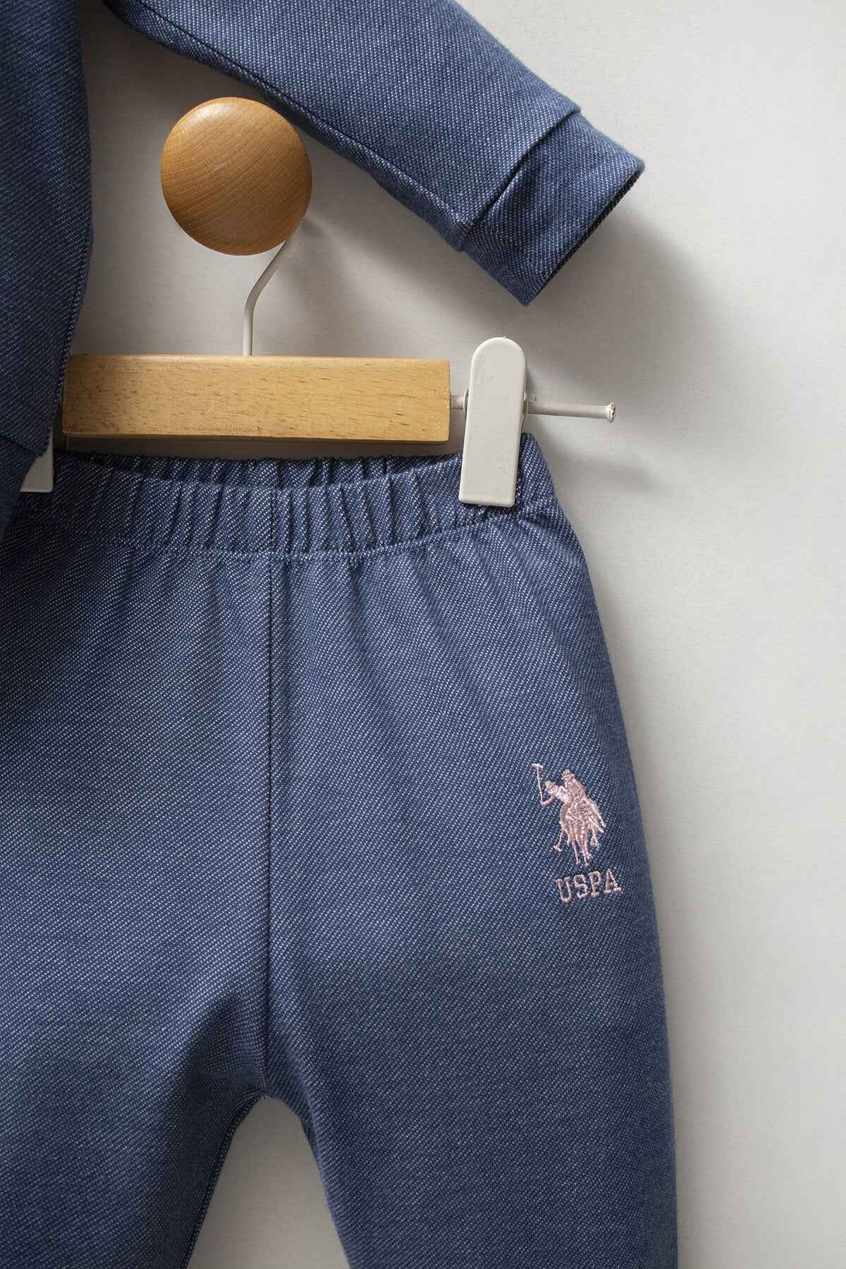 - Pantalone abbinato blu melange, con vita elasticizzata per seguire i movimenti senza stringere e garantire libertร durante gioco e passeggiate. Caviglie a polsino per tenere il pantalone in posizione e un look sempre ordinato. Anche qui dettaglio ricamato coordinato.