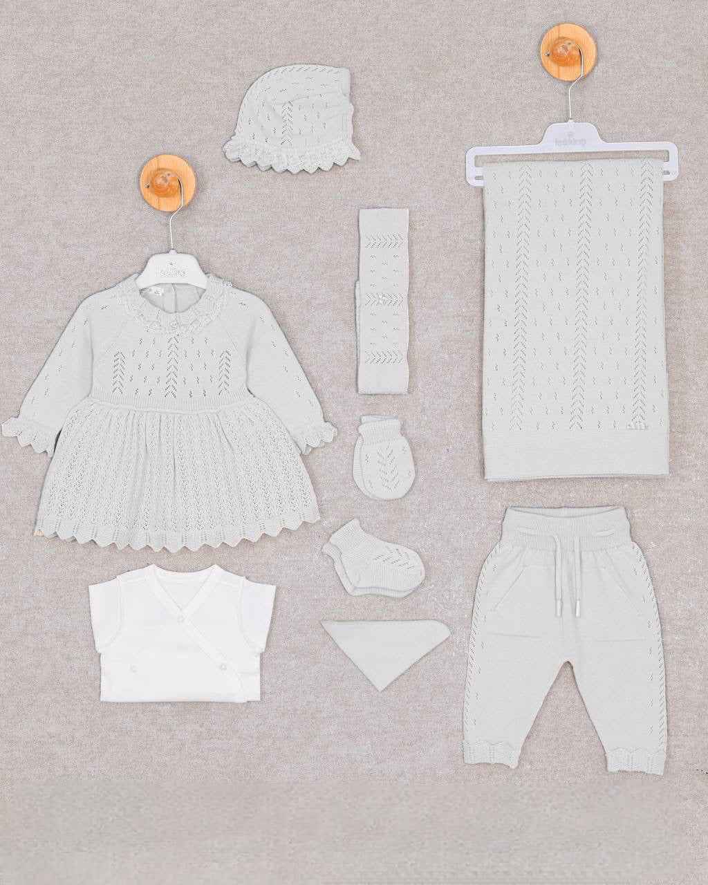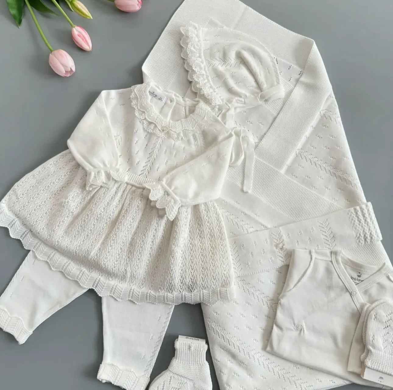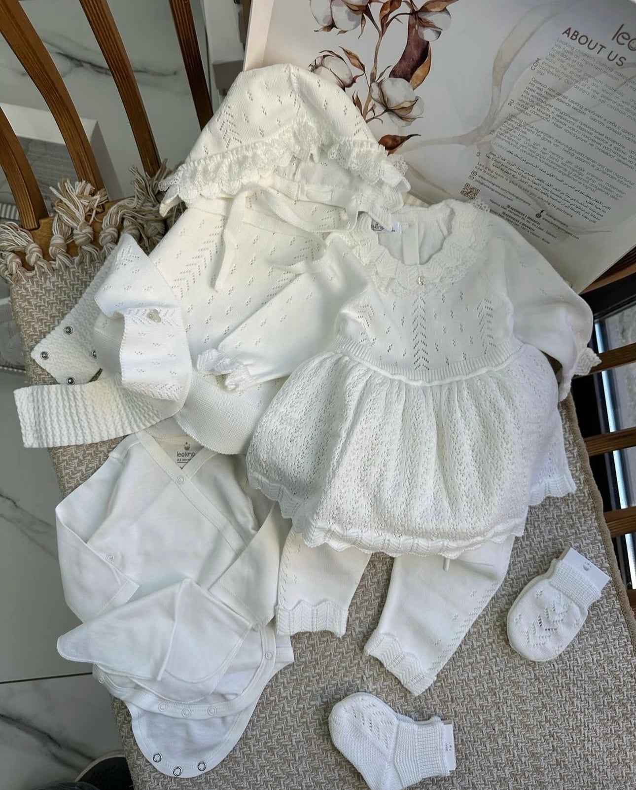 Dona al tuo bebè uno stile raffinato e confortevole con questo splendido set in 100% cotone lavorato a maglia, perfetto per le prime settimane di vita. Con dettagli delicati e materiali di alta qualità, è ideale come regalo nascita o battesimo.