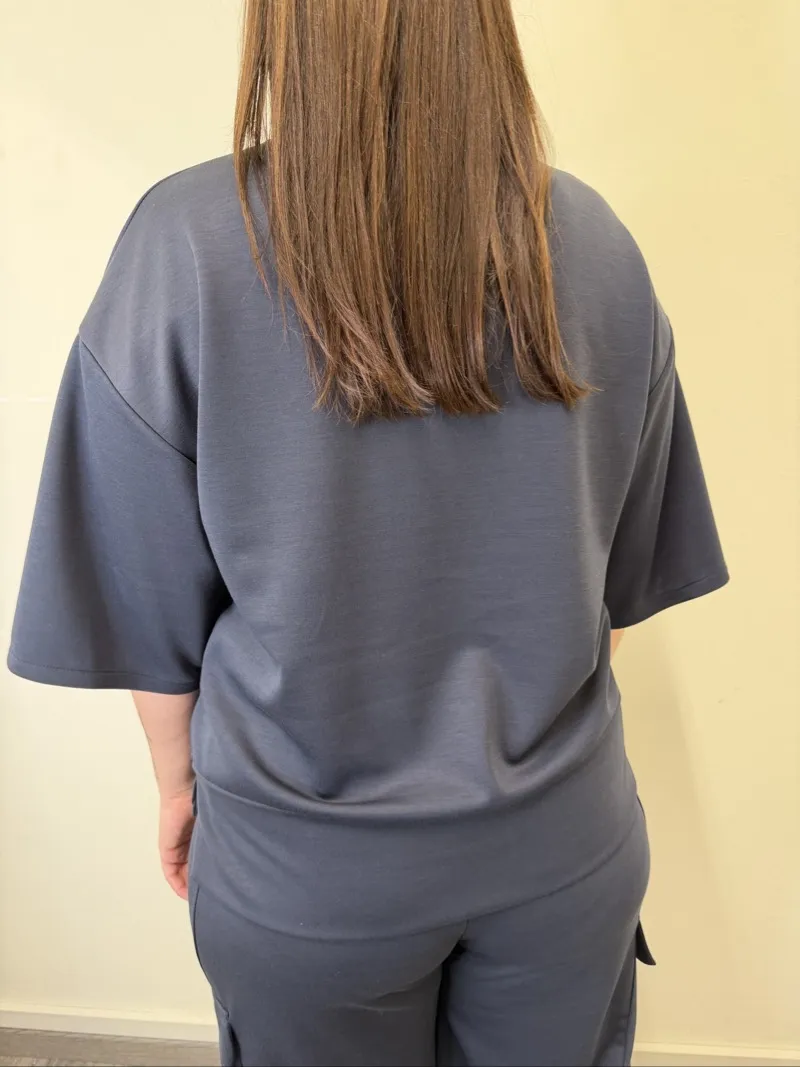 maglia cubetto girocollo, mezza manica e spacchetti laterali la modella è alta 170cm. e indossa la taglia 1