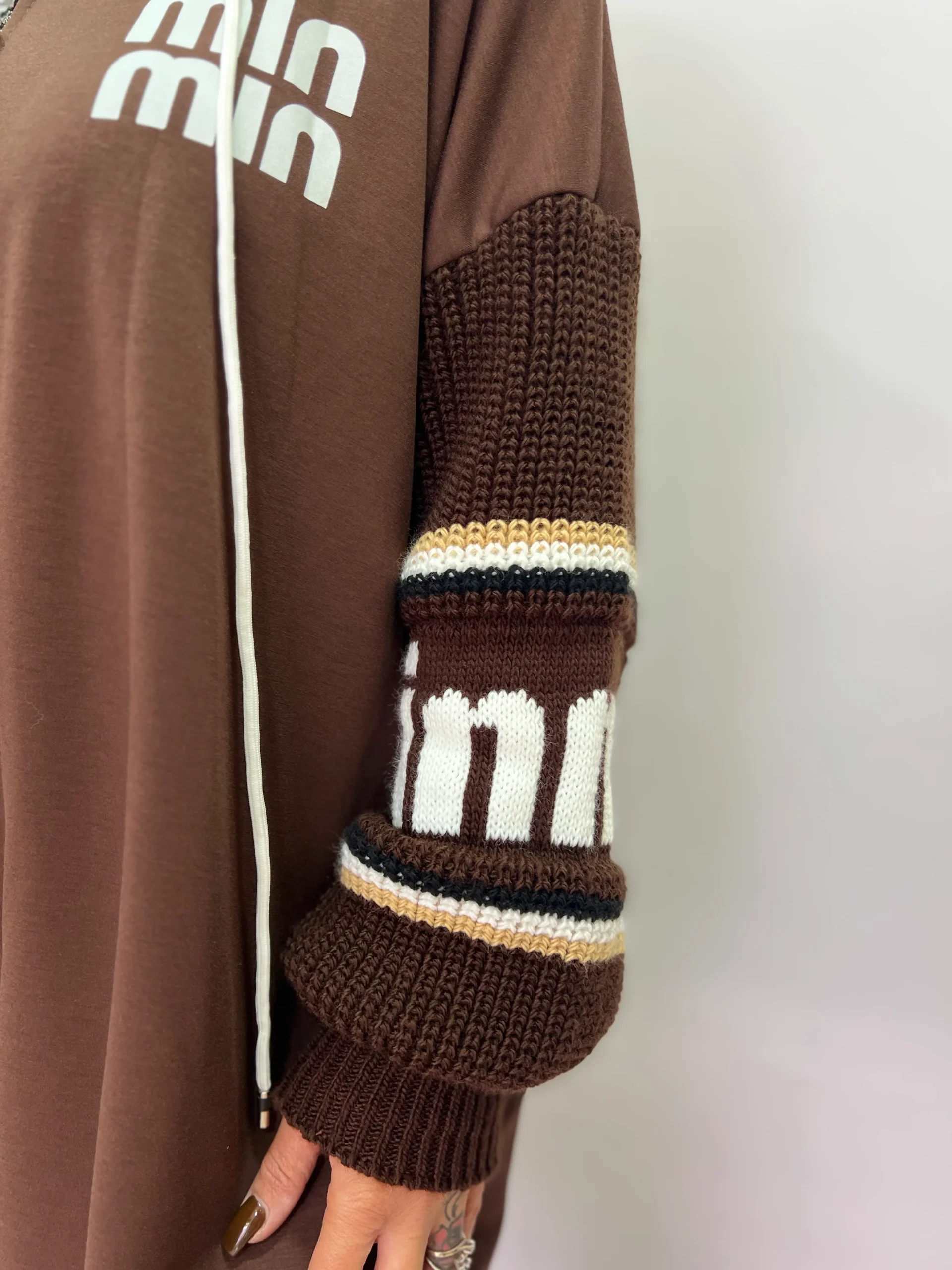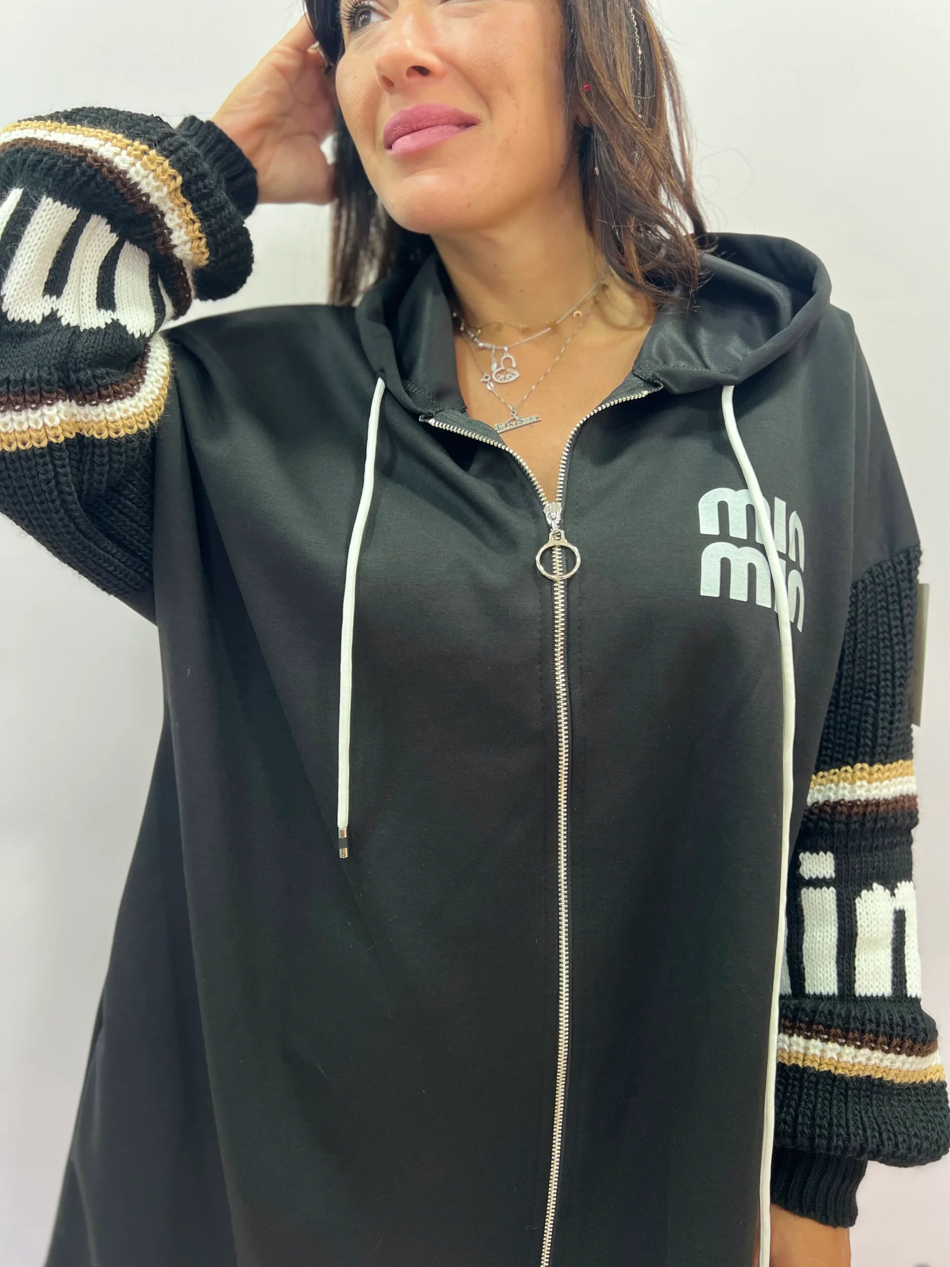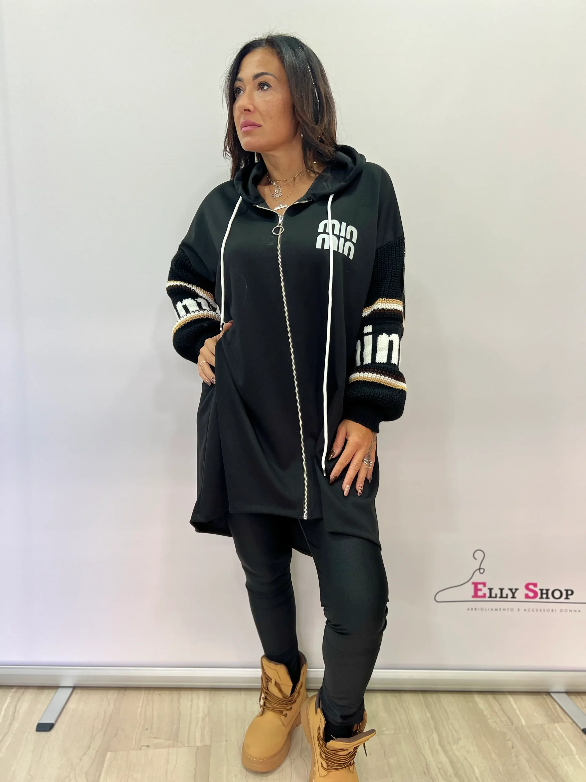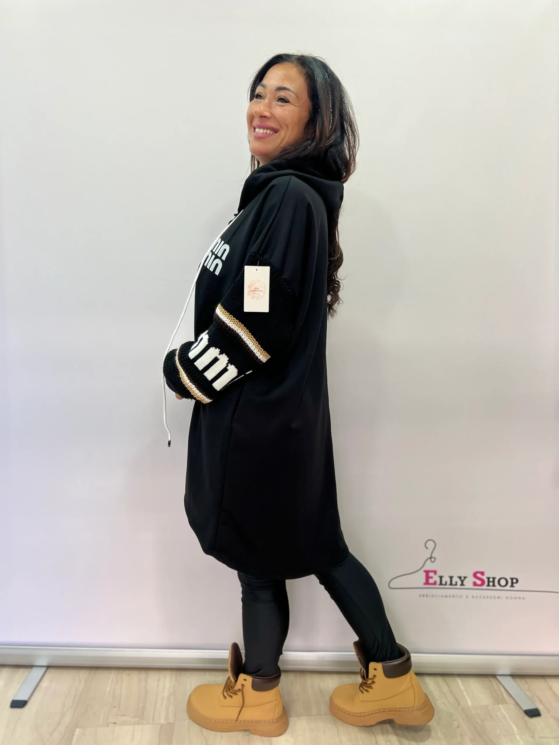 Felpa lunga curvy con cappuccio e maniche a maglia