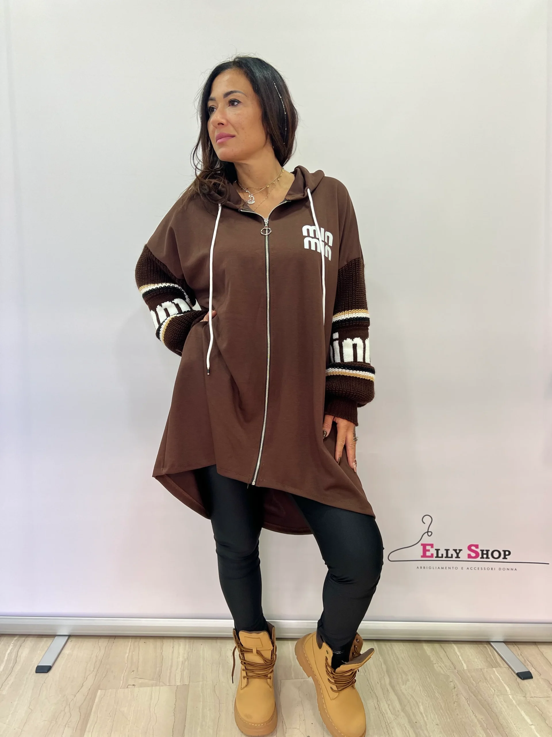 Felpa lunga donna curvy dal taglio asimmetrico e moderno, perfetta per un look casual e contemporaneo. Il modello presenta cappuccio con coulisse, chiusura frontale con zip e maniche lunghe lavorate a maglia con dettagli a contrasto che donano carattere e originalitร . La lunghezza posteriore leggermente piรน estesa valorizza la figura e offre maggiore comfort. Ideale da abbinare a leggings o pantaloni slim per outfit pratici e di tendenza. Disponibile nei colori marrone e nero.