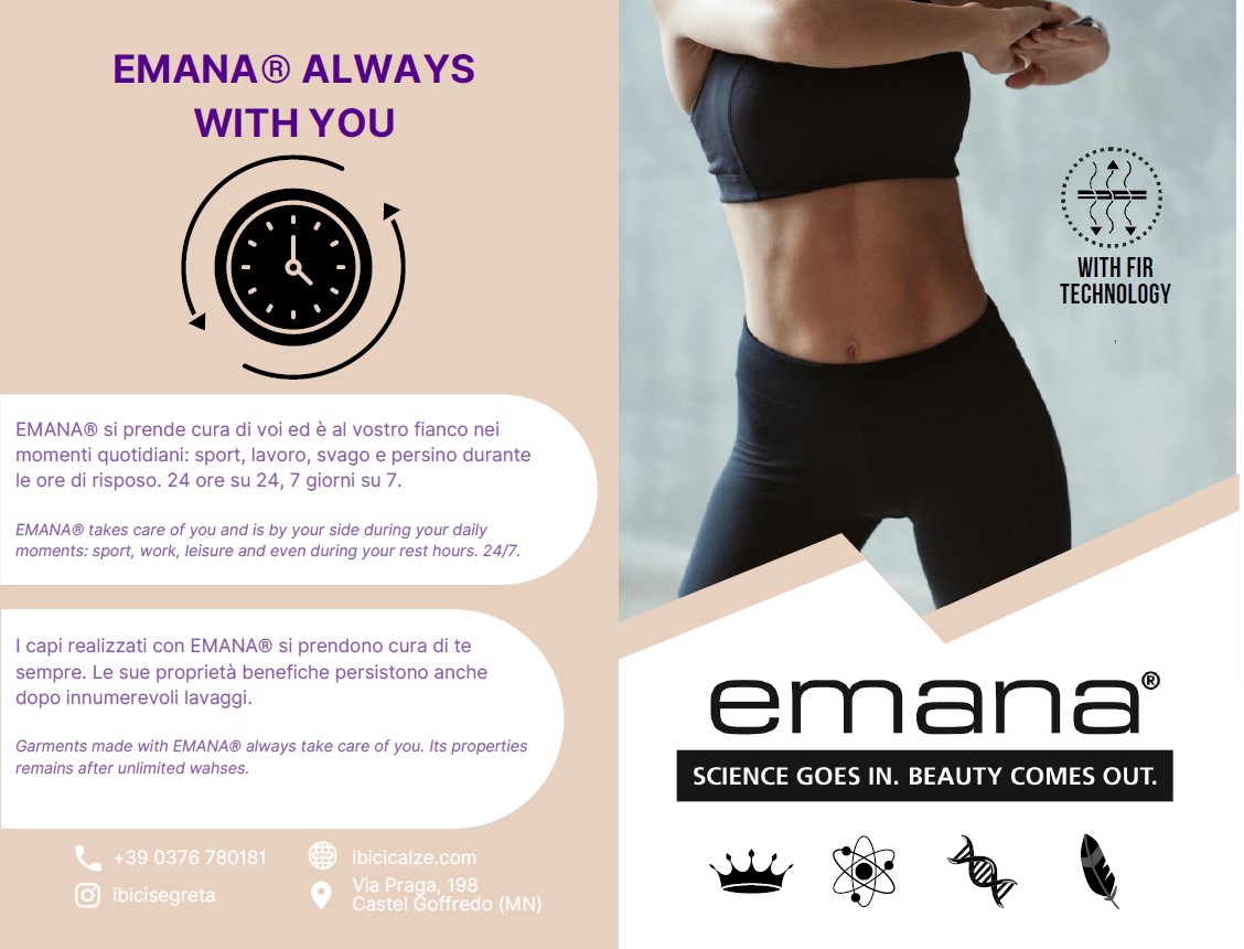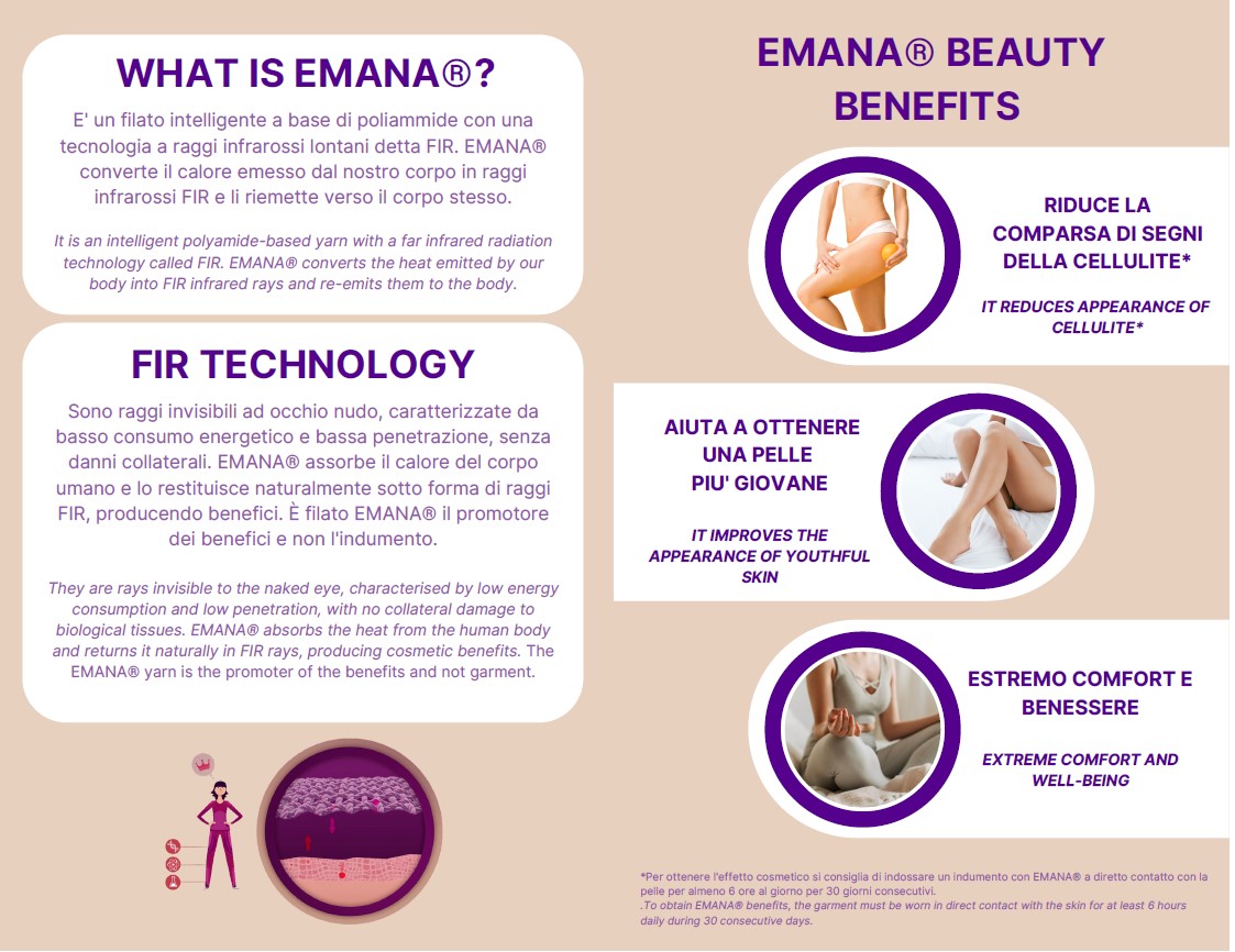 COS’E’ EMANA®? E’ un filato intelligente a base di poliammide con una tecnologia a raggi infrarossi lontani detta FIR. EMANA® converte il calore emesso dal nostro corpo in raggi infrarossi FIR e li riemette verso il corpo stesso.