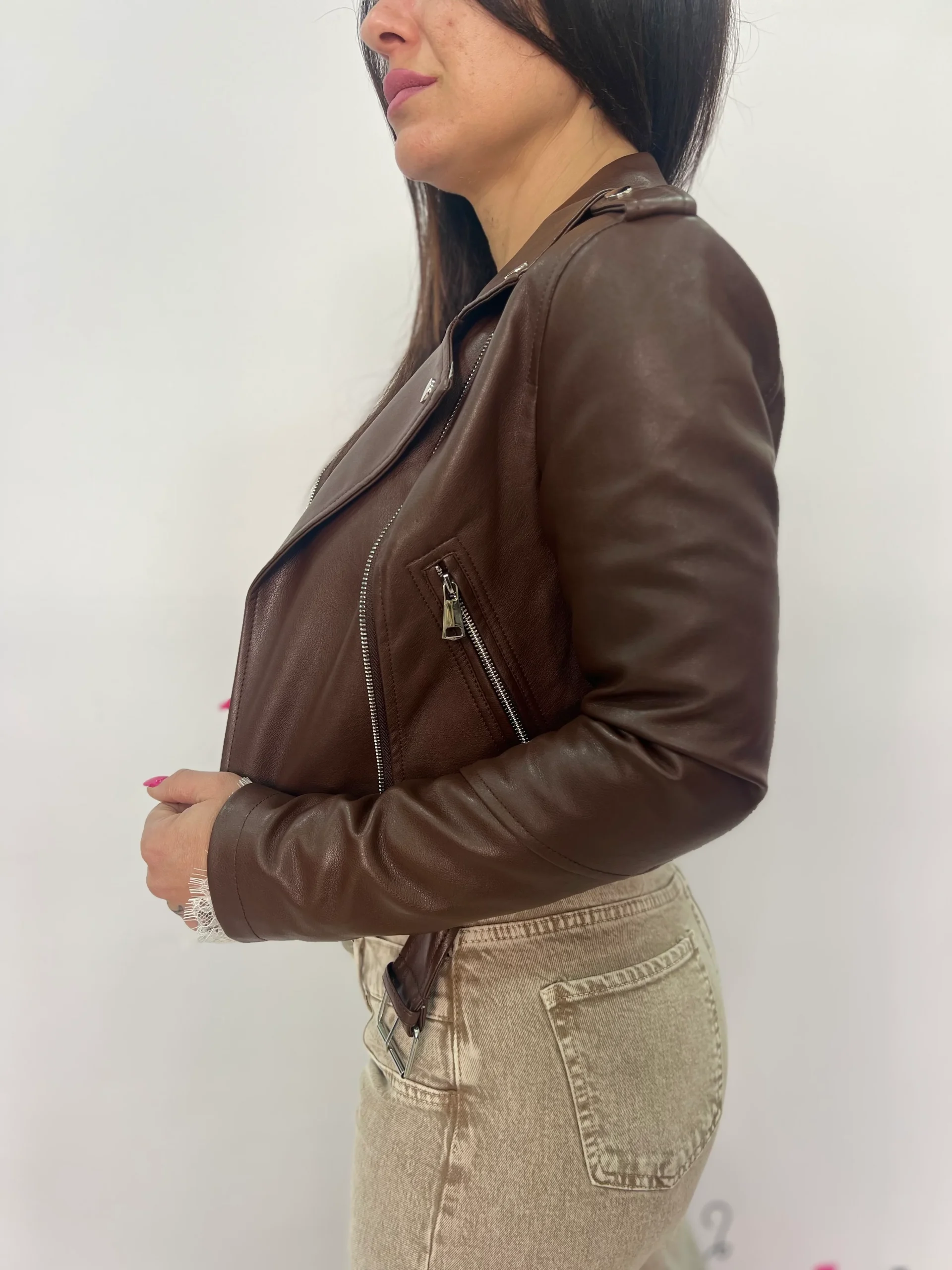 Giacca biker donna dal carattere deciso e contemporaneo, perfetta per completare look casual e urban con un tocco grintoso e femminile. Il taglio leggermente corto valorizza la silhouette, mentre la linea aderente esalta le forme senza rinunciare al comfort. Dotata di zip asimmetrica frontale, tasche con chiusura zip e cintura regolabile in vita, è il capo ideale da abbinare a jeans, abiti o gonne per outfit versatili da giorno e da sera. Disponibile nelle eleganti varianti marrone e verde scuro, tonalità facilmente abbinabili per la stagione Autunno/Inverno. Vestibilità regolare.
