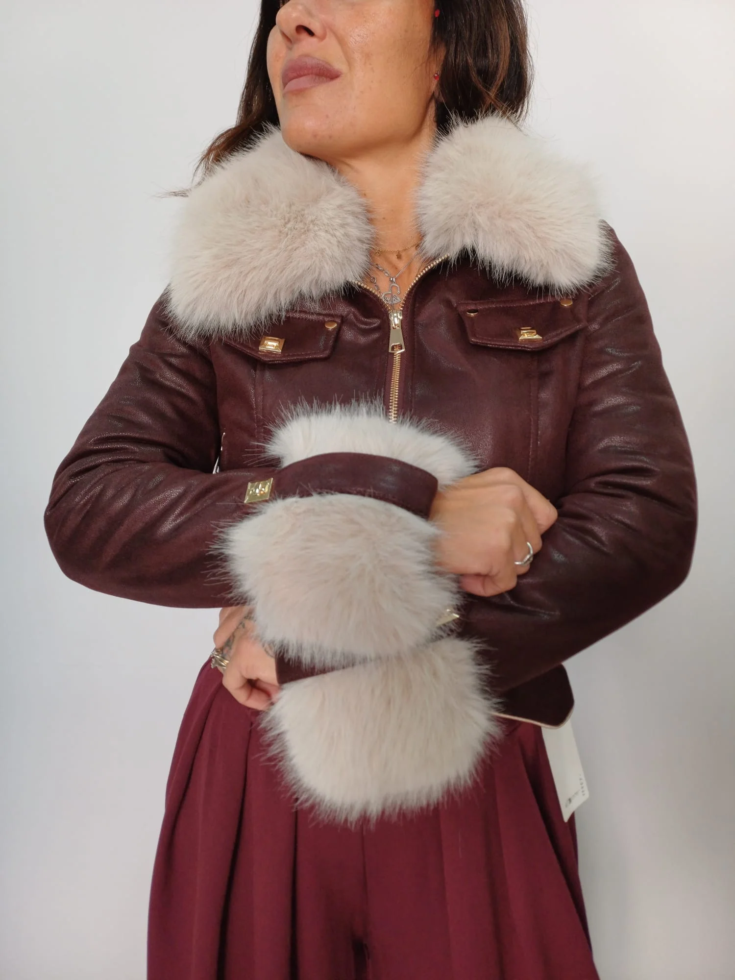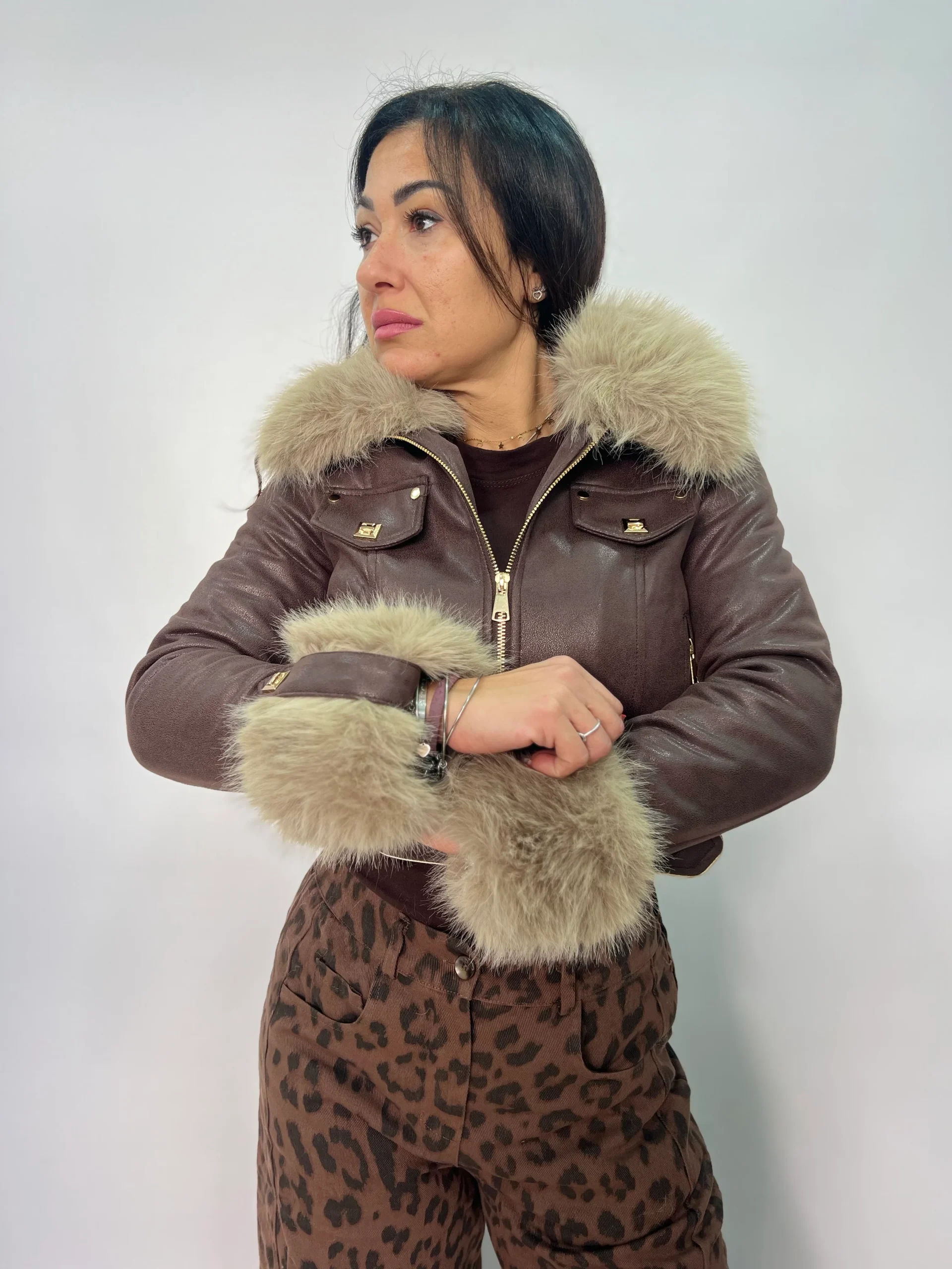 Giacca corta effetto pelle con pelliccia donna