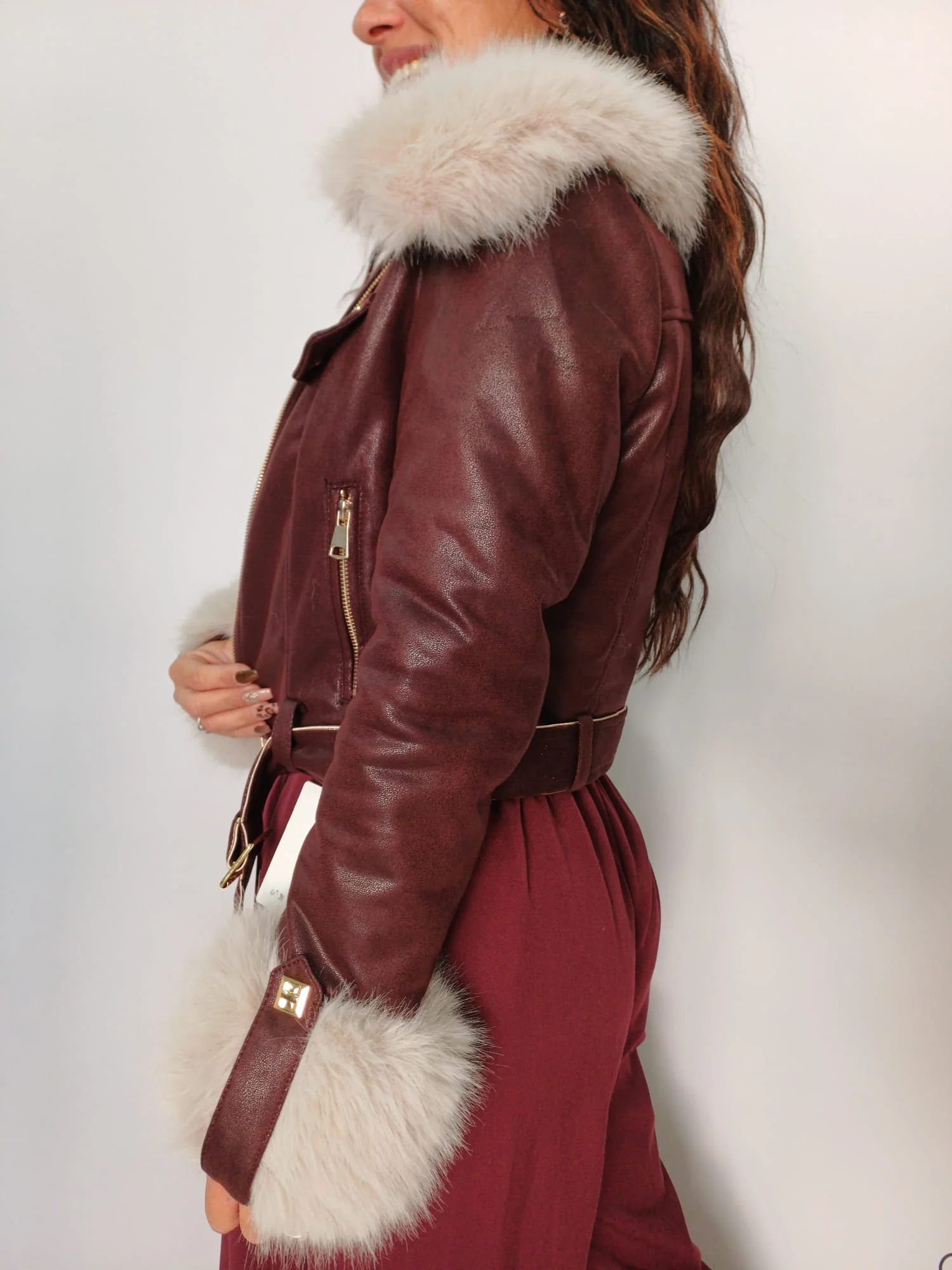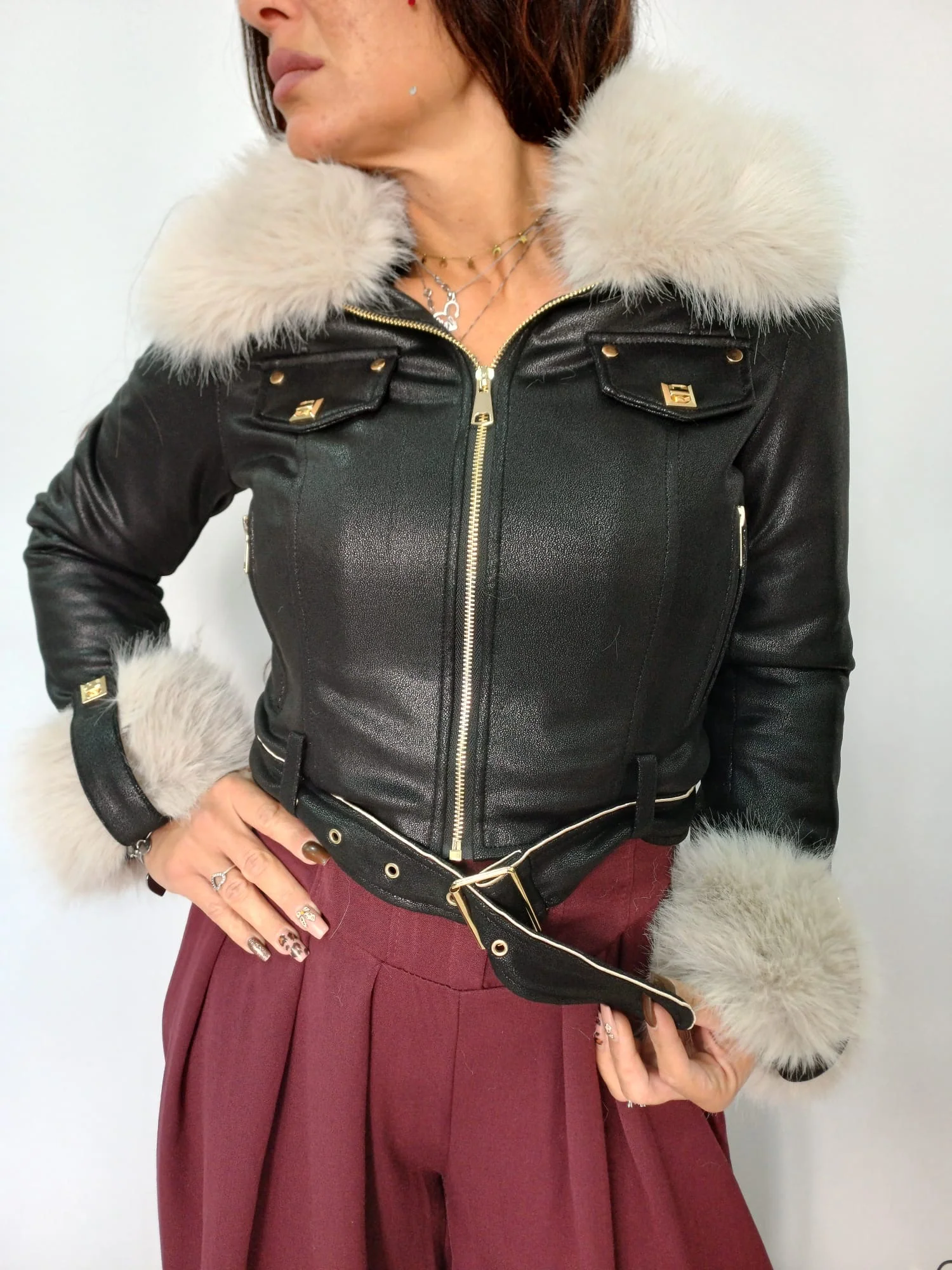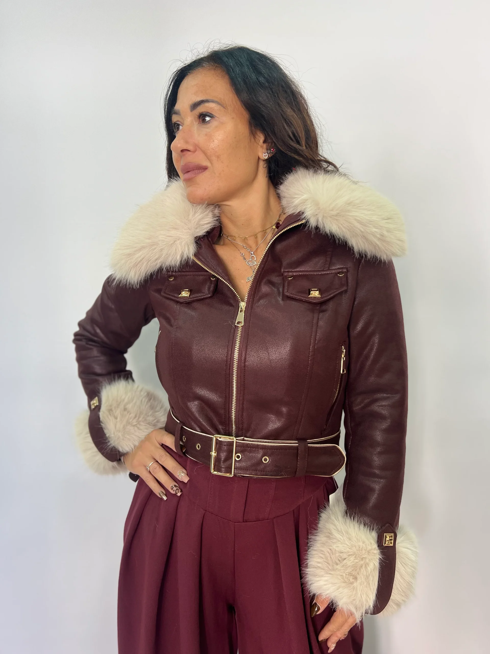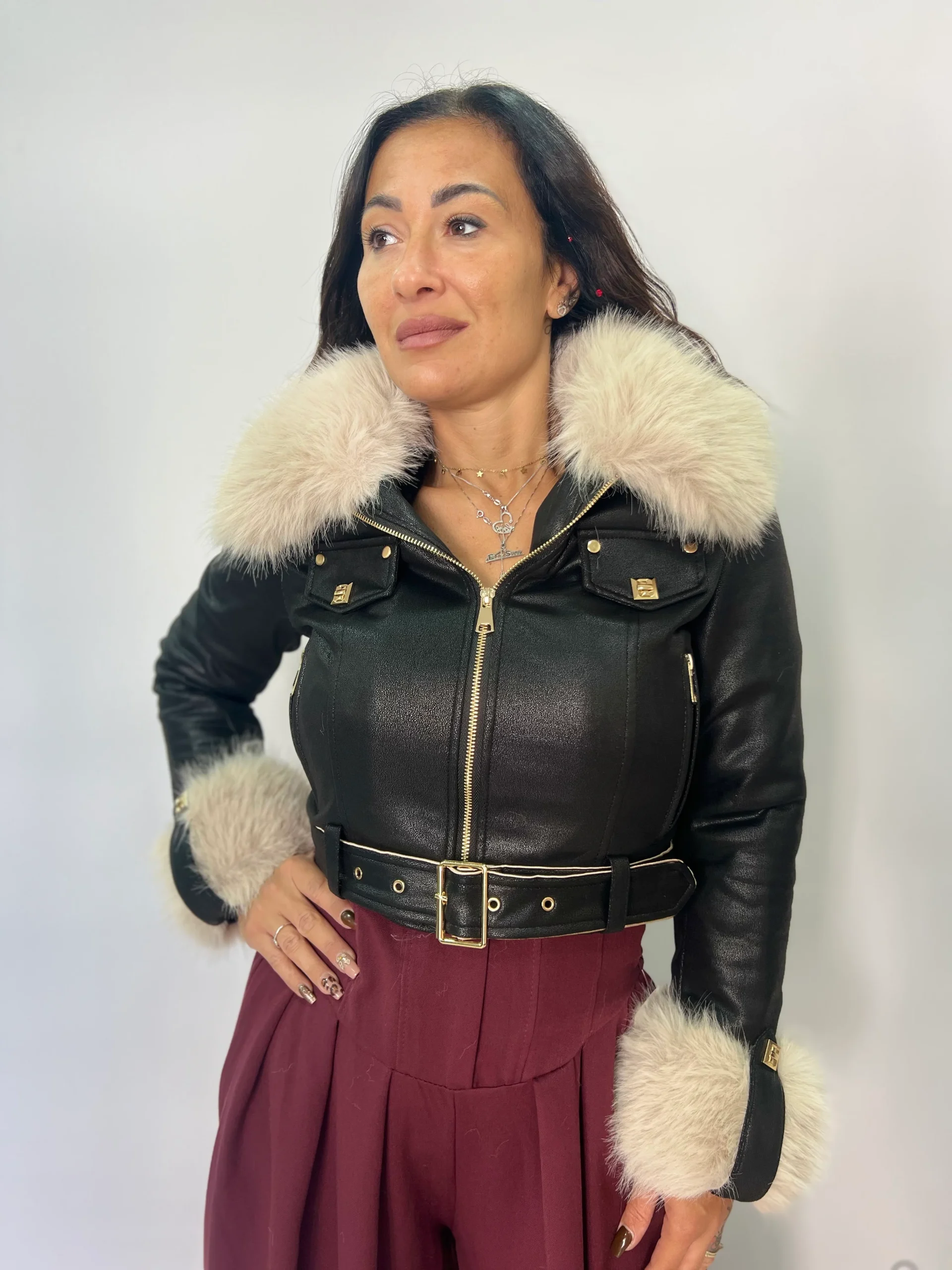 Giacca elegante e dal carattere deciso, realizzata in morbido materiale effetto pelle con dettagli in pelliccia ecologica su collo e polsini. Il taglio corto valorizza la silhouette, mentre la cintura in vita con fibbia dorata definisce le forme con un tocco sofisticato. Le tasche frontali con patta e zip dorata aggiungono un accento moderno e ricercato. Perfetta per look urbani o serate invernali, รจ disponibile nei colori bordeaux e nero, ideali per aggiungere personalitร e stile ai tuoi outfit stagionali. Articolo S6685