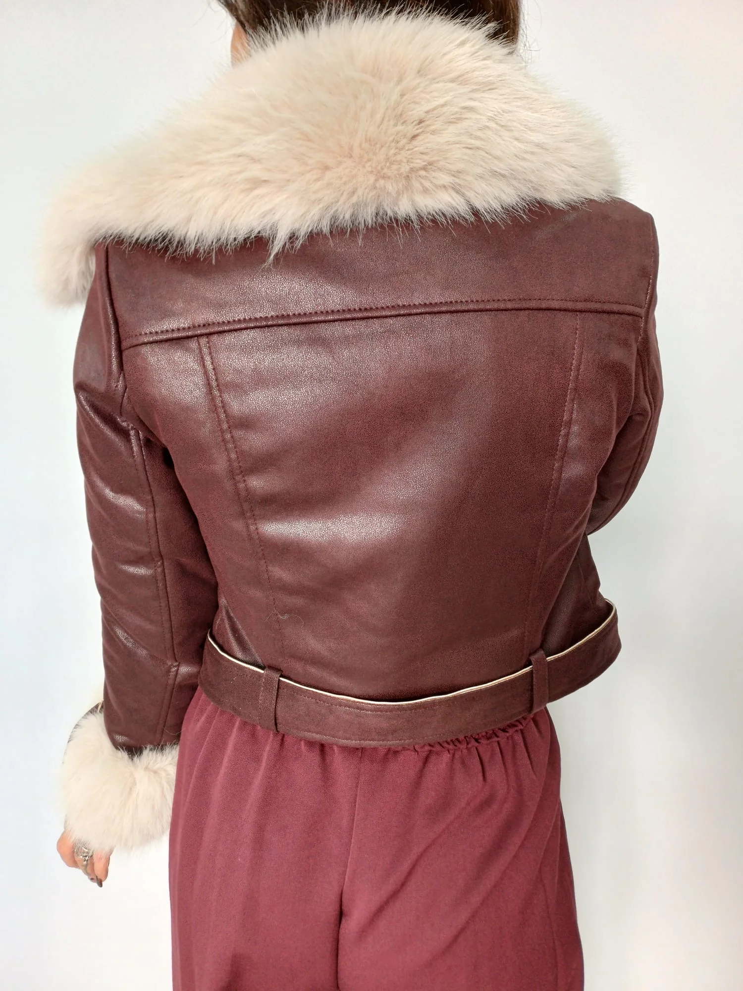 Giacca corta effetto pelle con cintura e inserti in pelliccia