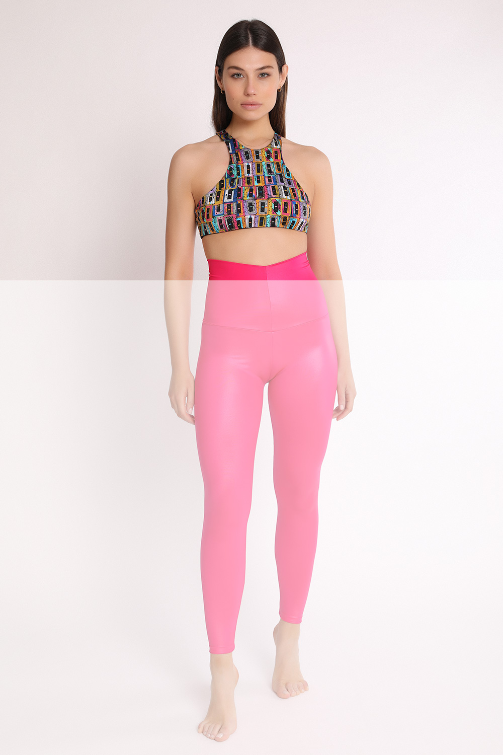 Halter neck top, fully lined with Lycra for optimal support. The soft and silky fabric, is a perfect synthesis of lightness and elasticity. The multi-coloured cassette tapes print and the grunge effect, evokes 80’s pop,  for an original, playful, and sophisticated look.
