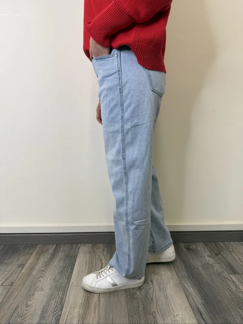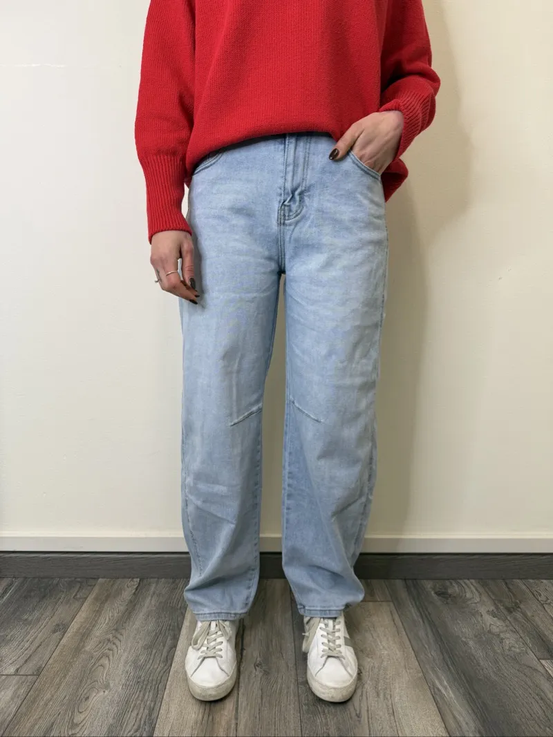Jeans fit ballon chiaro elasticizzato leggero veste fino alla taglia 52. La modella è alta 170cm e veste la taglia 42