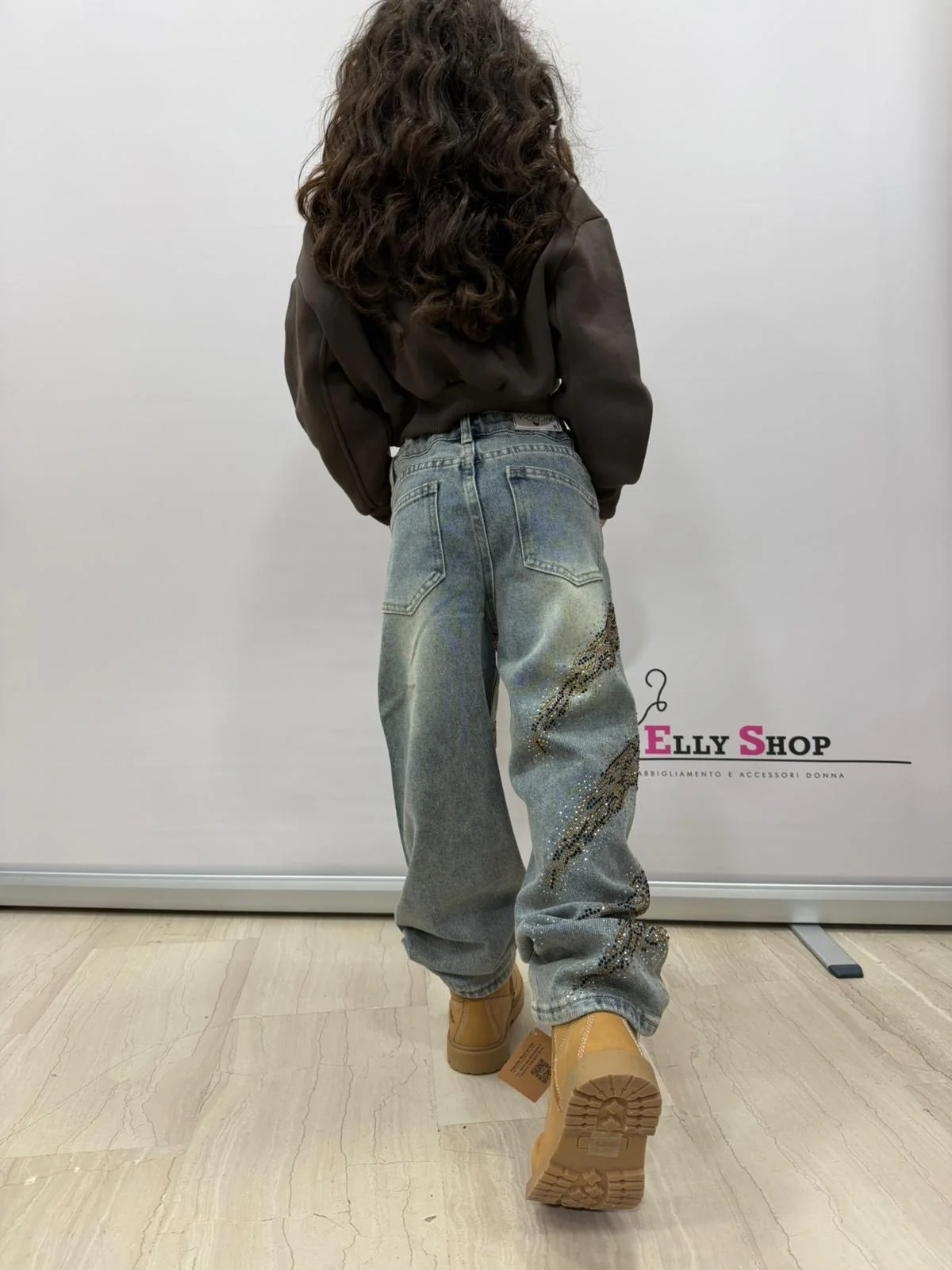 Dettaglio: Modello denim con decorazioni glitterate e tasche frontali e posteriori