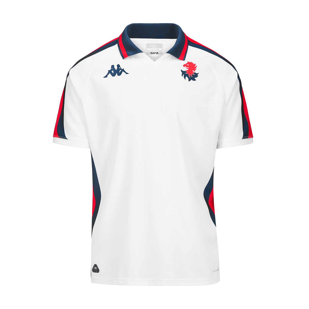 La maglia si distingue per il suo design elegante: รจ prevalentemente bianca, con dettagli in rosso e blu lungo le spalle e i fianchi. Il tema dominante รจ il celebre โ€œGallinaccioโ€, che torna a campeggiare su una divisa ufficiale del Genoa CFC dopo oltre 40 anni. Questo stemma, tra i piรน popolari nella storia del Club, venne utilizzato sulle divise a inizio anni Ottanta e, da allora, รจ stato โ€œadottatoโ€ a furor di popolo dai supporter che lo sfoggiano su caschi, bandiere, sciarpe, adesivi e murales. Lo stemma rappresenta una delle molteplici incarnazioni artistiche del Grifone, simbolo mitologico del club e della cittร  di Genova, nellโ€™articolazione di una delle sue piรน apprezzate espressioni in forma stilizzata. Sul retro del colletto รจ visibile la scritta elitaria “DALL’INIZIO, PER SEMPRE”.