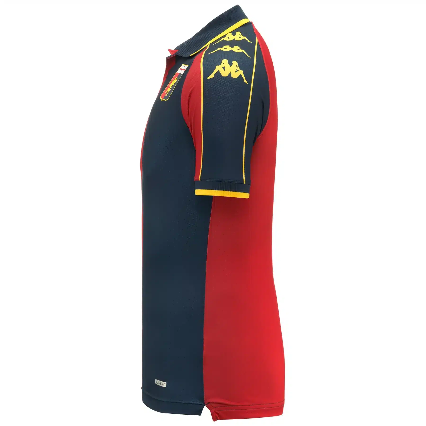 GARA. Maglia gioco KOMBATโข PRO 2024 da uomo in tessuto elasticizzato riciclato e con tecnologia HYDRO-WAY PROTECTION. SKIN FIT. Manica corta, colletto a polo e rib sul fondo manica. Logo Omini sul petto in transfer applicato a caldo, logo Team sul fronte in silicone, banda Omini in stampa sublimatica sulle maniche. GENOA CFC.