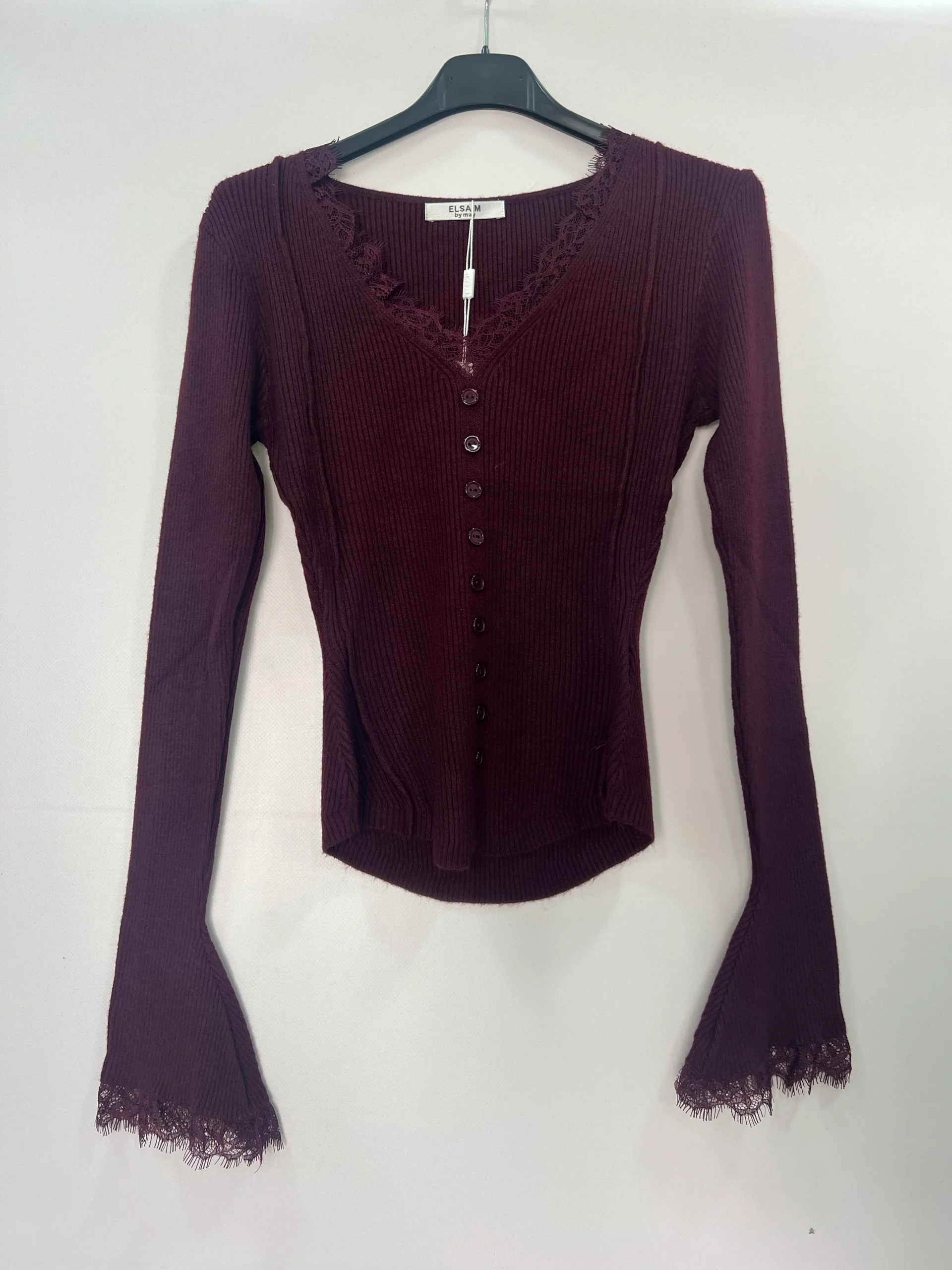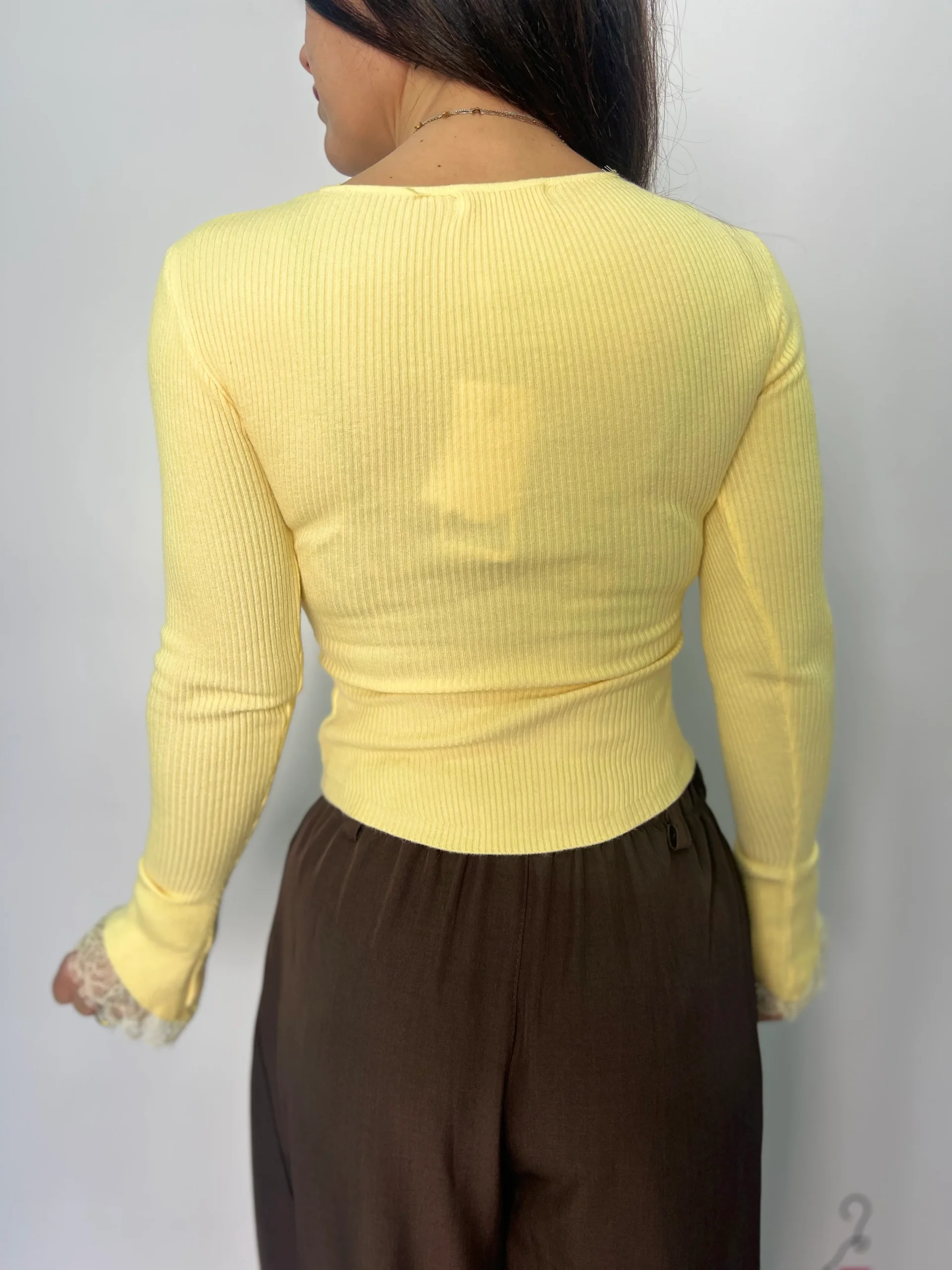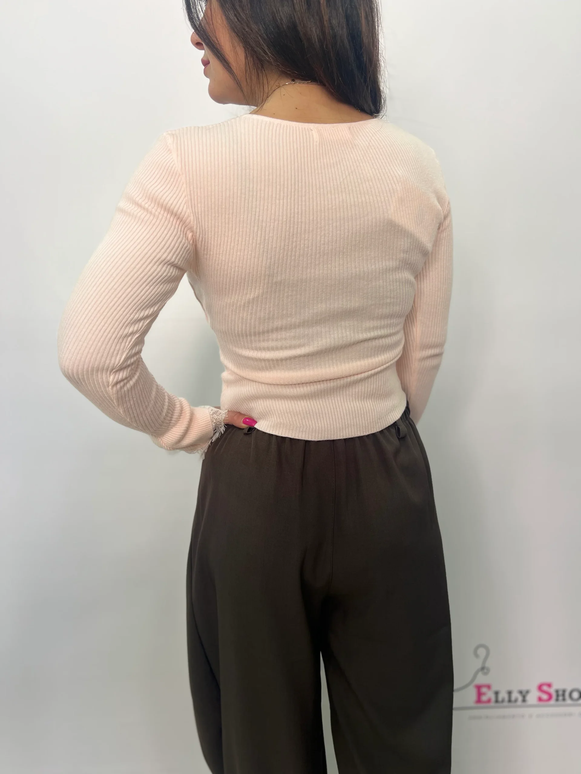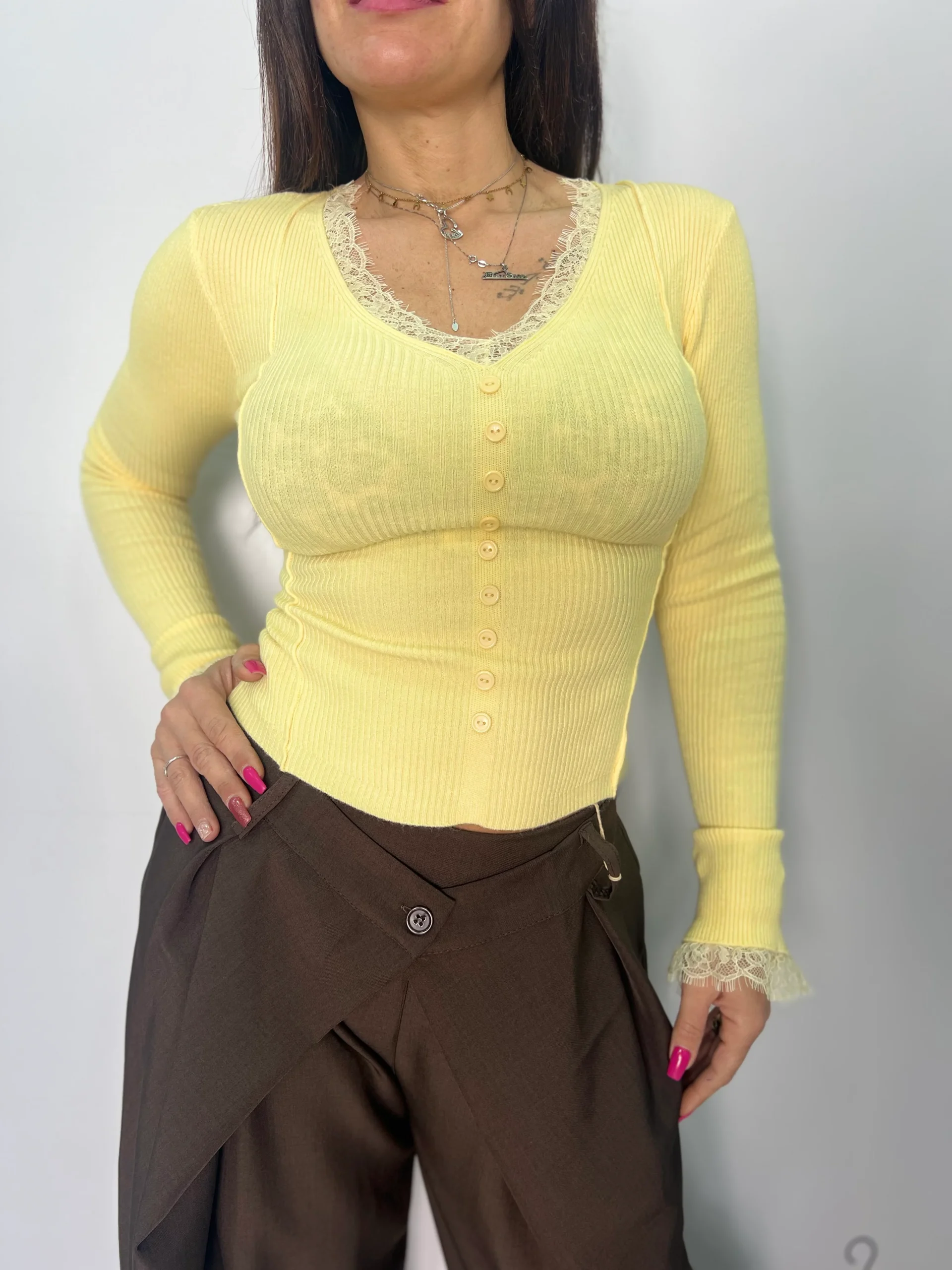 Maglia donna in morbida lavorazione a costine, dal design femminile e raffinato, perfetta per completare look casual chic o outfit più eleganti. Il modello presenta scollo a V impreziosito da delicati dettagli in pizzo tono su tono e una fila di bottoni frontali decorativi che valorizzano il décolleté. Le maniche lunghe leggermente svasate con inserto in pizzo sul fondo donano un tocco romantico e ricercato. Ideale da abbinare a jeans, pantaloni a vita alta o gonne per un look versatile e di tendenza. Disponibile nelle varianti colore bianco, bordeaux, celeste, giallo pastello e rosa cipria. Vestibilità aderente ed elasticizzata.