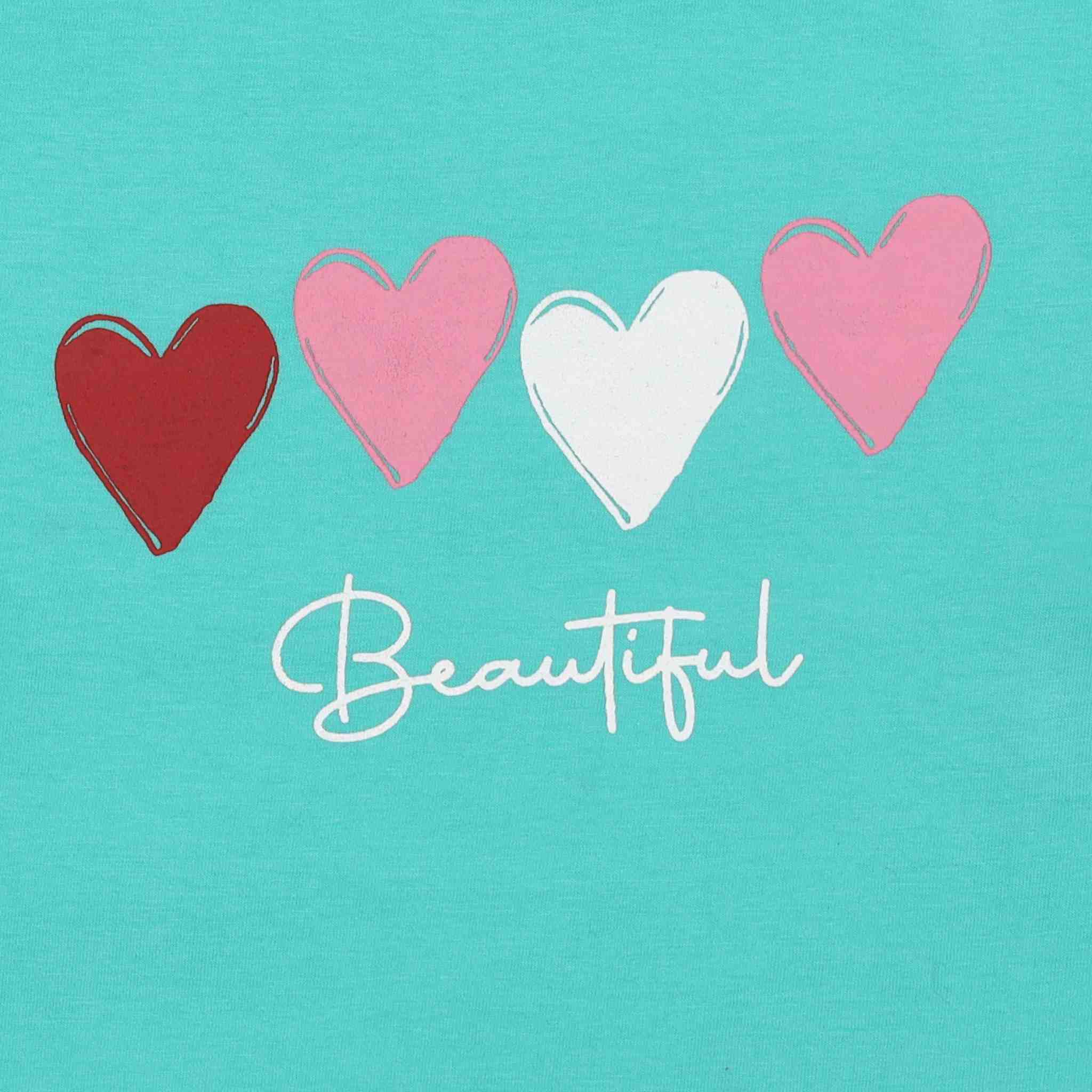 Maglia neonata a manica lunga color Tiffany con cuori colorati e scritta “Beautiful” – dolce, romantica e perfetta per ogni occasione.