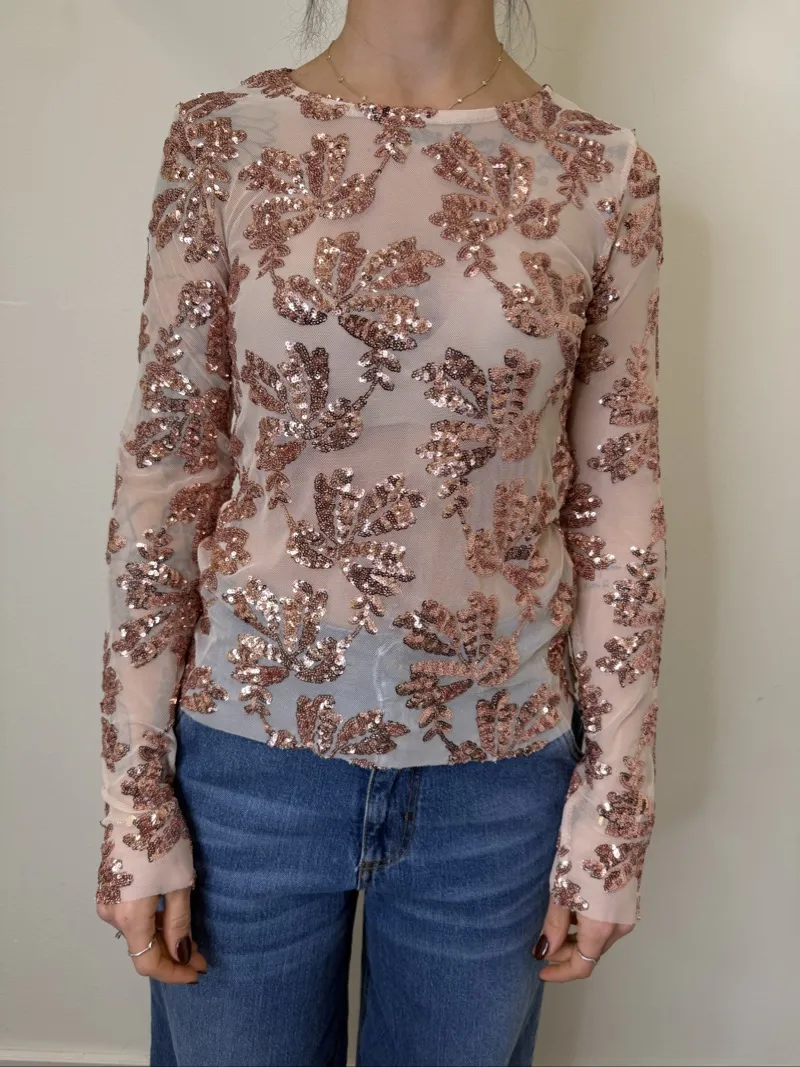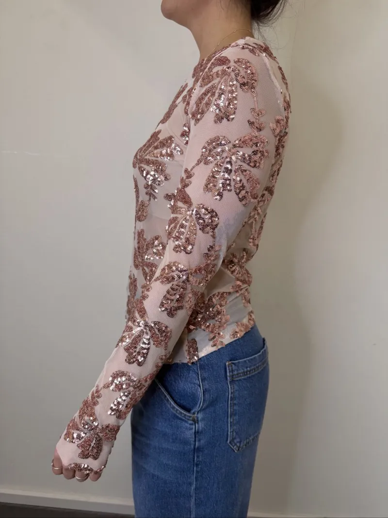 Maglia slim fit in paillettes semi trasparente taglia unica.