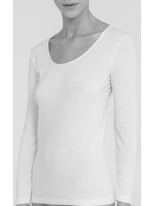 Maglietta donna in lana e cotone. Modello manica lunga. Il piacere del cotone sulla pelle incontra il caldo naturale della lana all’esterno. INDUE: lana fuori e cotone sulla pelle.