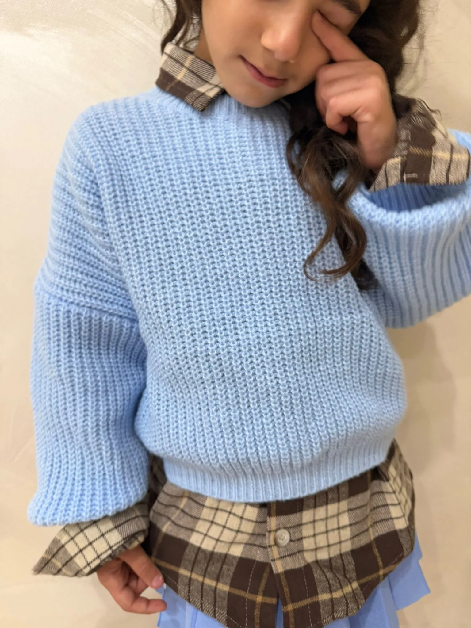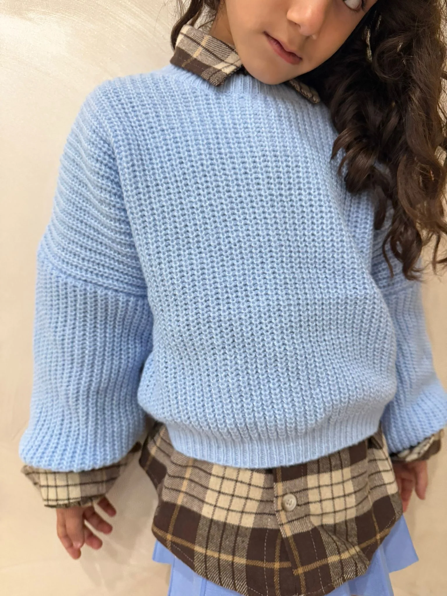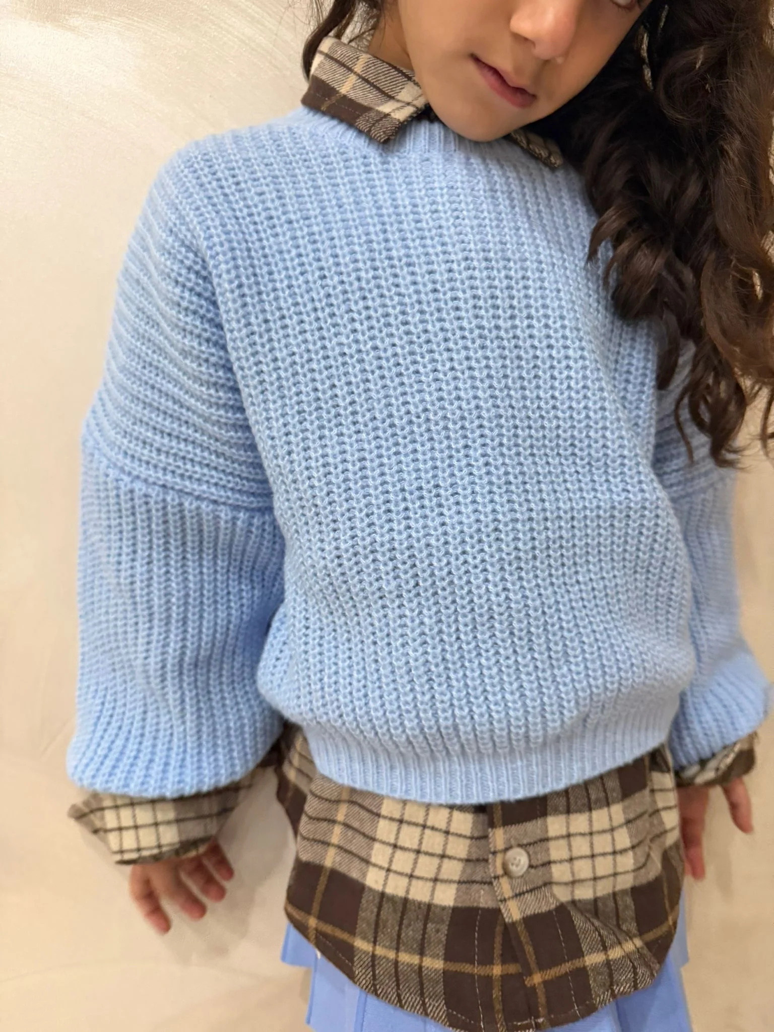 Maglioncino morbido e confortevole dal design semplice e raffinato, perfetto per la stagione autunnale e invernale. Il modello, in un delicato tono polvere, presenta una lavorazione a maglia grossa che garantisce calore e morbidezza, ideale per l’uso quotidiano. La vestibilità leggermente ampia e le maniche comode lo rendono perfetto da indossare sopra camicie o t-shirt, per un look casual e curato. Un capo versatile, ideale per scuola, passeggiate o momenti di relax.