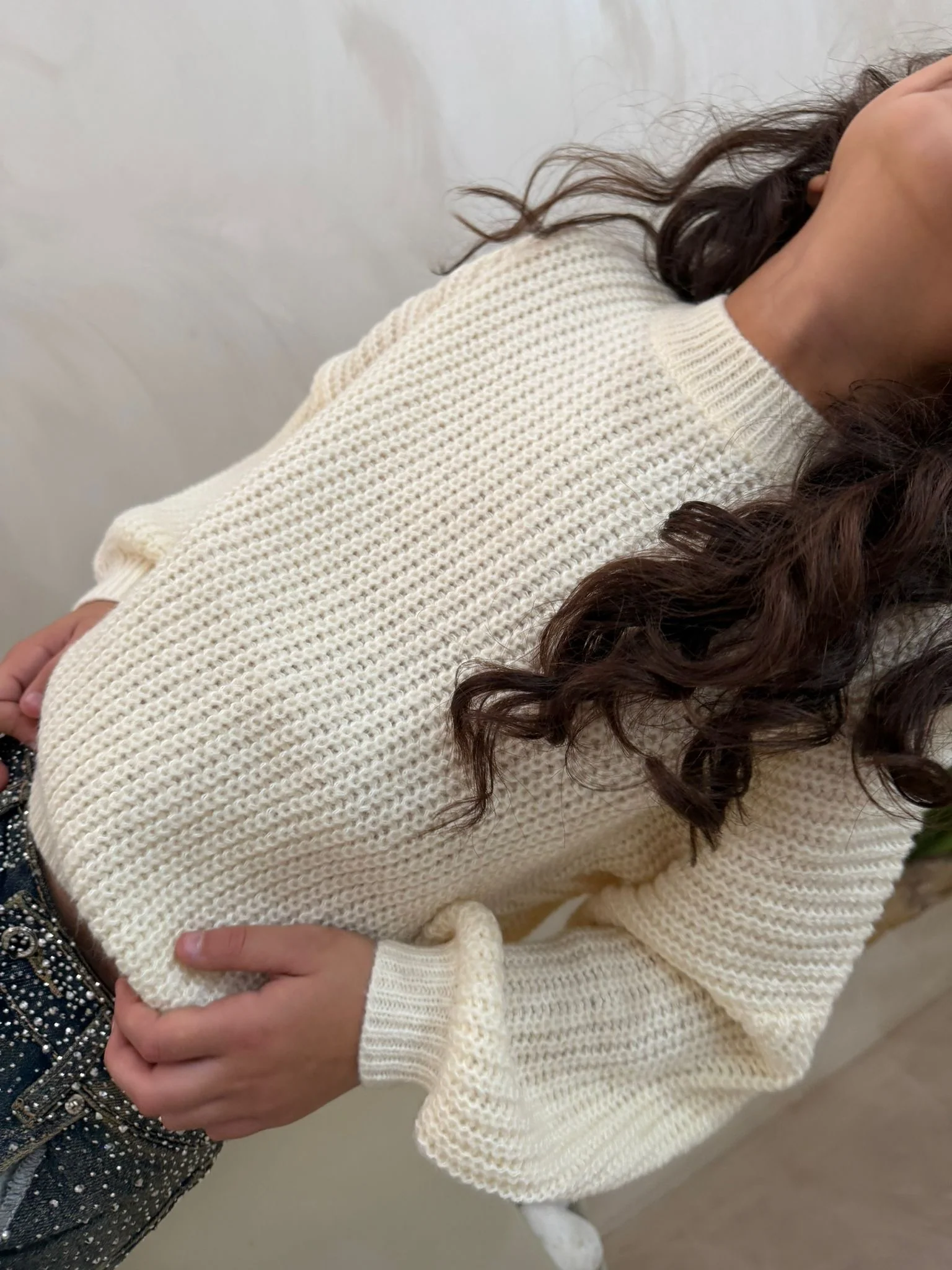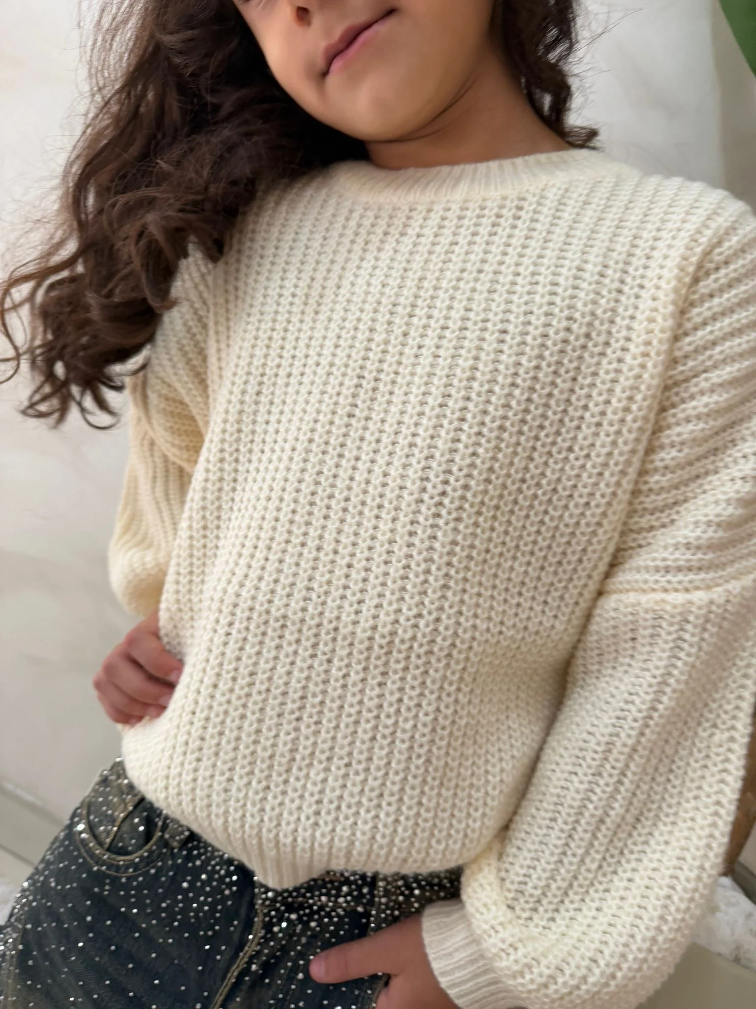 Dettaglio: Modello a maglia grossa con manica lunga e vestibilità morbida