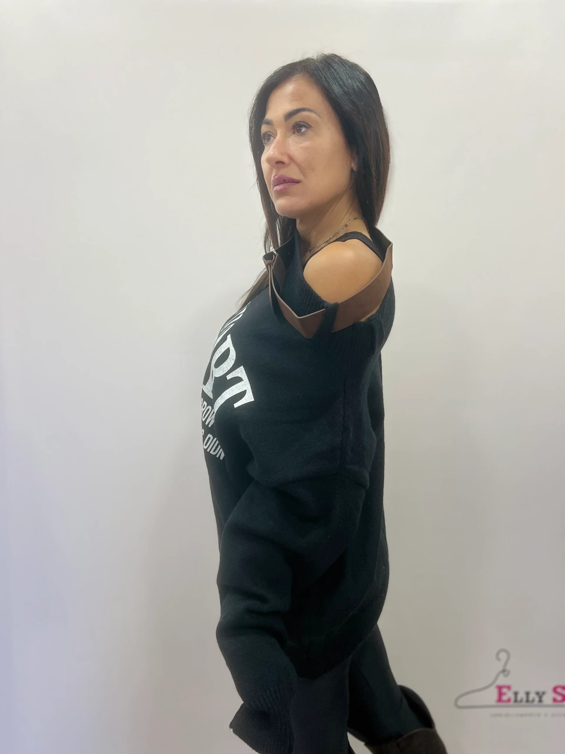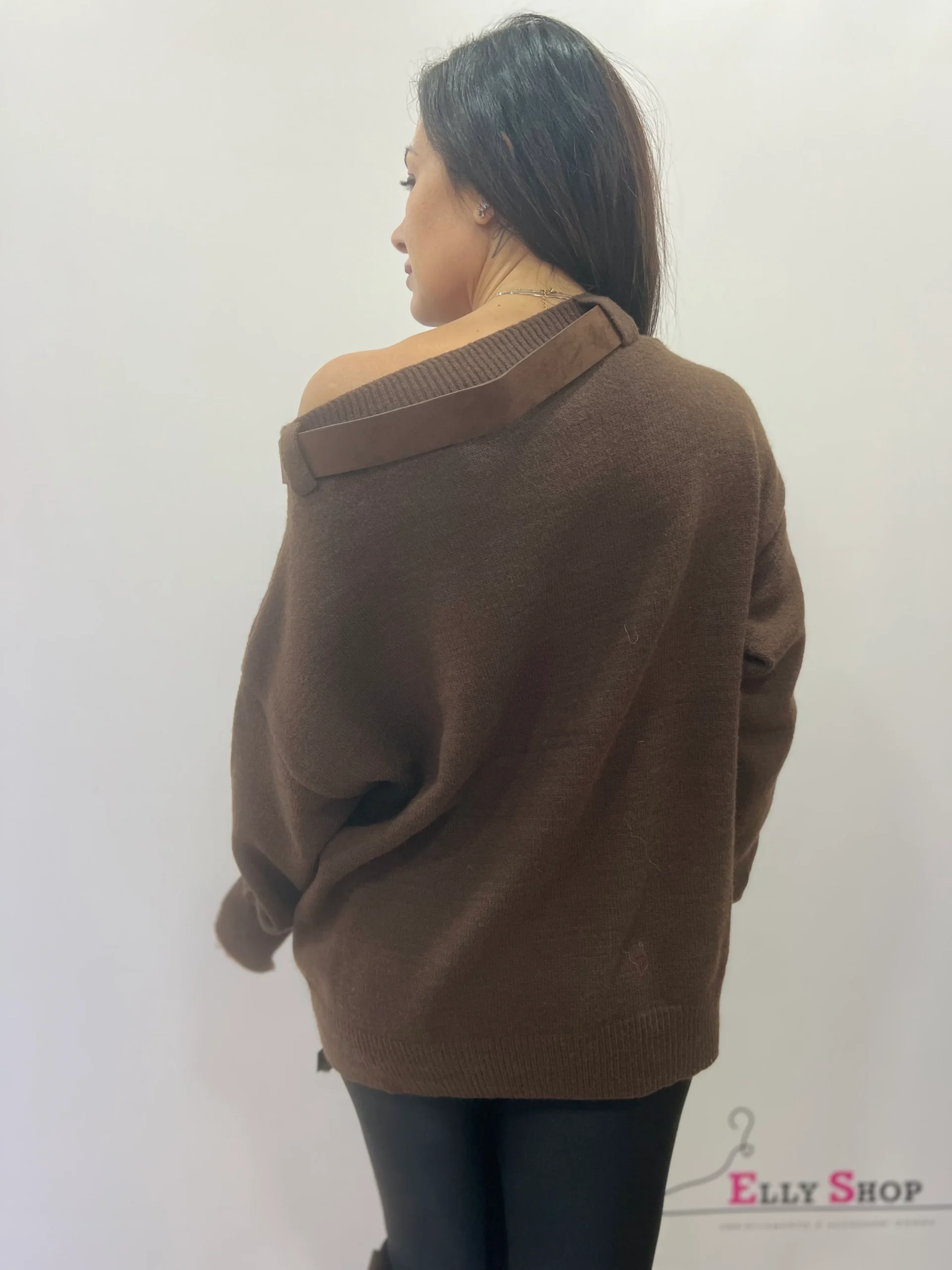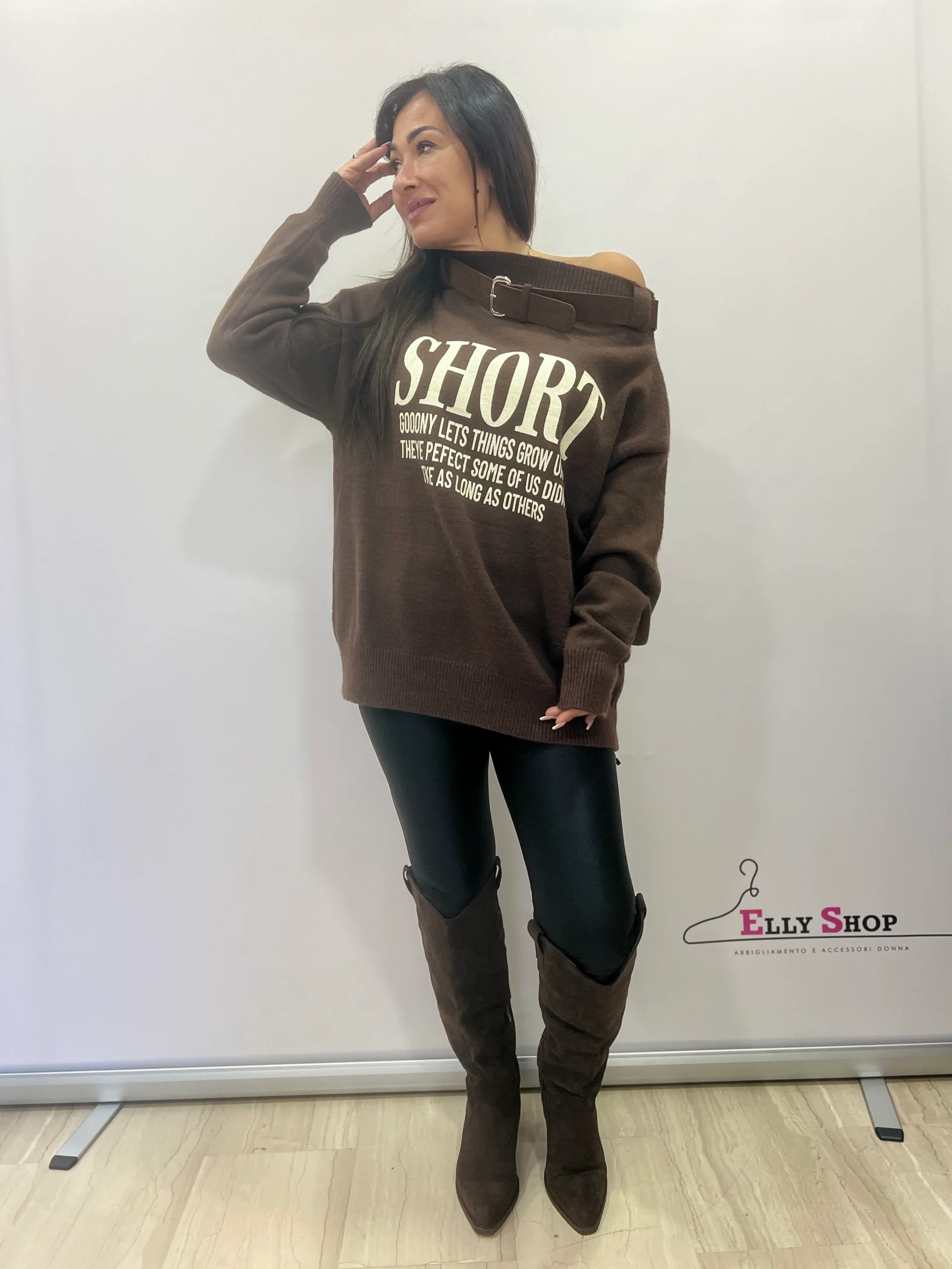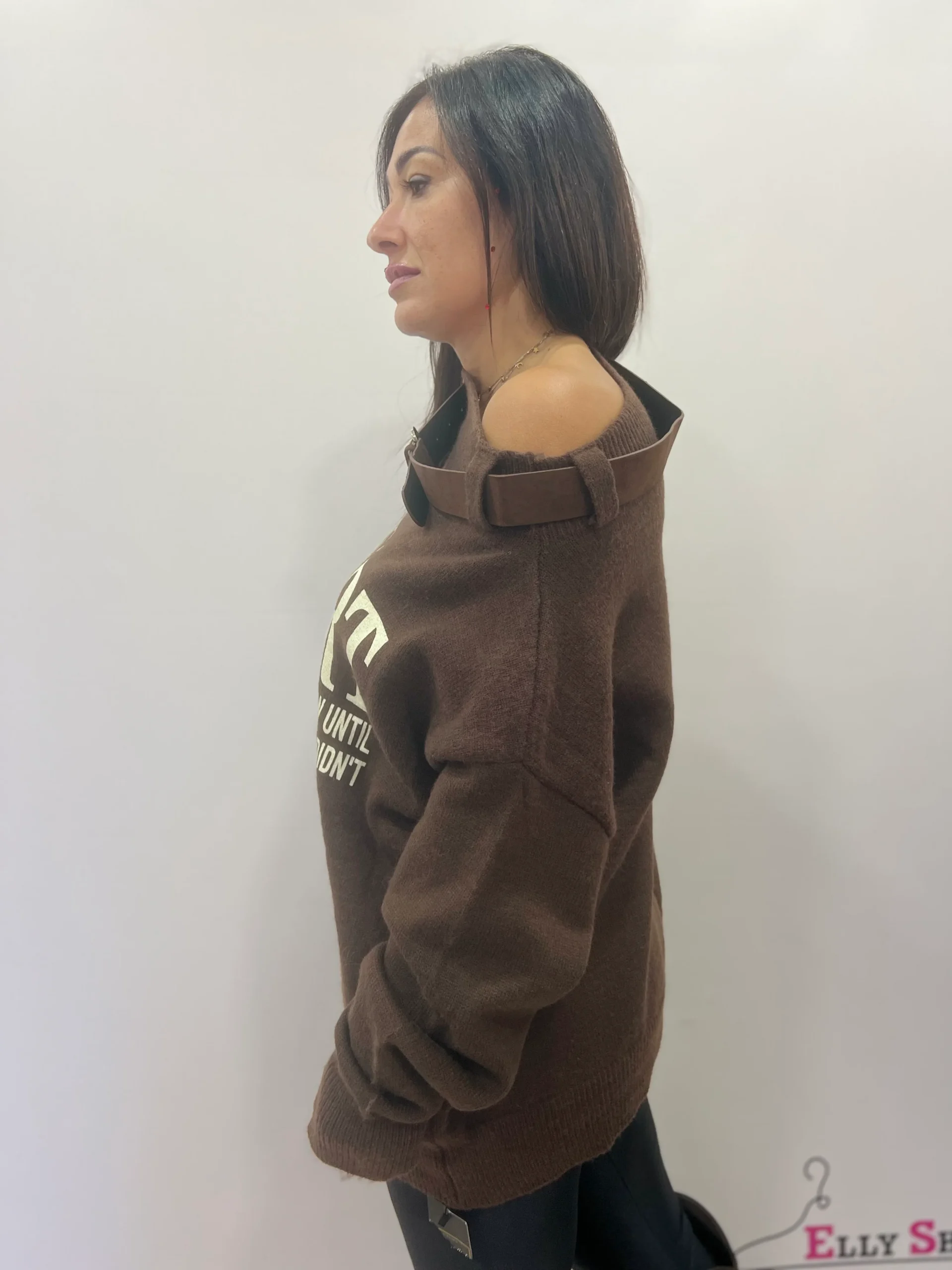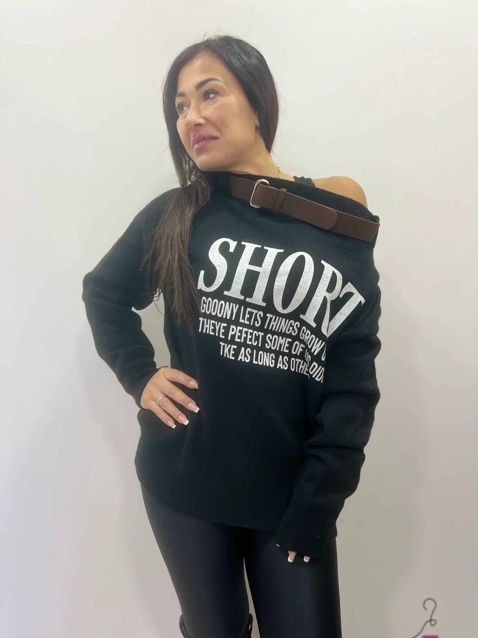 Maglione dal design moderno e urbano, caratterizzato dalla speciale scollatura monospalla regolata da una cintura decorativa che dona un tocco originale e grintoso. La scritta frontale a contrasto aggiunge un mood casual-chic, perfetto per look di tutti i giorni ma anche per outfit piรน ricercati. La vestibilitร รจ morbida e confortevole, ideale da abbinare a leggings, jeans o pantaloni skinny. Disponibile in due varianti colore: marrone e nero.