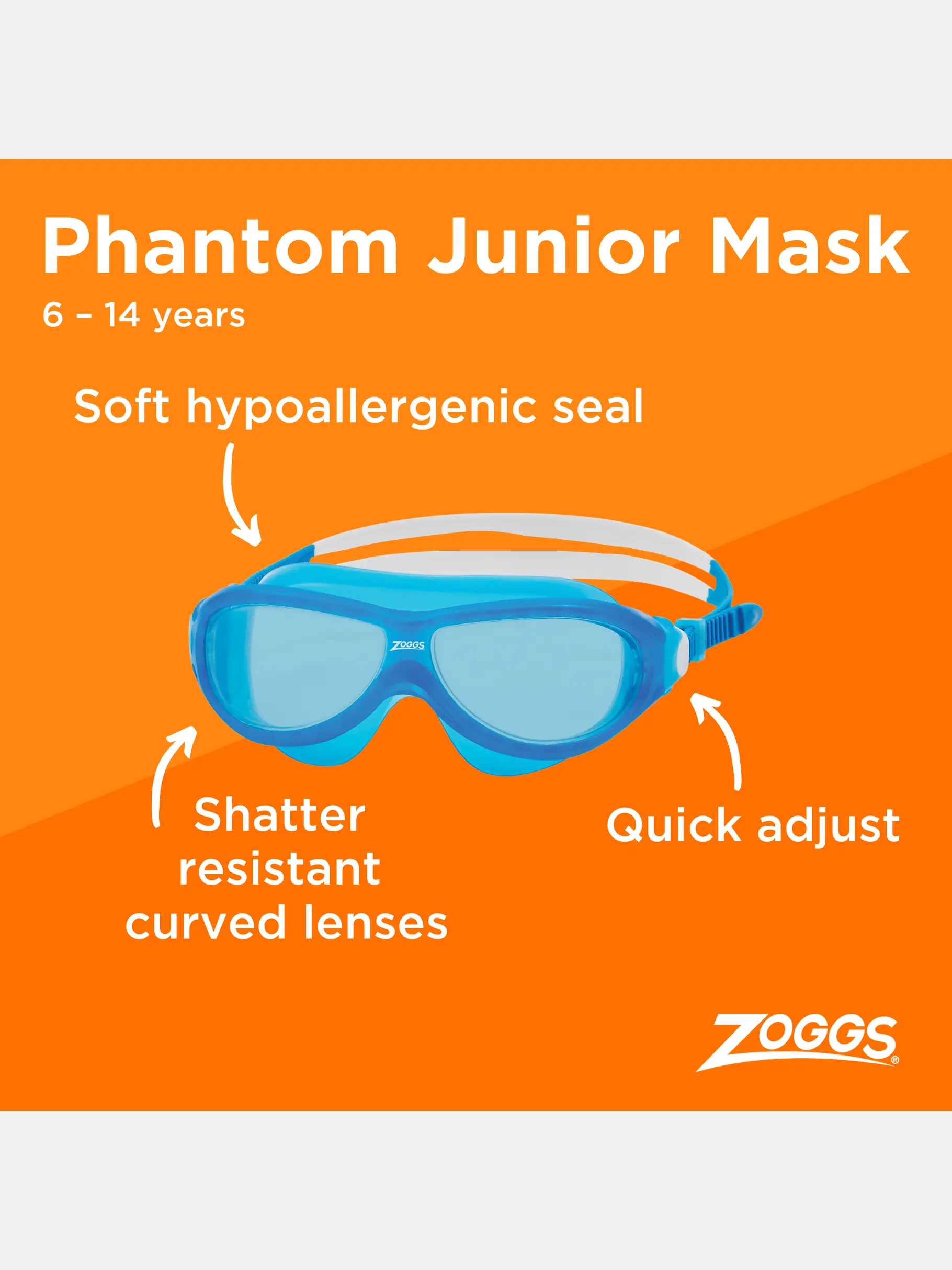 Progettata per bambini dai 6 ai 14 anni, la maschera da nuoto Zoggs Phantom Junior รจ perfetta sia per le vacanze che per le lezioni di nuoto.