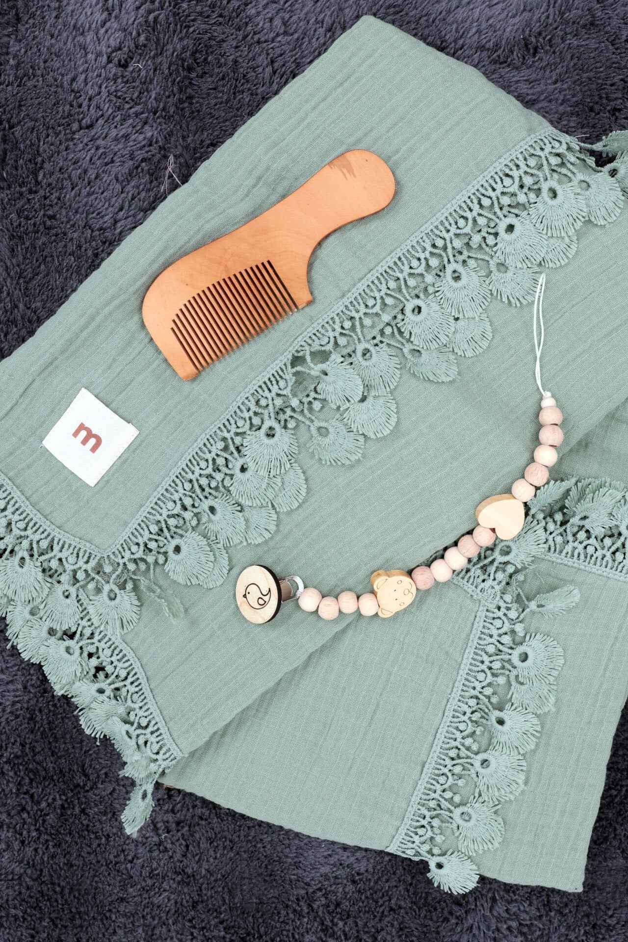 Questo set composto da coperta in mussola di cotone, pettine e portaciuccio in legno naturale, รจ realizzato con cura e pensato appositamente per la tua bambina, rispetta i piรน elevati standard internazionali di qualitร e sicurezza. ร realizzato con materiali privi di sostanze cancerogene, delicati sulla pelle e adatti anche alle pelli piรน sensibili, senza rischio di allergie.