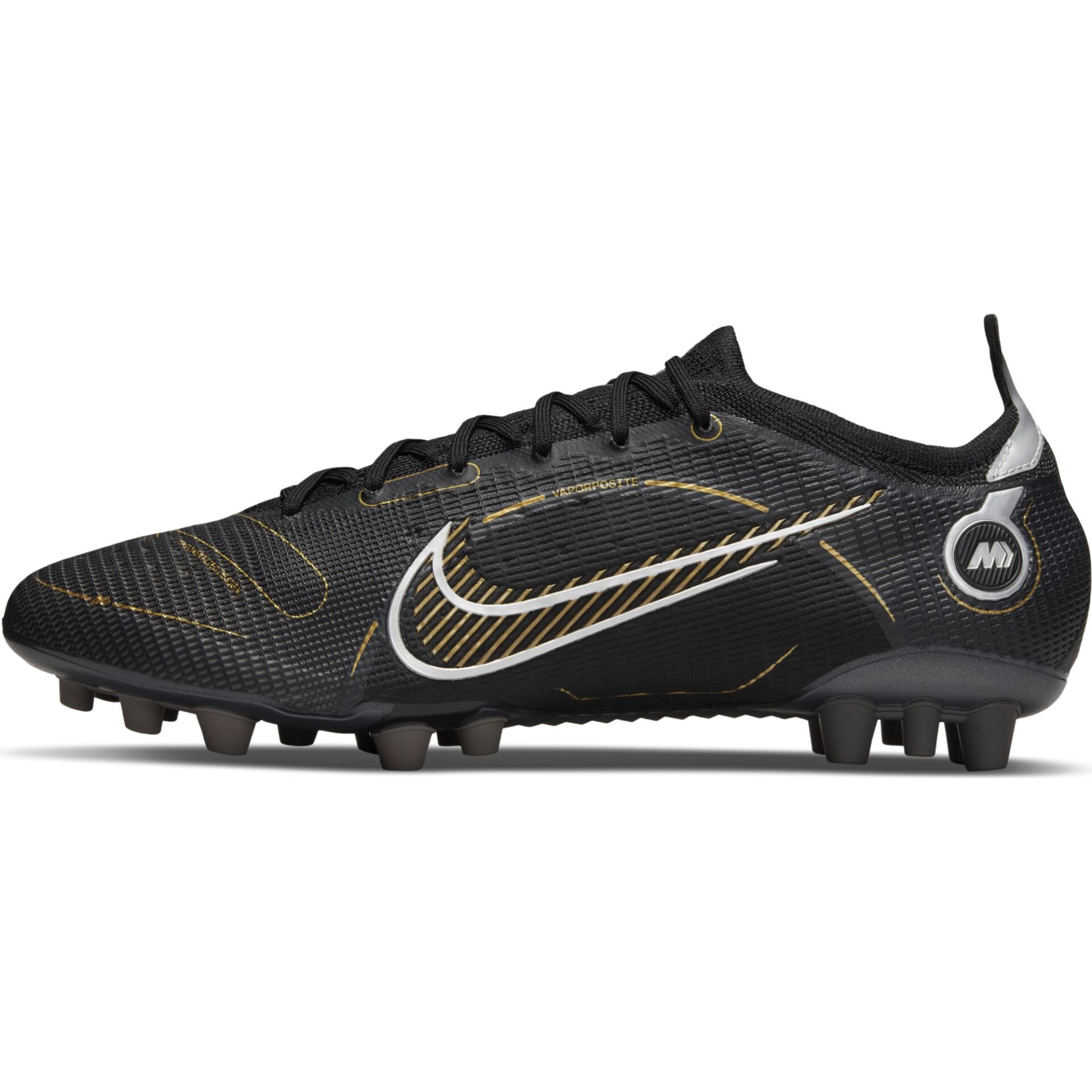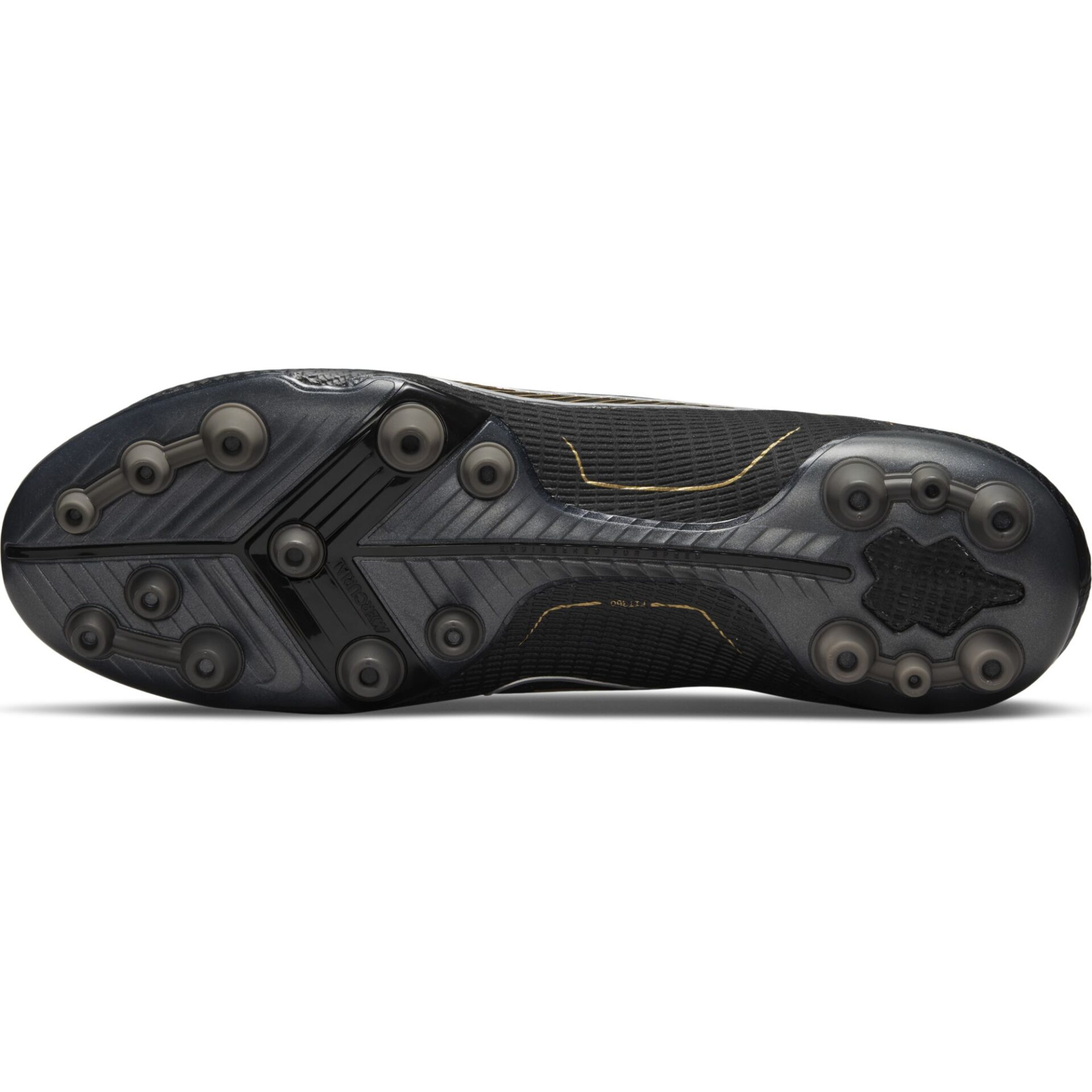 Piatto suola sull’ avampiede con zona Nike Aerotrak con intagli per accelerazioni esplosive. I tacchetti a V della scarpa da calcio Nike Mercurial Vapor 14 Elite AG offrono trazione multidirezionale a ogni passo.