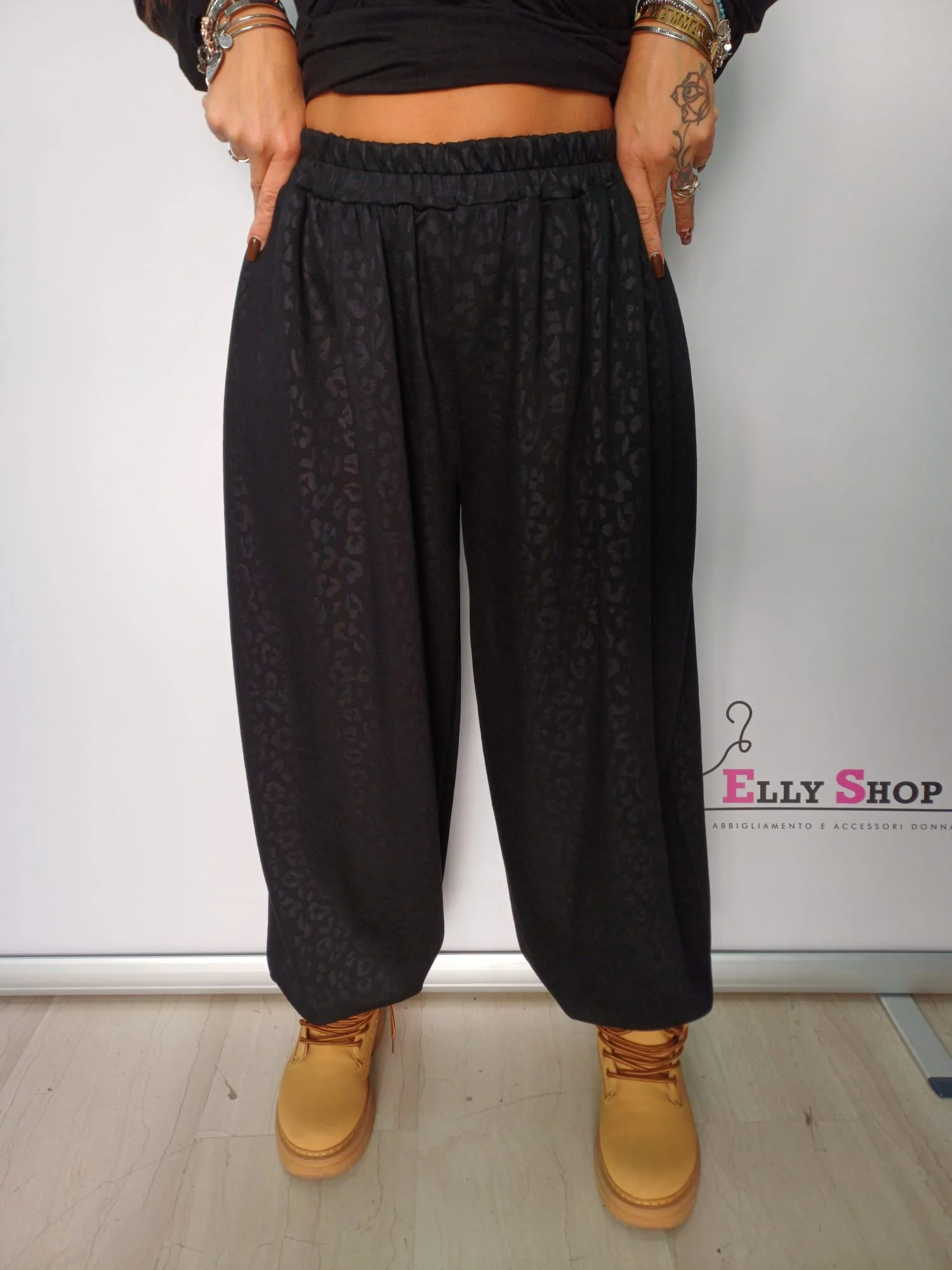 Pantalone dallo stile contemporaneo e confortevole, caratterizzato da una linea ampia e morbida che garantisce libertร di movimento e una vestibilitร versatile. Il design con elastico in vita assicura comfort e adattabilitร , mentre il motivo tono su tono aggiunge un tocco sofisticato e discreto. Perfetto per look casual chic, si abbina facilmente a bluse, maglie o cardigan. Disponibile nei colori nero, bordeaux e marrone, รจ un capo ideale per la stagione autunnale e invernale.