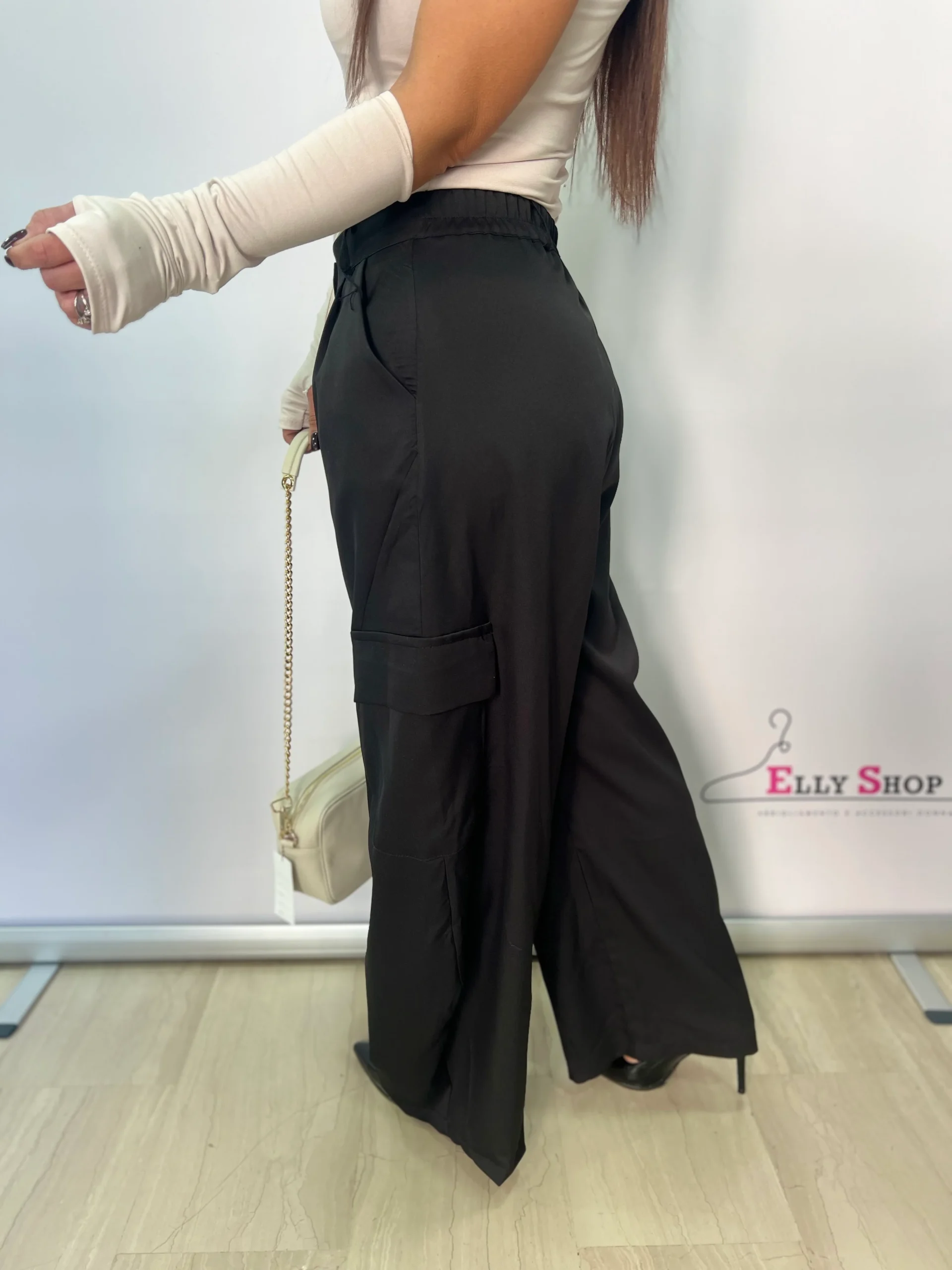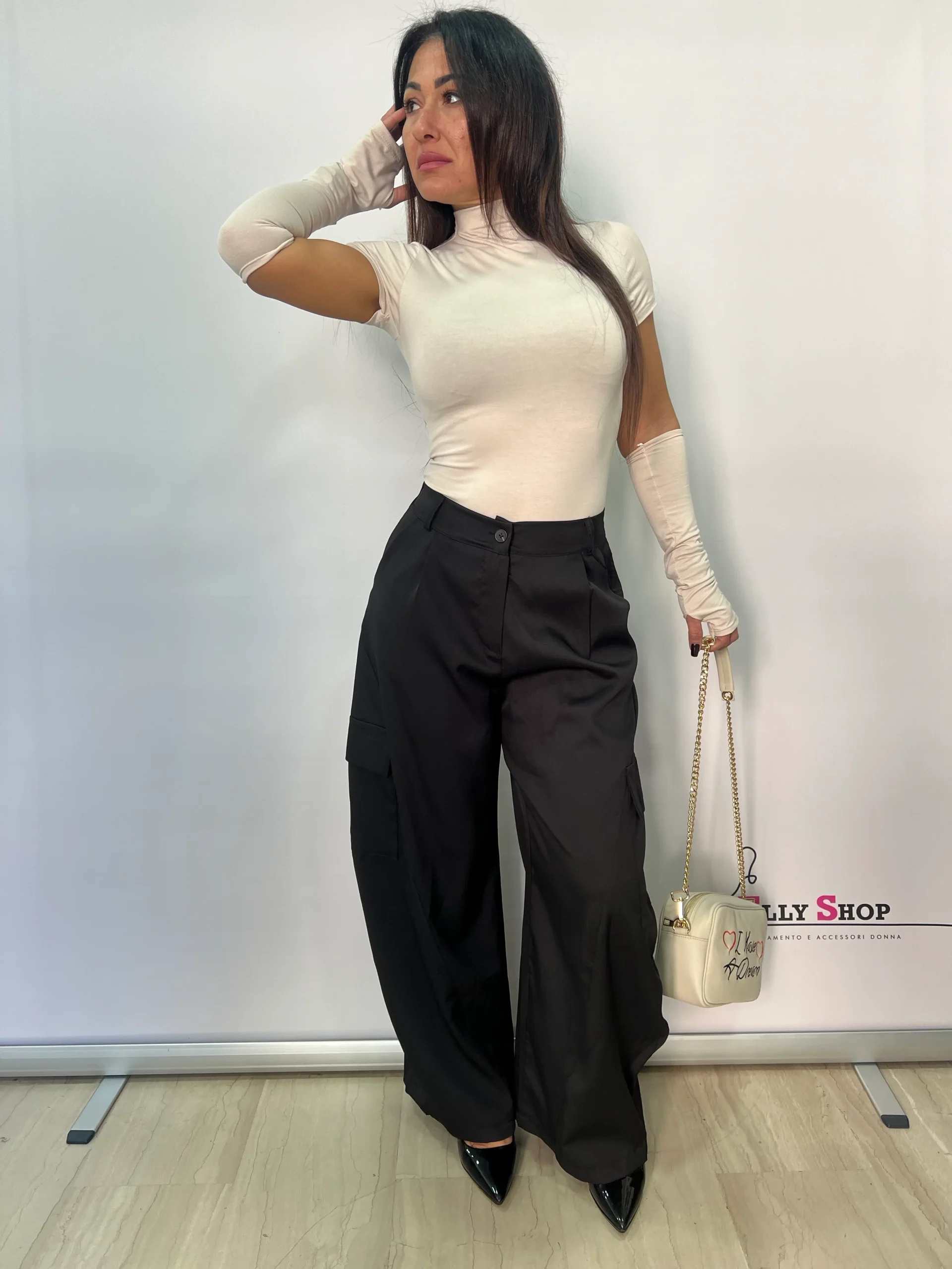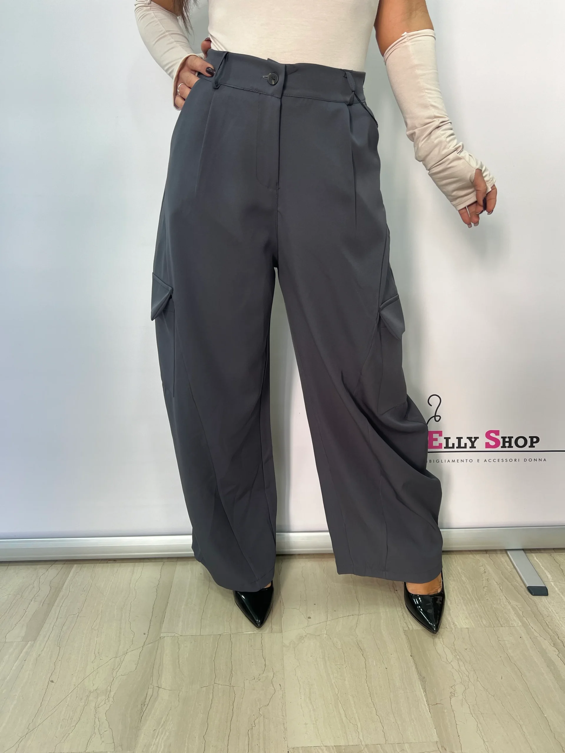 Pantalone donna dal design moderno e di tendenza, caratterizzato da linea palazzo ampia e vita alta che valorizza la silhouette offrendo comfort e stile. Il taglio cargo con tasche laterali applicate dona un tocco urban-chic, perfetto per outfit casual curati ma anche per look più ricercati se abbinato a body o camicie strutturate. Un capo versatile, ideale per il giorno e la sera, facile da abbinare e adatto a diverse occasioni.