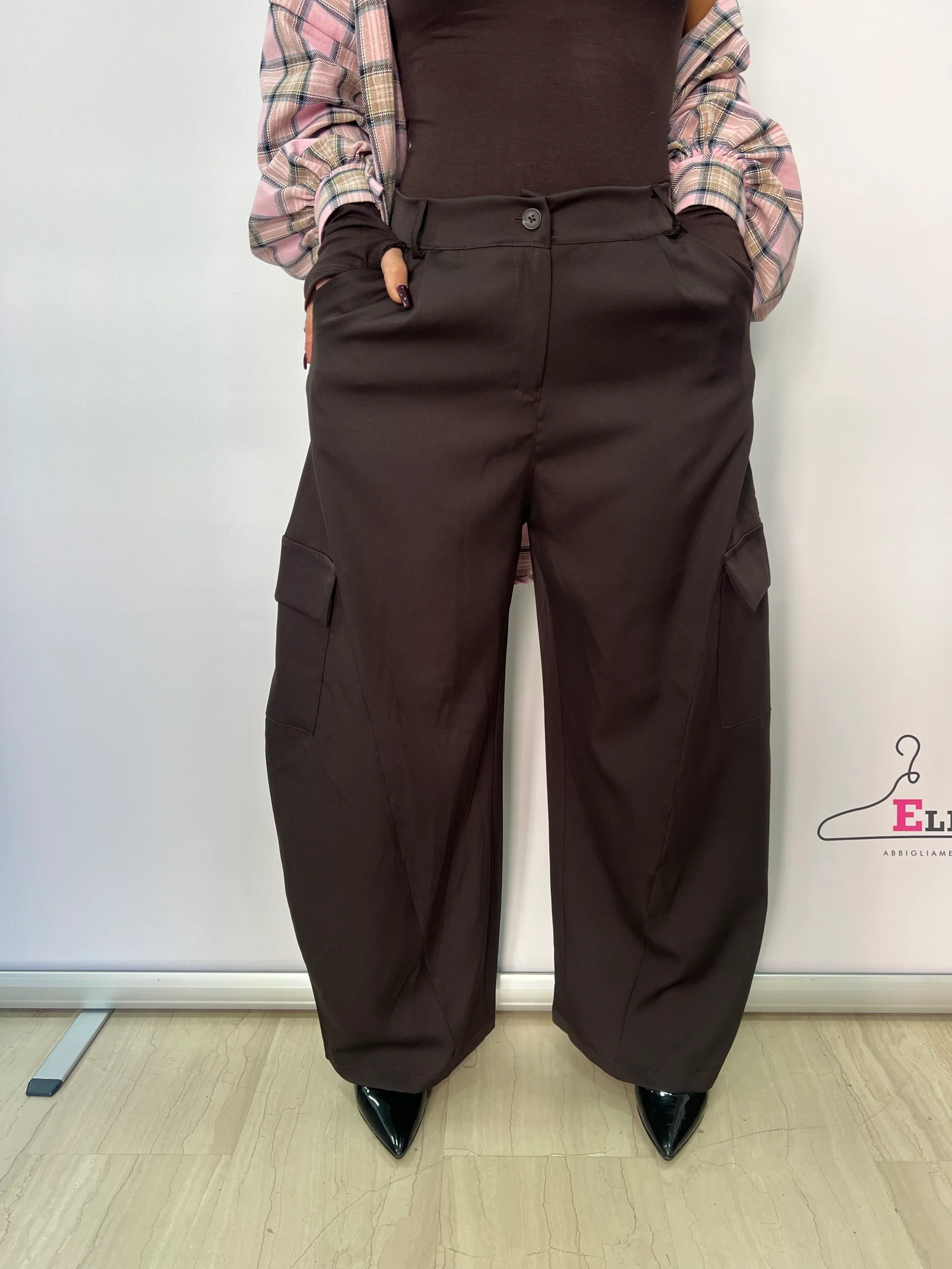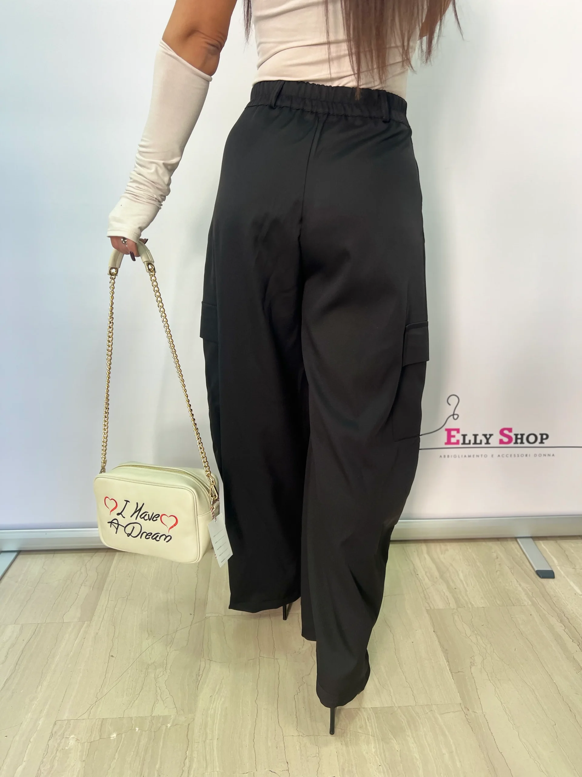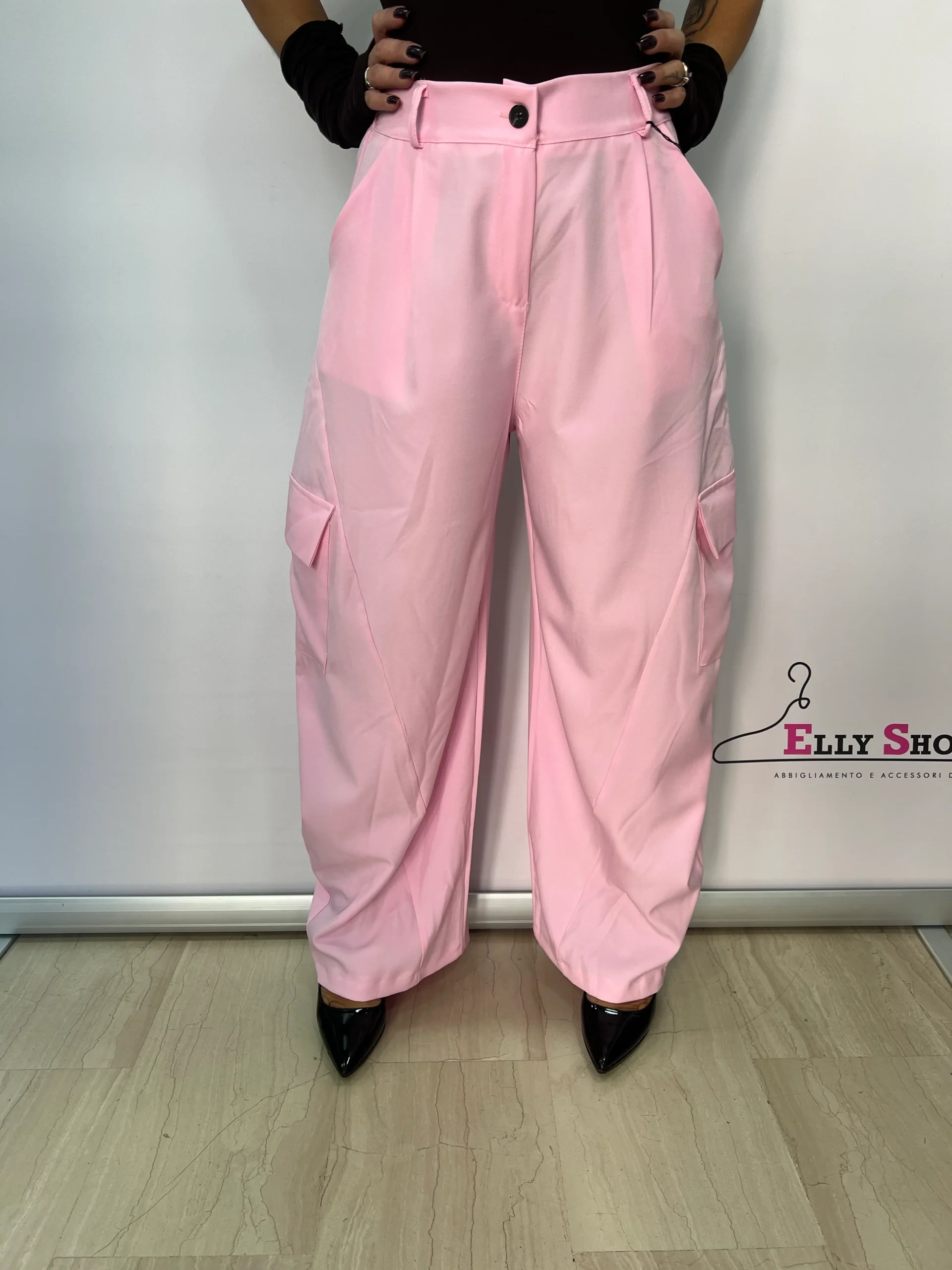 Pantalone donna dal design moderno e di tendenza, caratterizzato da linea palazzo ampia e vita alta che valorizza la silhouette offrendo comfort e stile. Il taglio cargo con tasche laterali applicate dona un tocco urban-chic, perfetto per outfit casual curati ma anche per look più ricercati se abbinato a body o camicie strutturate. Un capo versatile, ideale per il giorno e la sera, facile da abbinare e adatto a diverse occasioni.