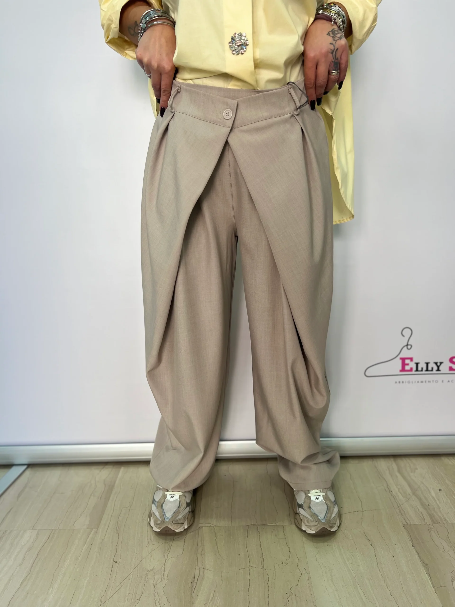 Pantalone donna dal design moderno e di tendenza, caratterizzato da una particolare costruzione con piega frontale incrociata che dona movimento e stile al capo. La vestibilità è ampia e confortevole, con vita strutturata sul davanti ed elastico sul retro per adattarsi facilmente a diverse fisicità. Ideale per look casual chic, outfit da giorno curati o abbinamenti più fashion, è perfetto sia con camicie che con top e sneakers o calzature più eleganti. Disponibile in più colorazioni versatili e di stagione.