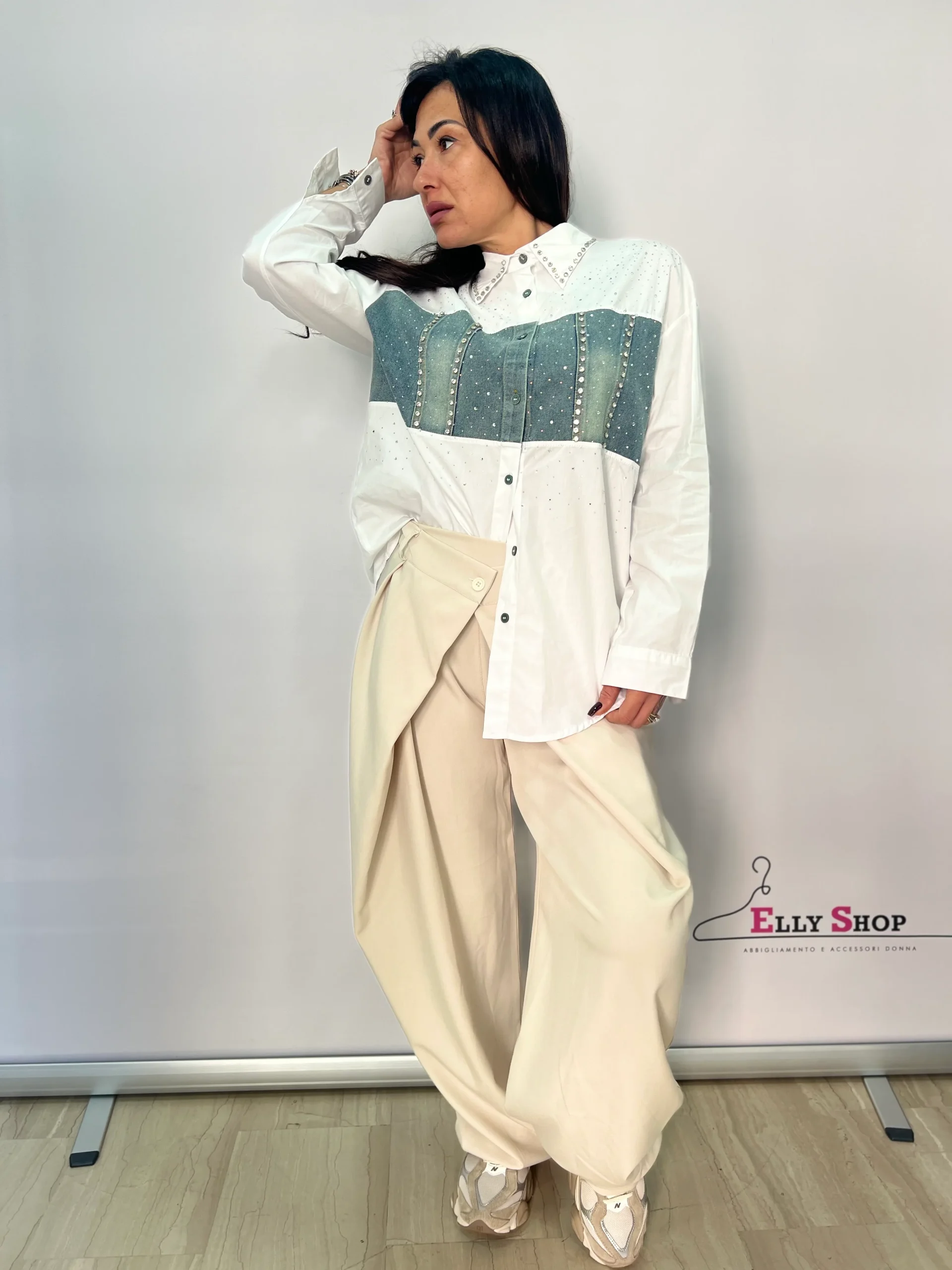 Pantalone ampio con piega incrociata Pantalone donna dal design moderno e di tendenza, caratterizzato da una particolare costruzione con piega frontale incrociata che dona movimento e stile al capo. La vestibilità è ampia e confortevole, con vita strutturata sul davanti ed elastico sul retro per adattarsi facilmente a diverse fisicità. Ideale per look casual chic, […]