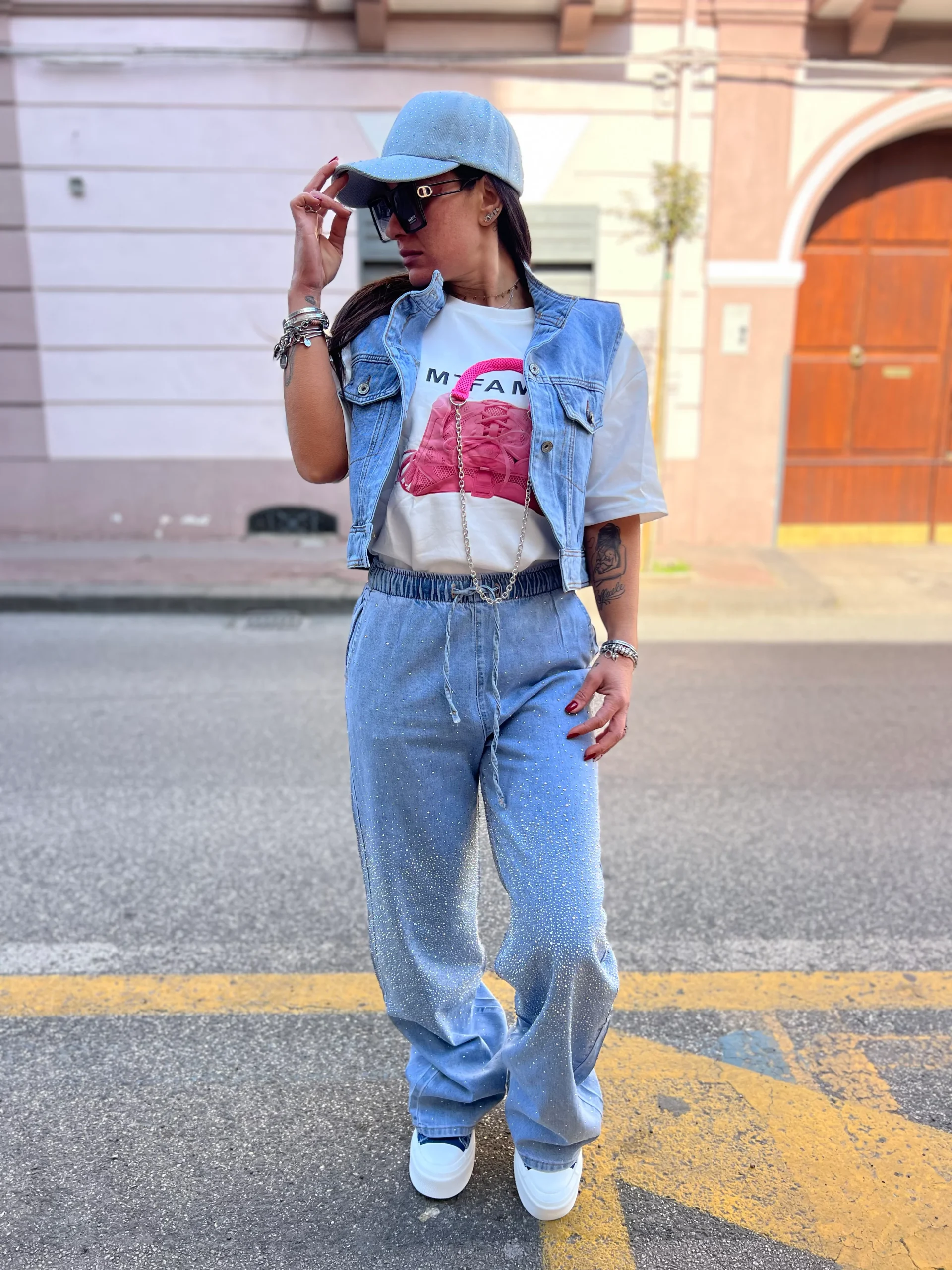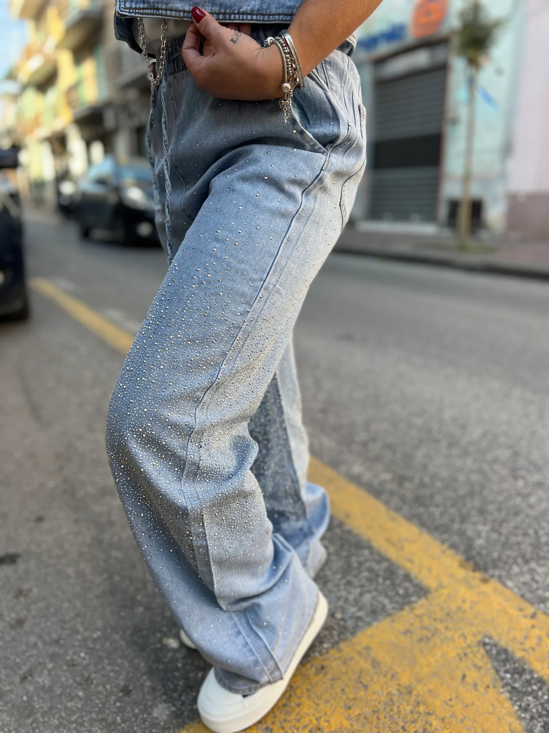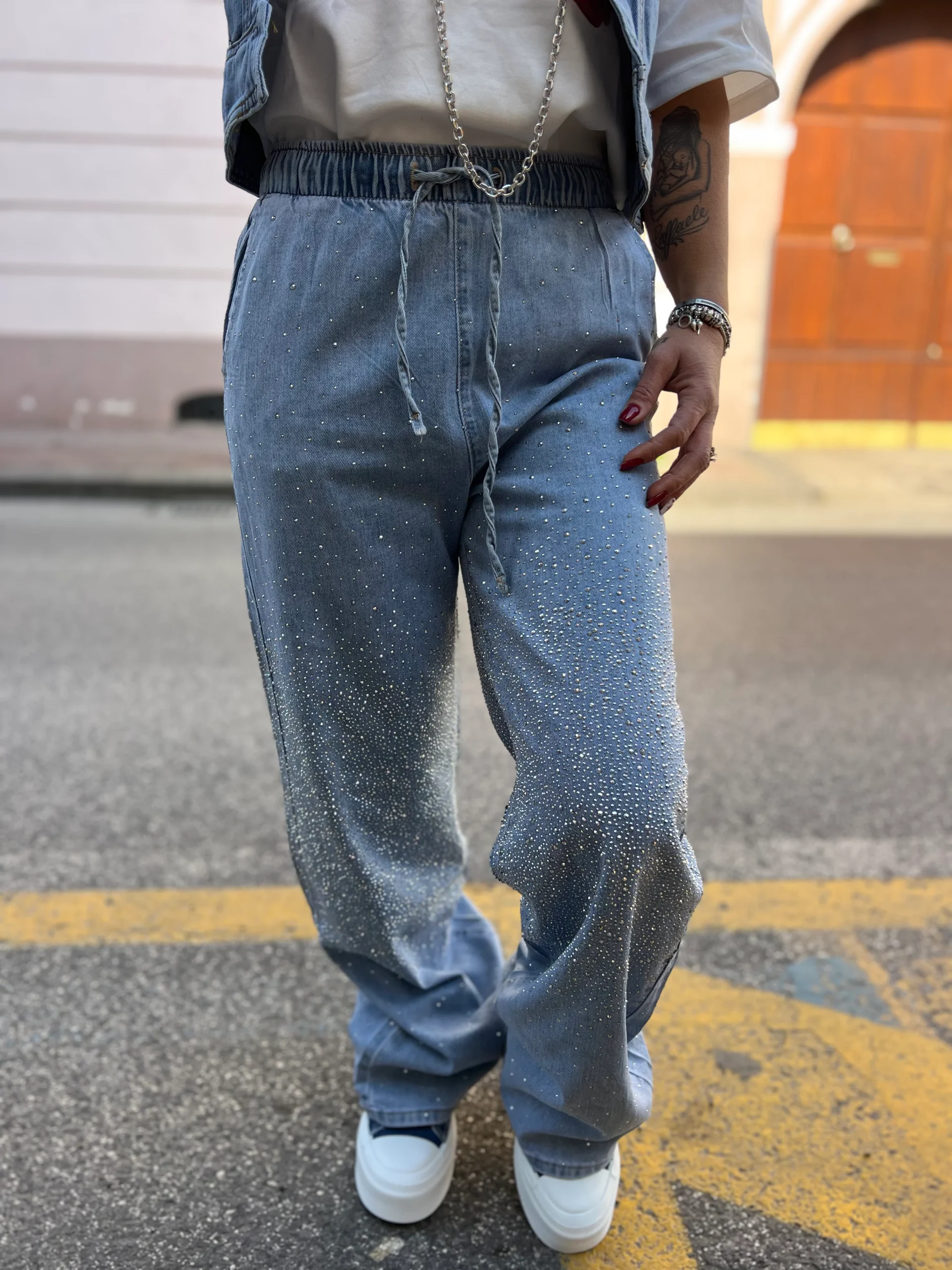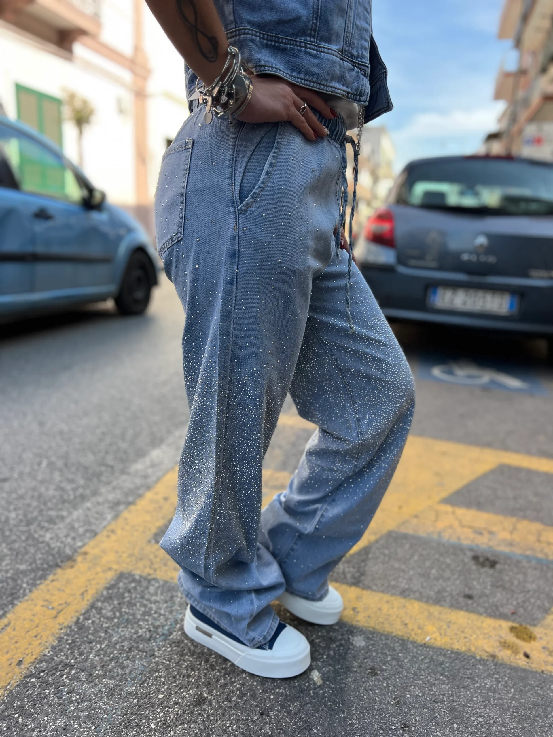 Il Pantalone laccio brillantini รจ un must-have per il tuo guardaroba. Realizzato in jeans elasticizzato, offre una vestibilitร comoda e perfetta per ogni occasione. Il dettaglio dei brillantini sulla vita aggiunge un tocco di glamour e stile. Perfetto per un look casual o elegante.