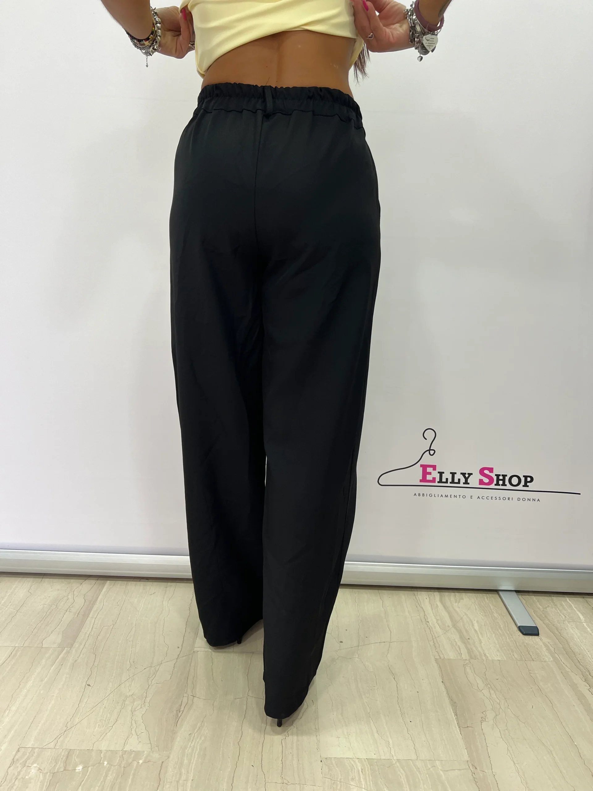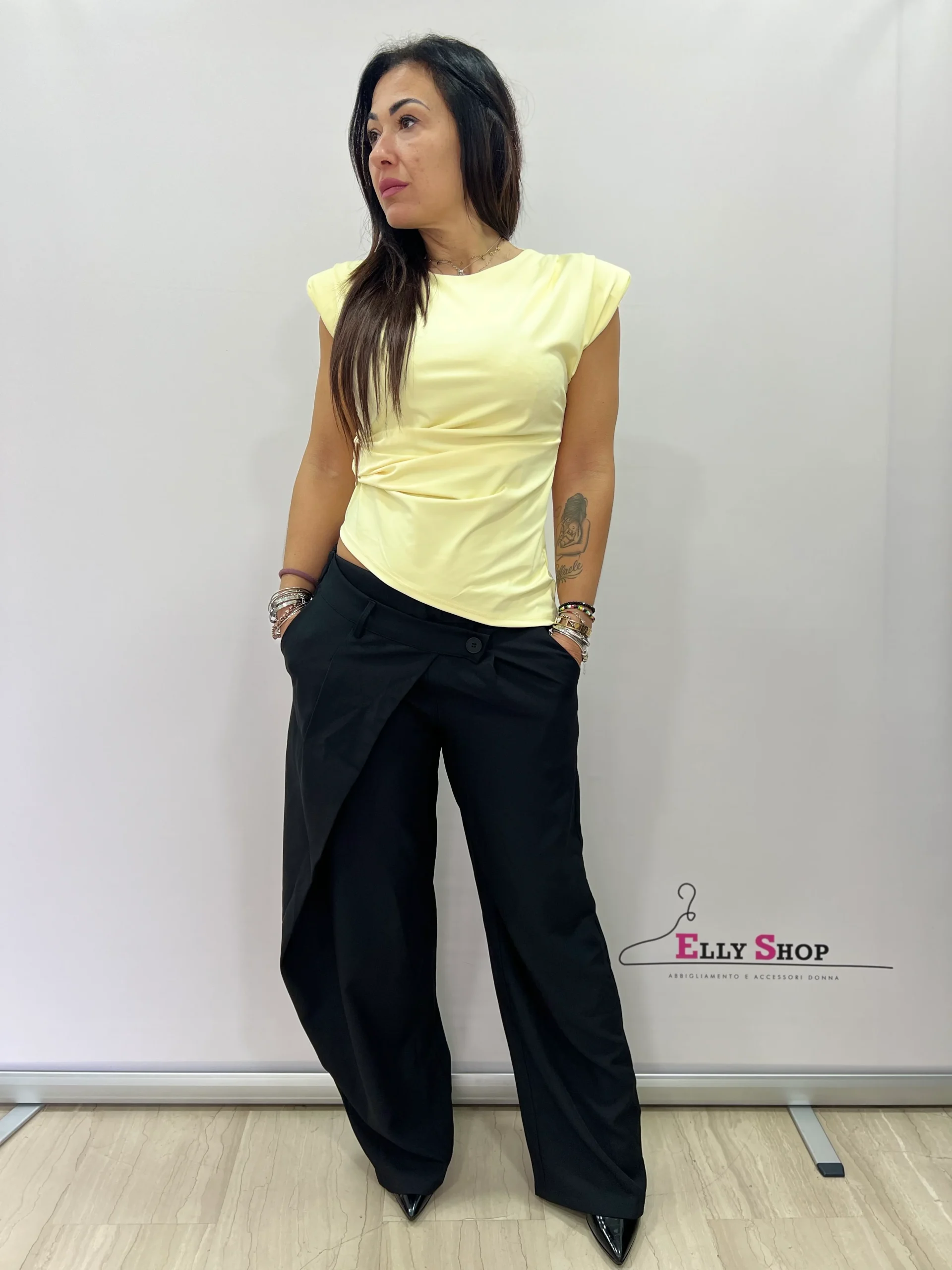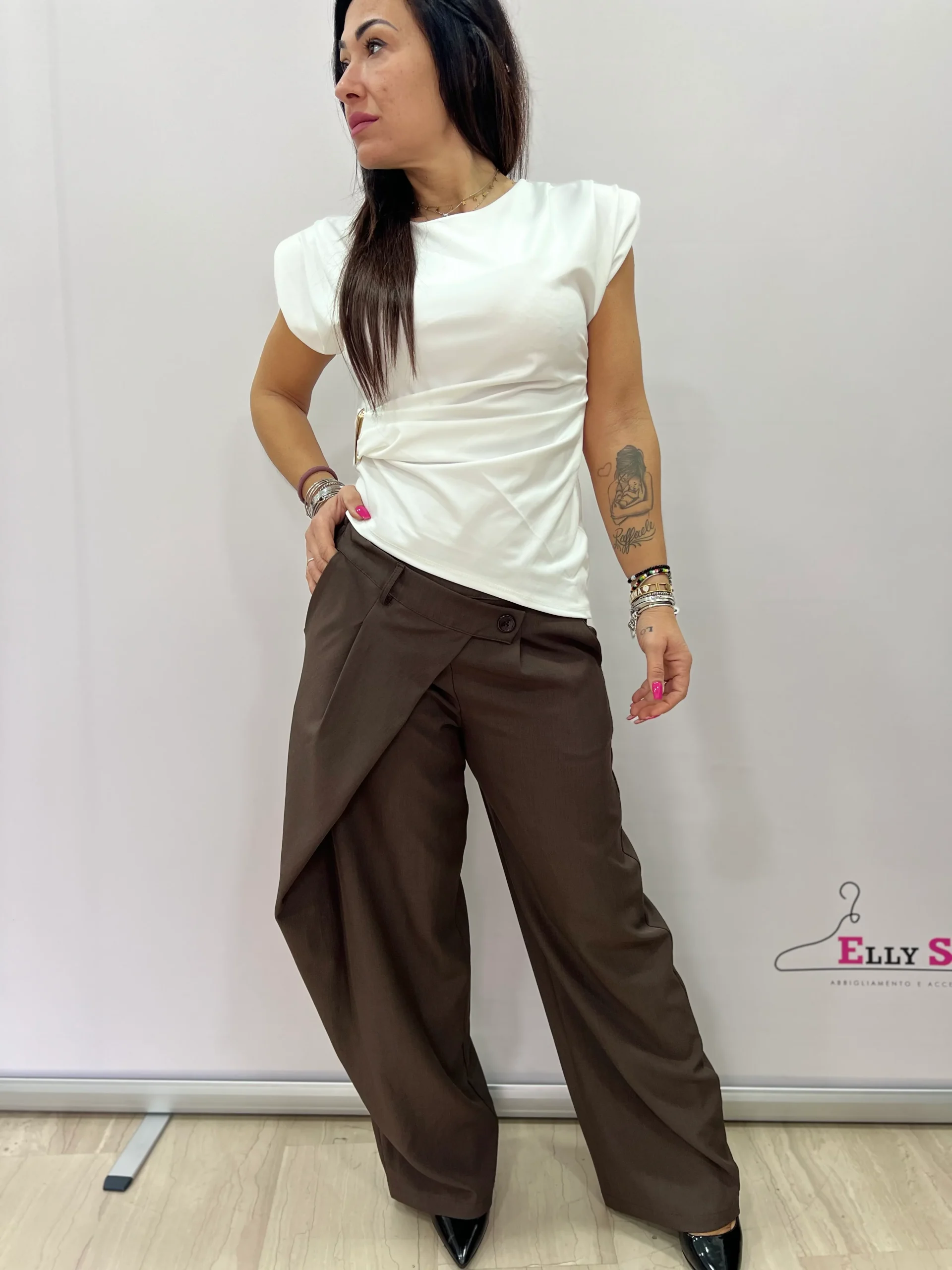 Pantalone dal taglio elegante e contemporaneo, caratterizzato da una raffinata patta frontale incrociata che dona movimento e originalità al design. La linea ampia a palazzo slancia la figura e garantisce comfort assoluto, rendendolo perfetto sia per look formali da ufficio che per outfit più ricercati da sera. Il punto vita strutturato con bottone a vista valorizza la silhouette, mentre la vestibilità morbida accompagna le forme senza segnare. Disponibile nelle varianti nero, marrone cioccolato, beige e azzurro polvere. Un capo versatile e sofisticato, ideale per la stagione Primavera/Estate.