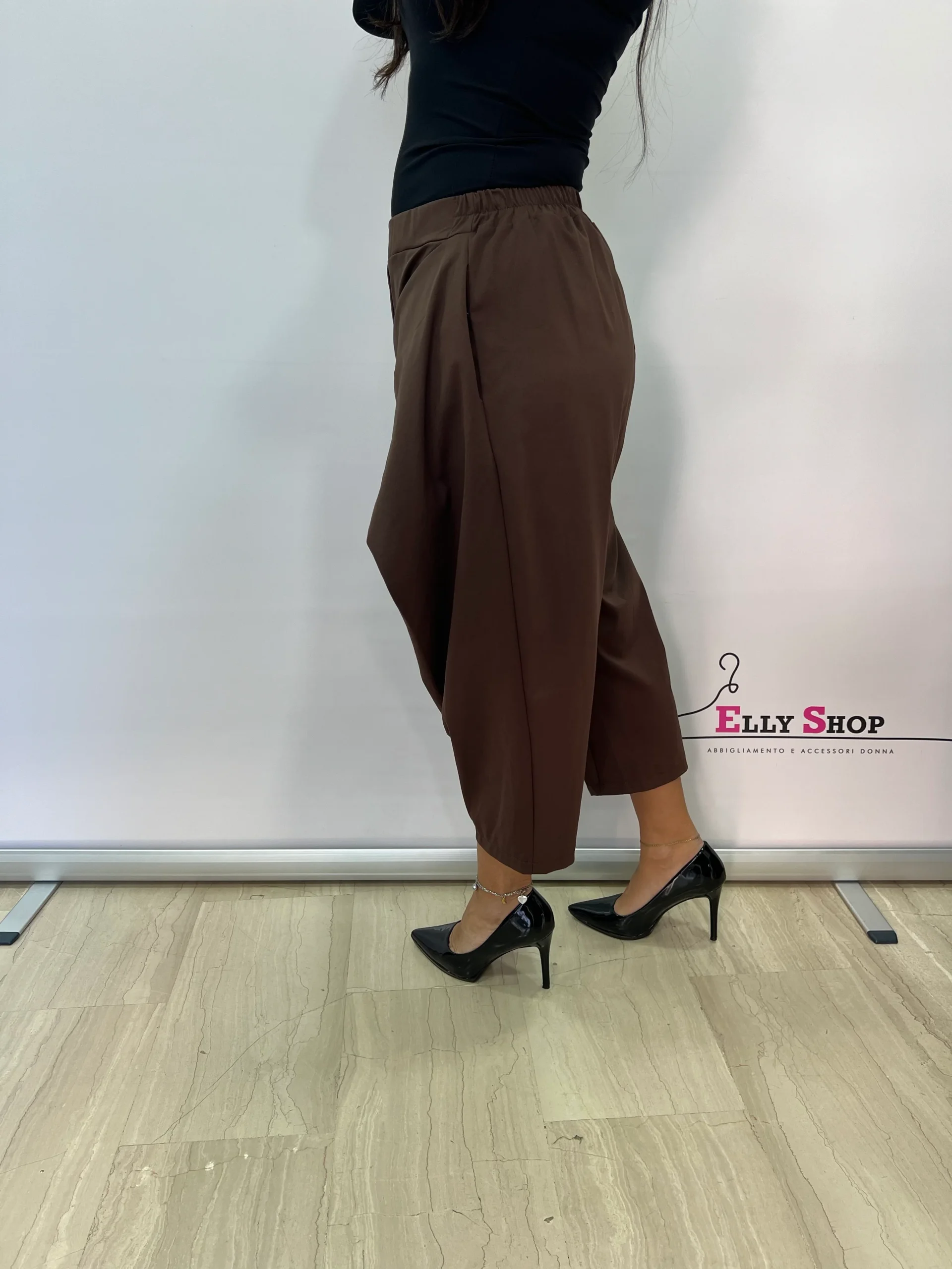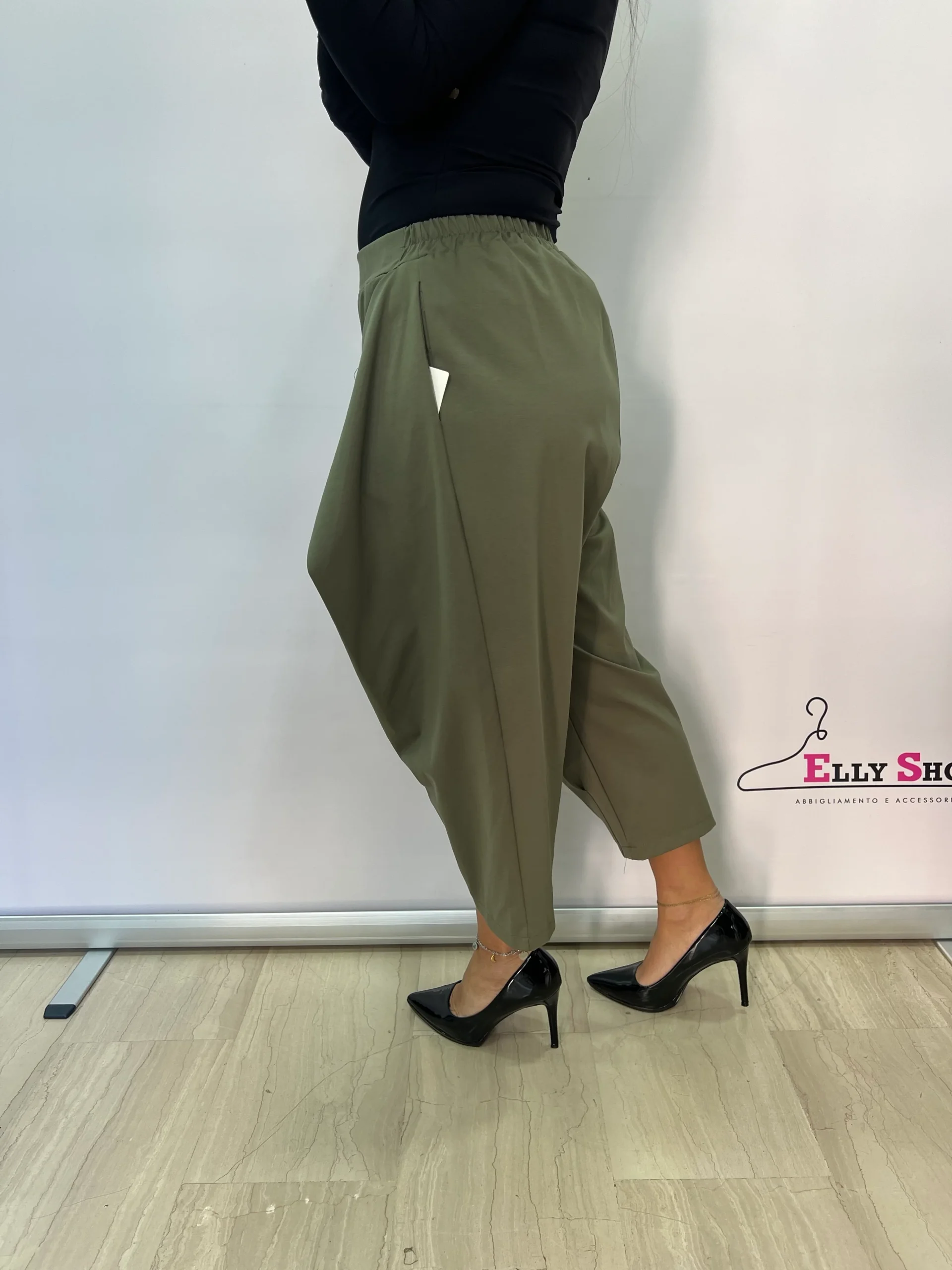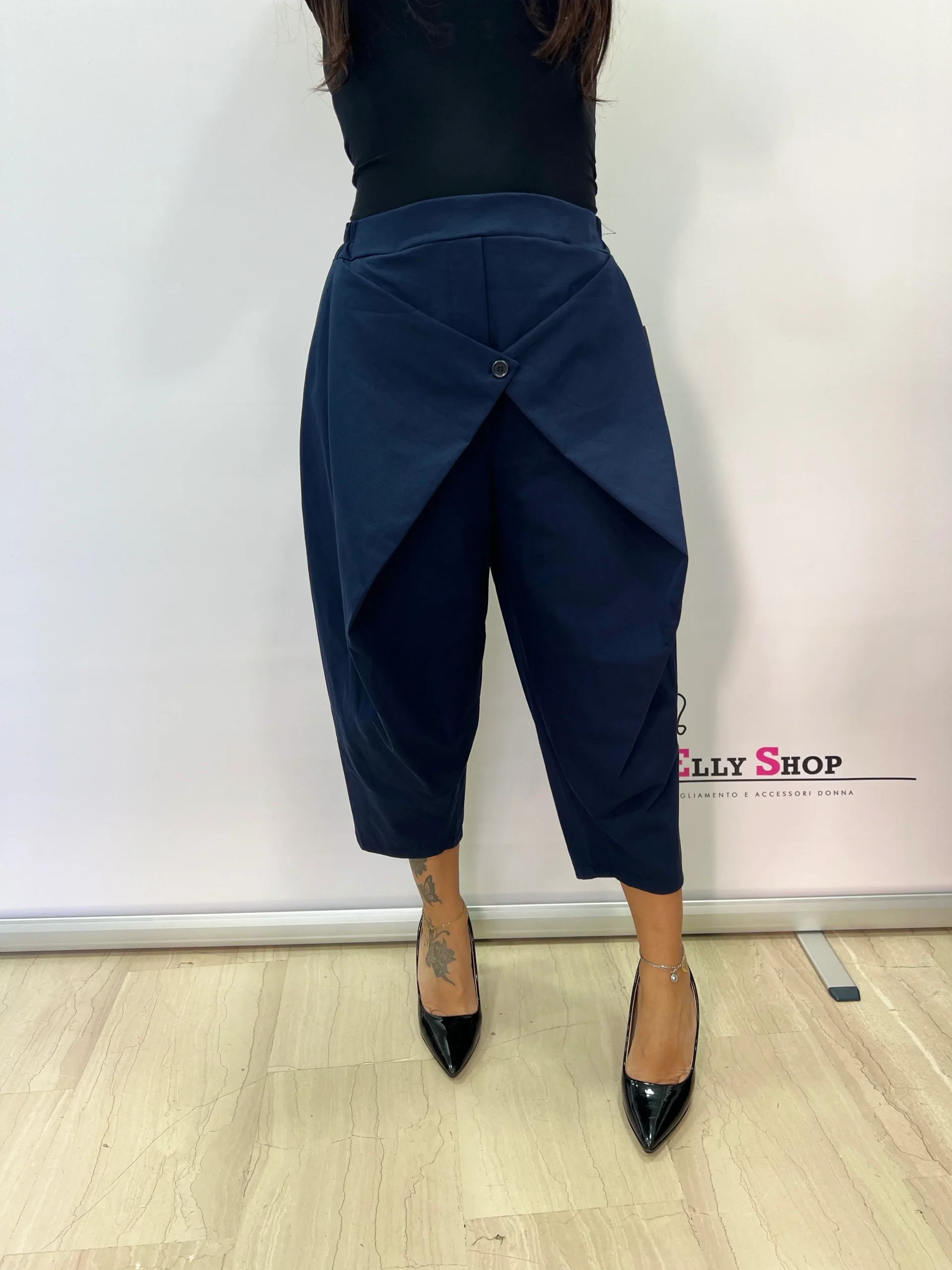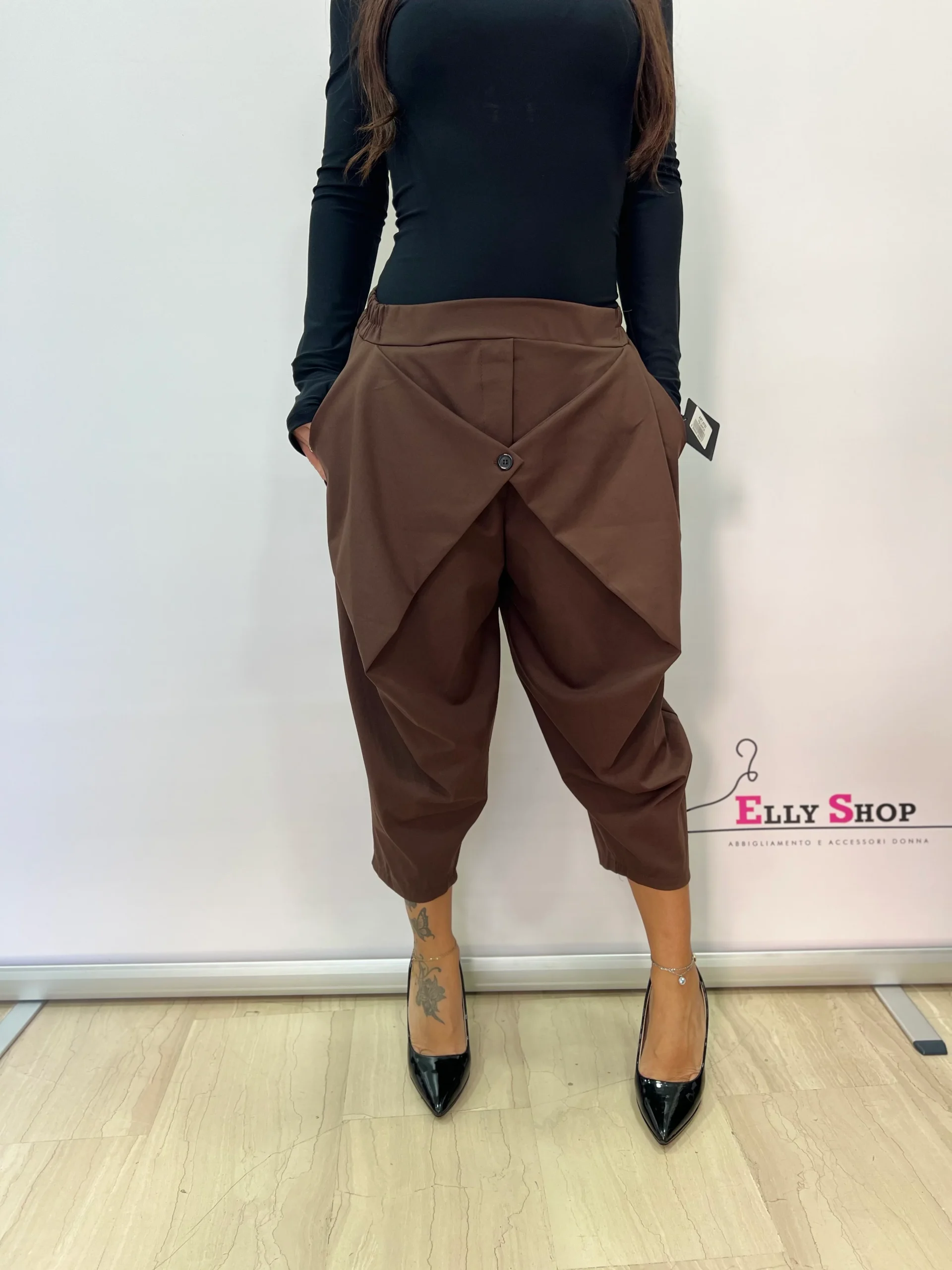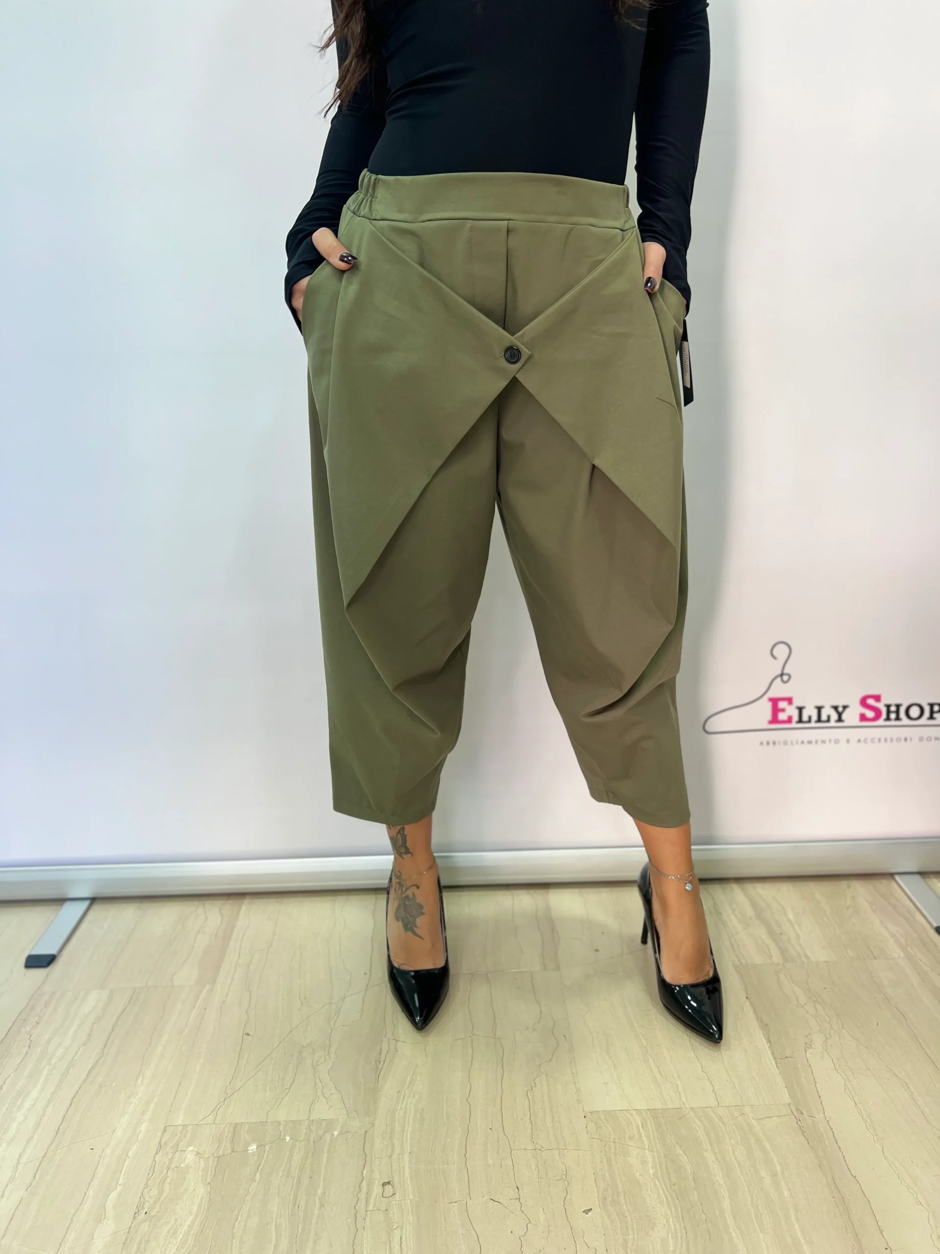 Pantaloni dal design originale e contemporaneo, caratterizzati da un elegante pannello frontale incrociato con bottone decorativo che dona un effetto sofisticato e ricercato. Il modello unisce comfort e stile grazie alla vita elasticizzata e alla linea morbida, perfetta per valorizzare diverse fisicità. Ideali per creare look moderni e versatili, si adattano sia ad abbinamenti casual che più eleganti.