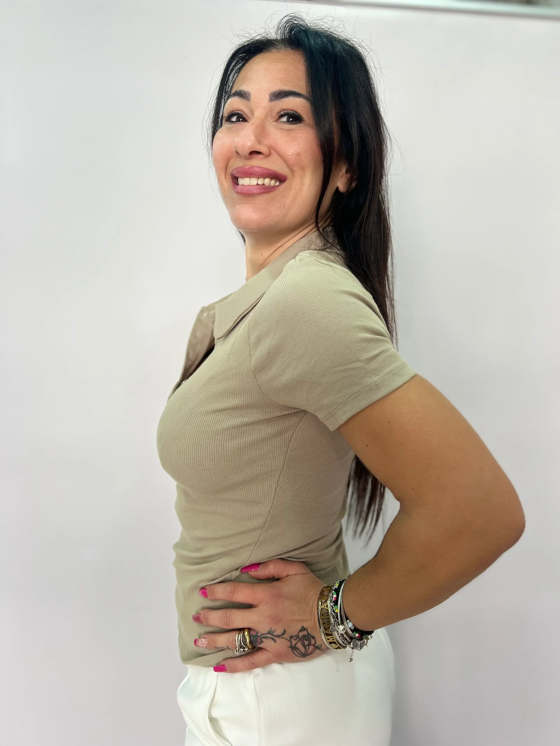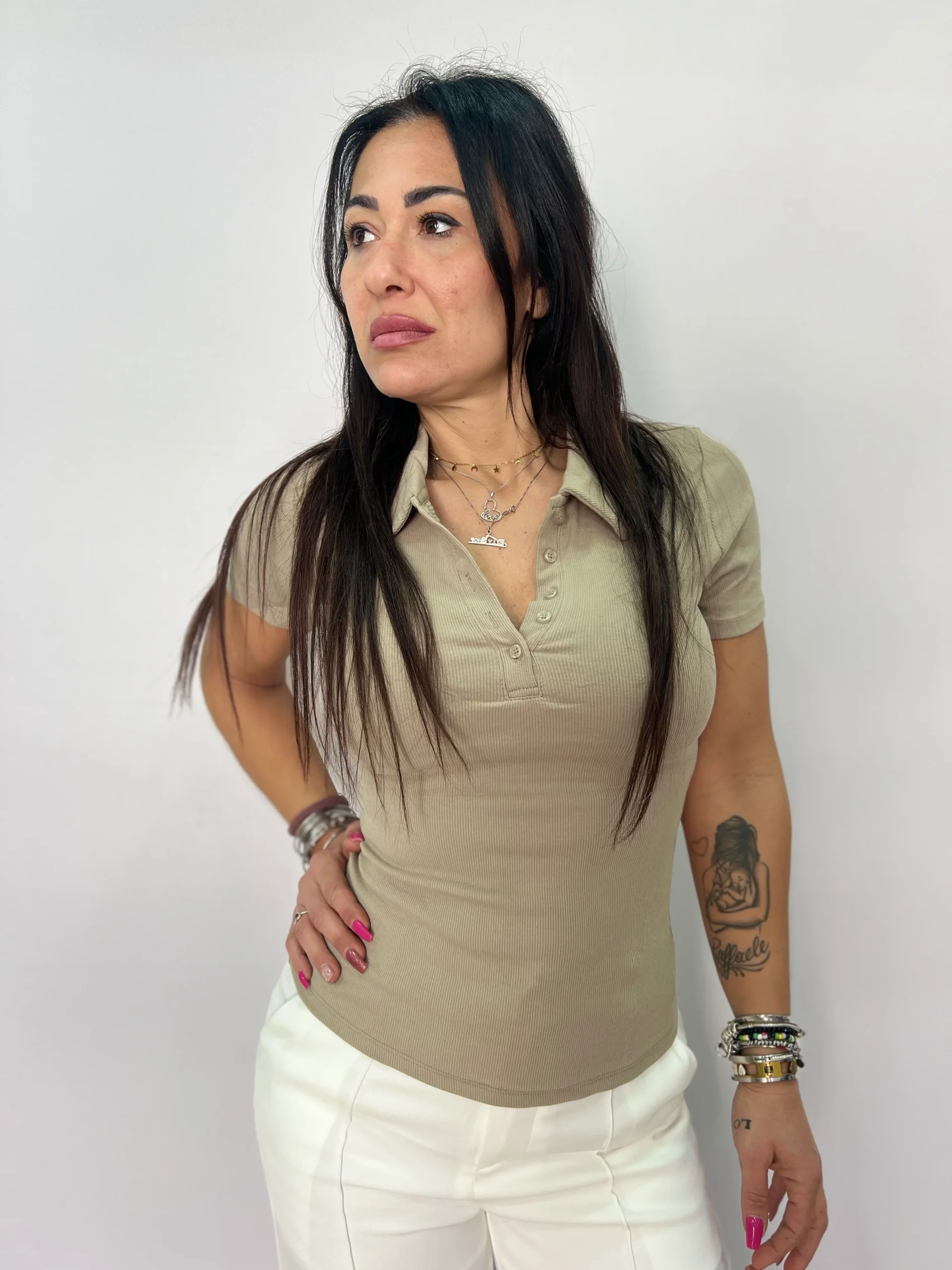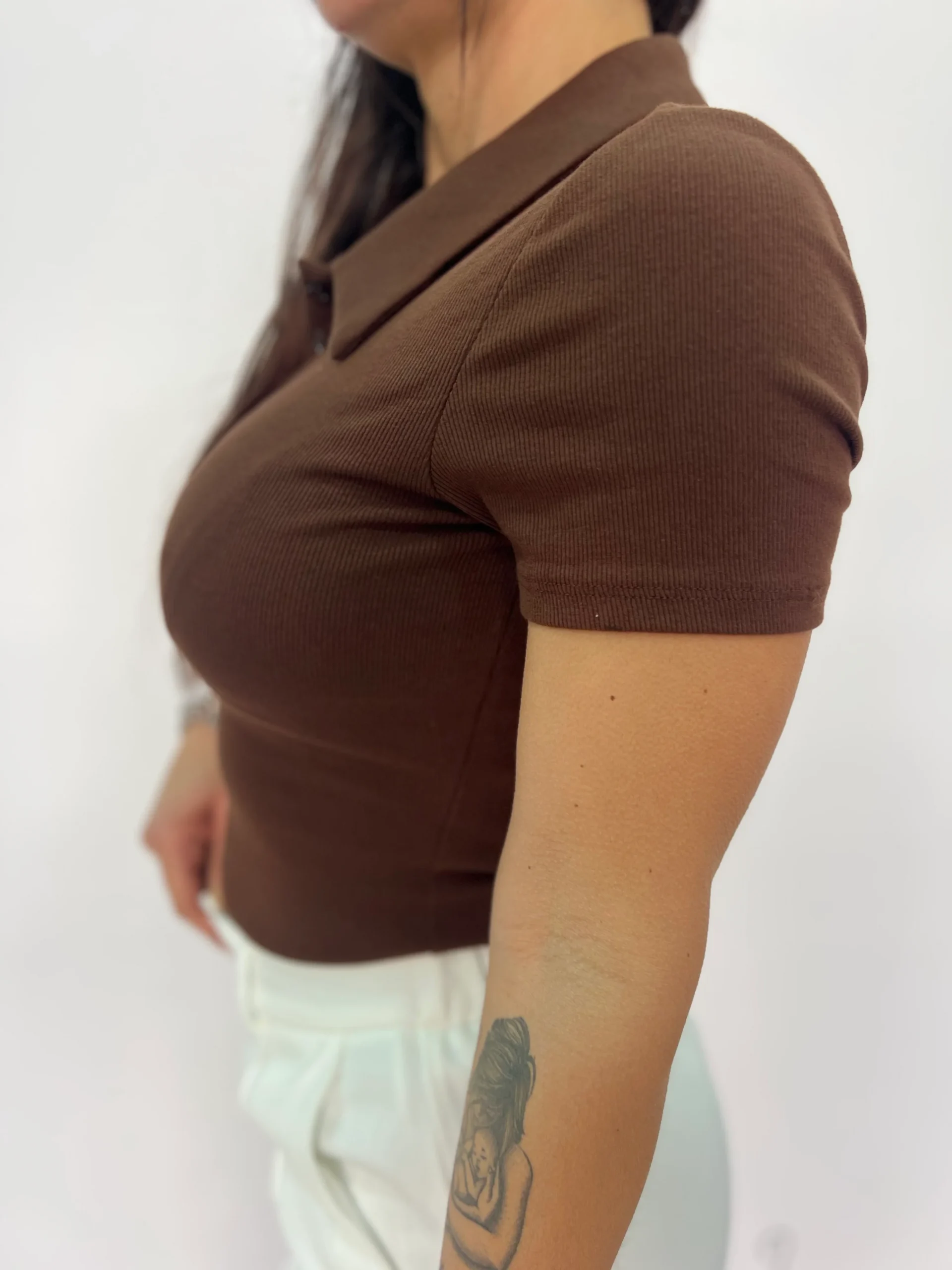 Maglia polo donna dallo stile casual chic, perfetta per creare outfit versatili e sempre curati. Il design a costine valorizza la silhouette grazie alla vestibilità aderente e confortevole, mentre il colletto classico con abbottonatura frontale dona un tocco sportivo ma raffinato. Ideale da abbinare a pantaloni eleganti, jeans o gonne per look da giorno dinamici e femminili. Un capo essenziale del guardaroba, facile da indossare in diverse occasioni, dal tempo libero all’ufficio. Disponibile in tonalità neutre e di tendenza come marrone e beige.