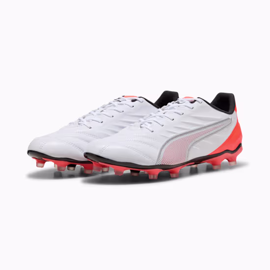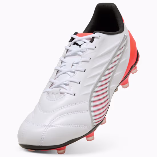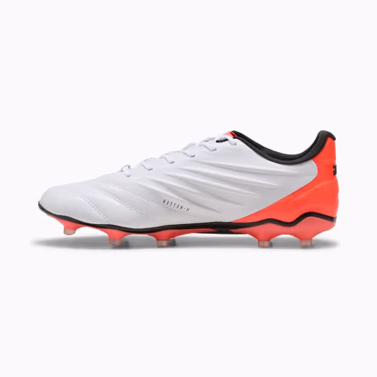 SCARPE calcio PUMA KING PRO FG/AG Bianche Avere il controllo non รจ mai stato cosรฌ comodo. Icona per intere generazioni, la KING torna con un design aggiornato, caratterizzato da dettagli grintosi e materiali innovativi, piรน congeniali alle esigenze dei calciatori e del pianeta. Il nuovo materiale K-BETTERโข della tomaia, ad esempio, รจ realizzato con contenuto riciclato e allo stesso tempo migliora il tocco, il comfort e lโelasticitร che contraddistinguono il modello. La nuova suola leggera presenta un contrafforte esterno, un inserto di supporto e tacchetti conici, che garantiscono il controllo del corpo e della palla. CARATTERISTICHE + VANTAGGI SCARPE calcio…
