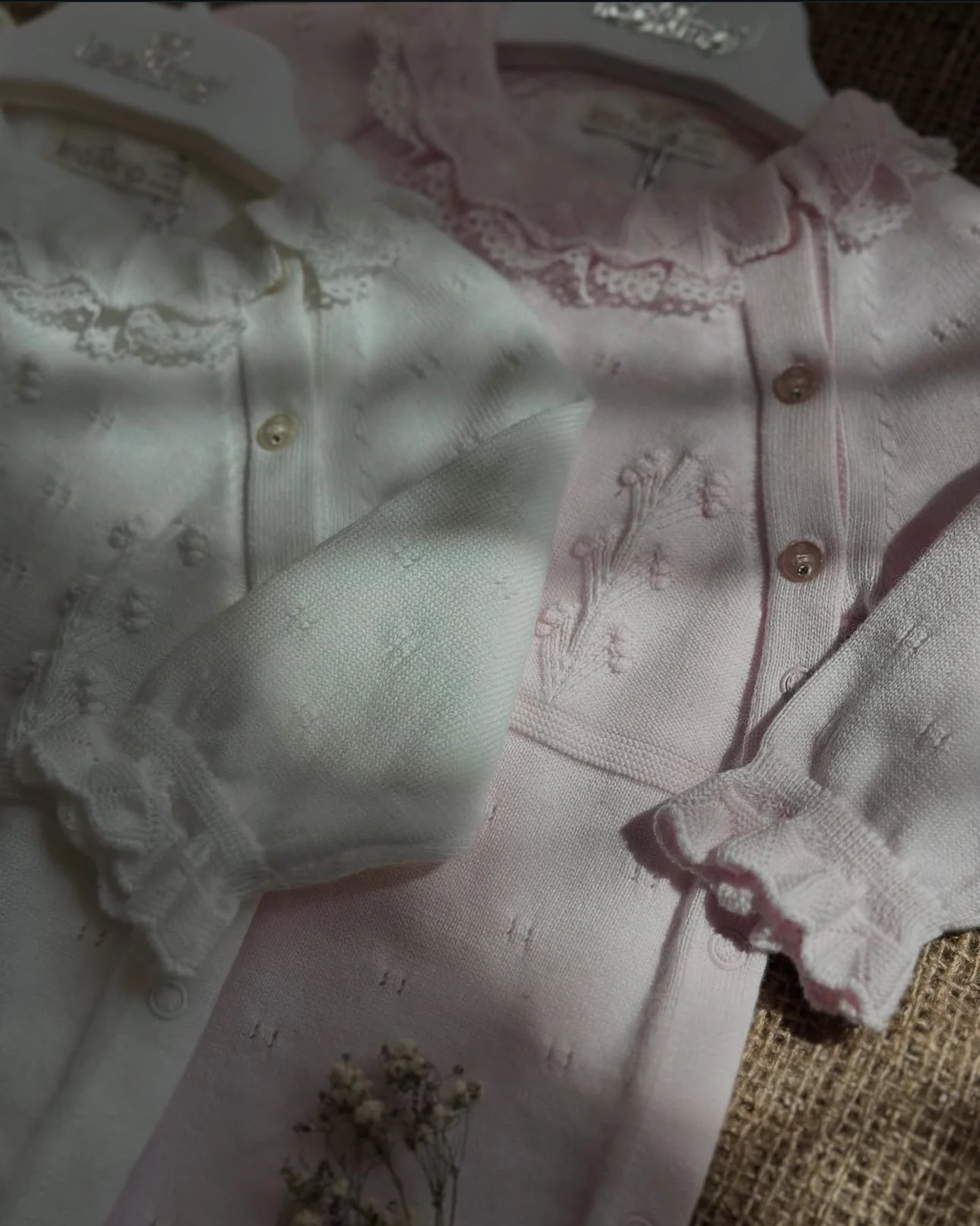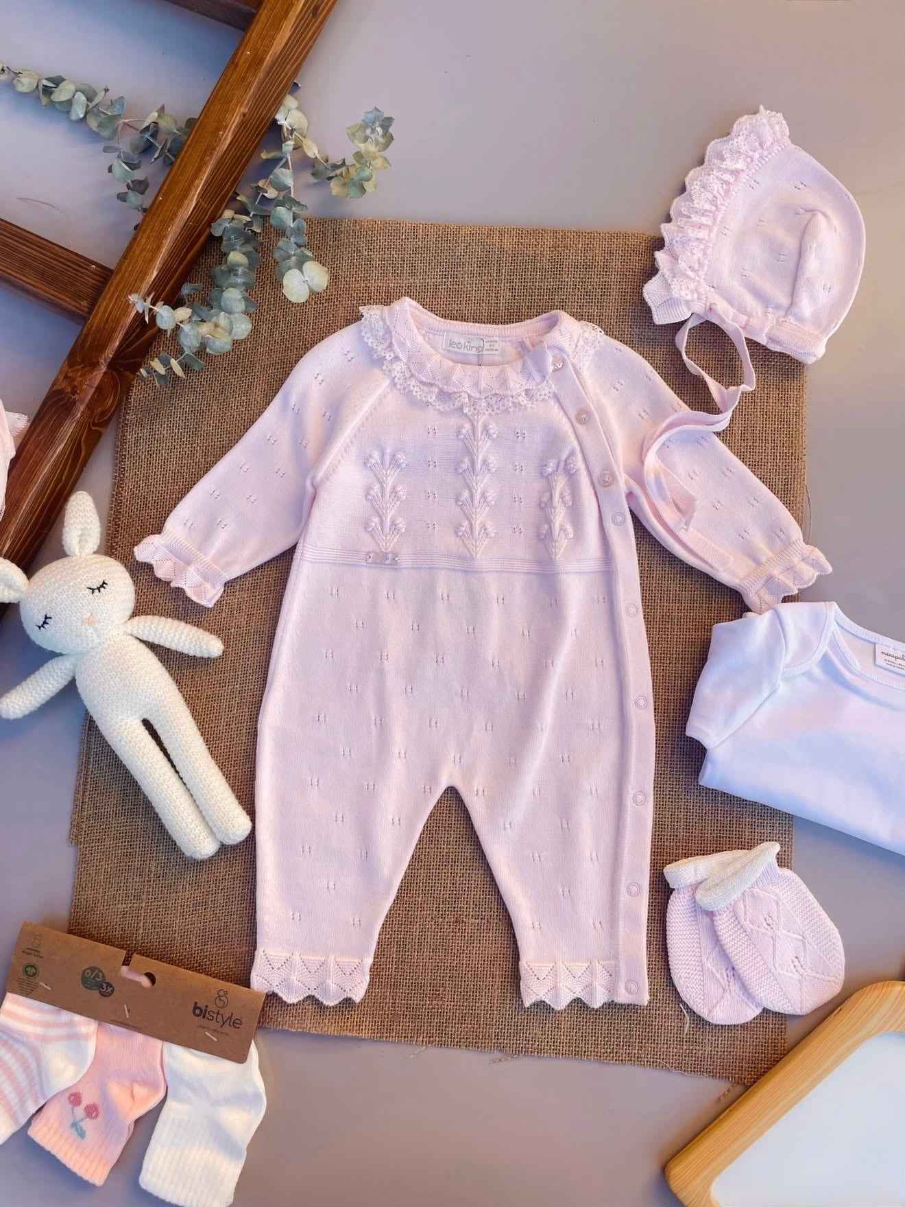 Un capo elegante e delicato, perfetto per il corredino del tuo neonato. Questo set include una tutina in maglia lavorata e una cuffietta abbinata, entrambe impreziosite da dettagli in pizzo e finiture romantiche. Il tessuto morbido e traspirante assicura il massimo comfort per la pelle delicata del bambino, mentre la chiusura laterale con bottoni facilita il cambio.