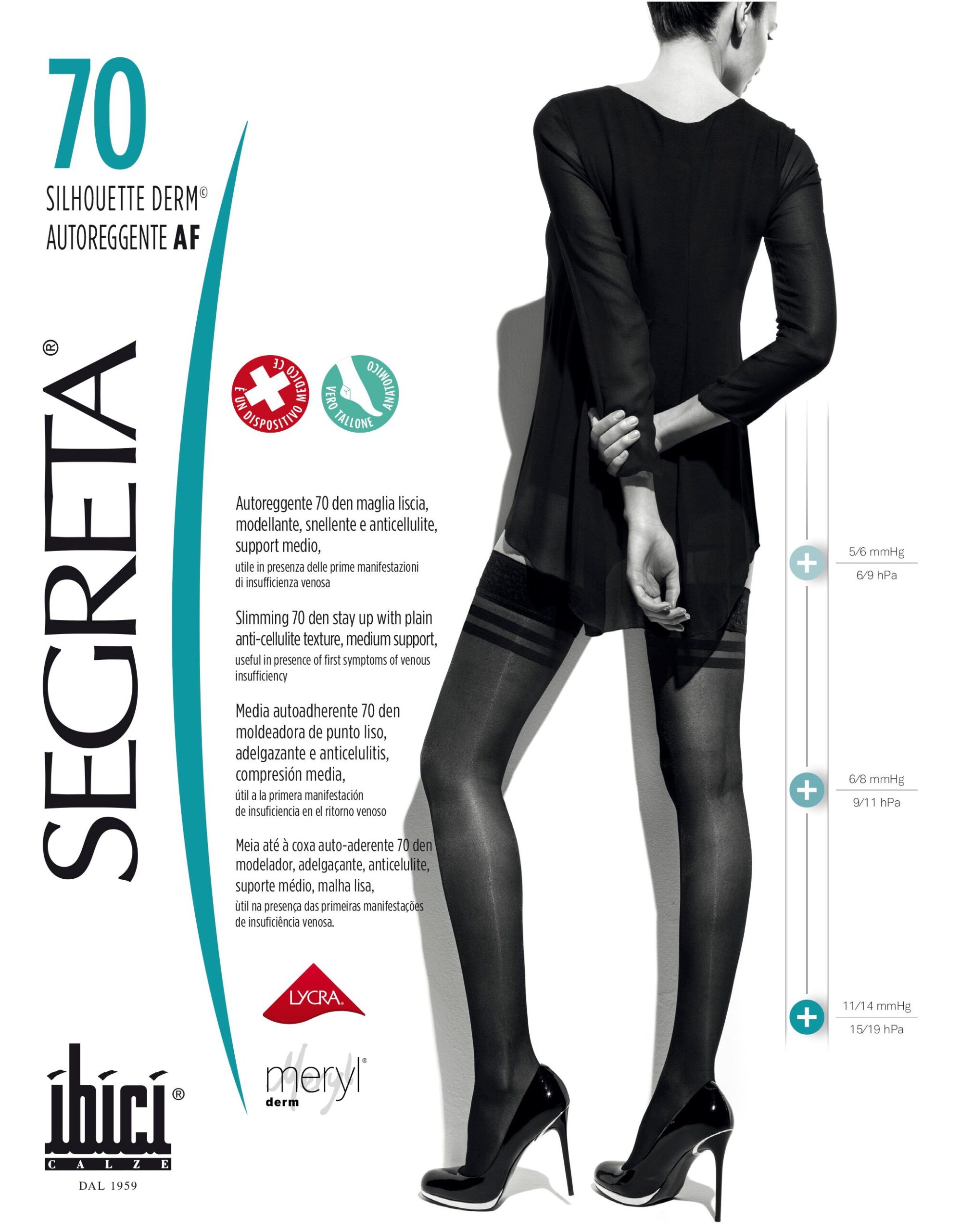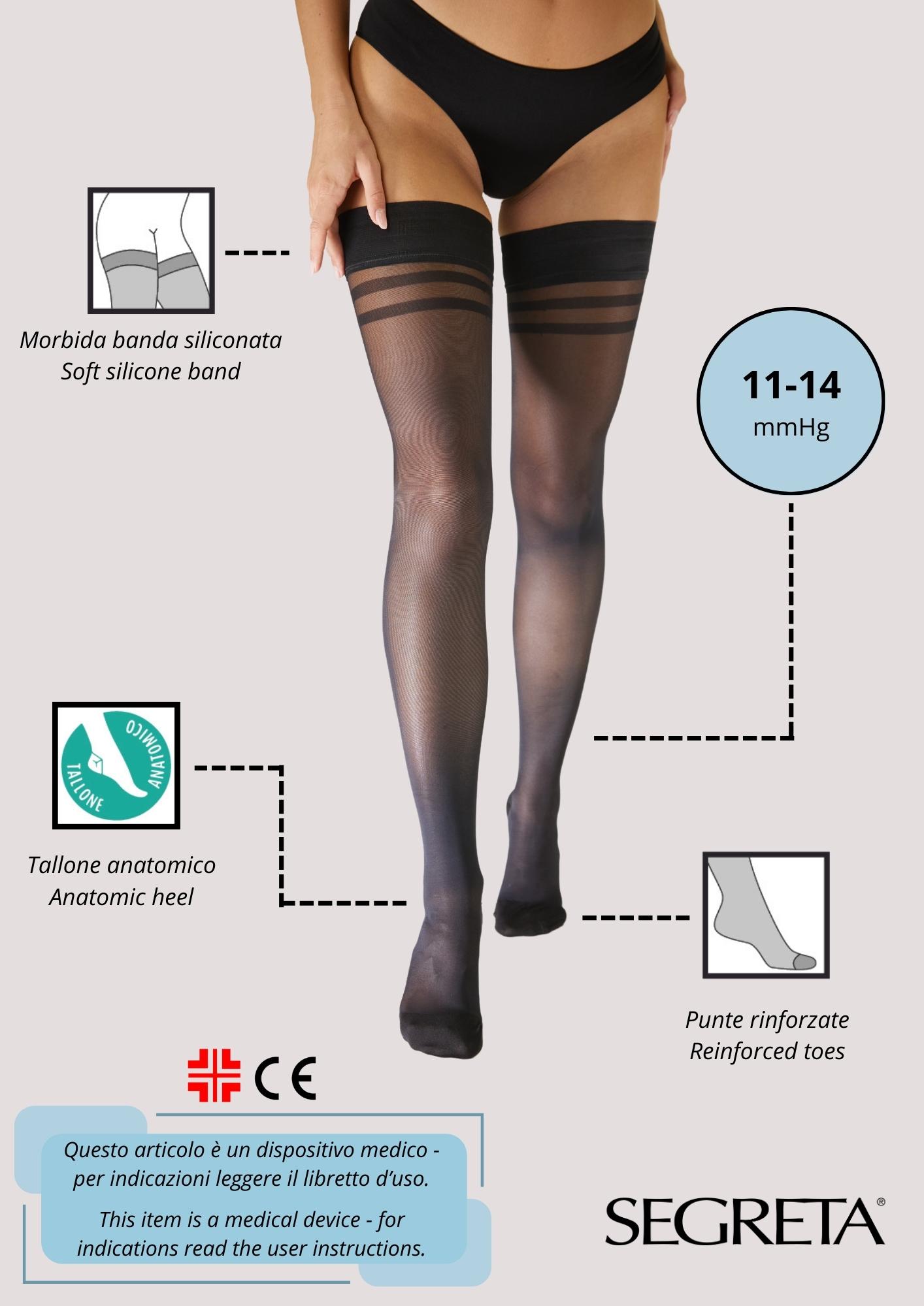 70 DEN – Support medio. Compressione: 11/14 mmHg – 15/19 hPa Composizione : 85% poliammide / 15% elastan