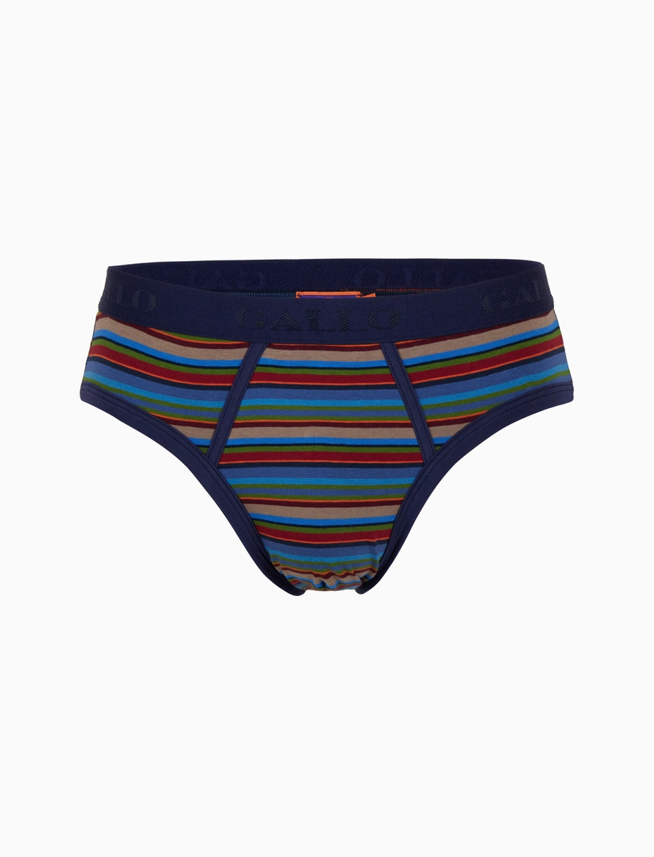 Slip classico da uomo in morbido cotone elasticizzato. L’elastico in vita brandizzato Gallo, garantisce il massimo comfort. L’iconica fantasia a righe multicolor tiene fede alla tradizione Gallo.