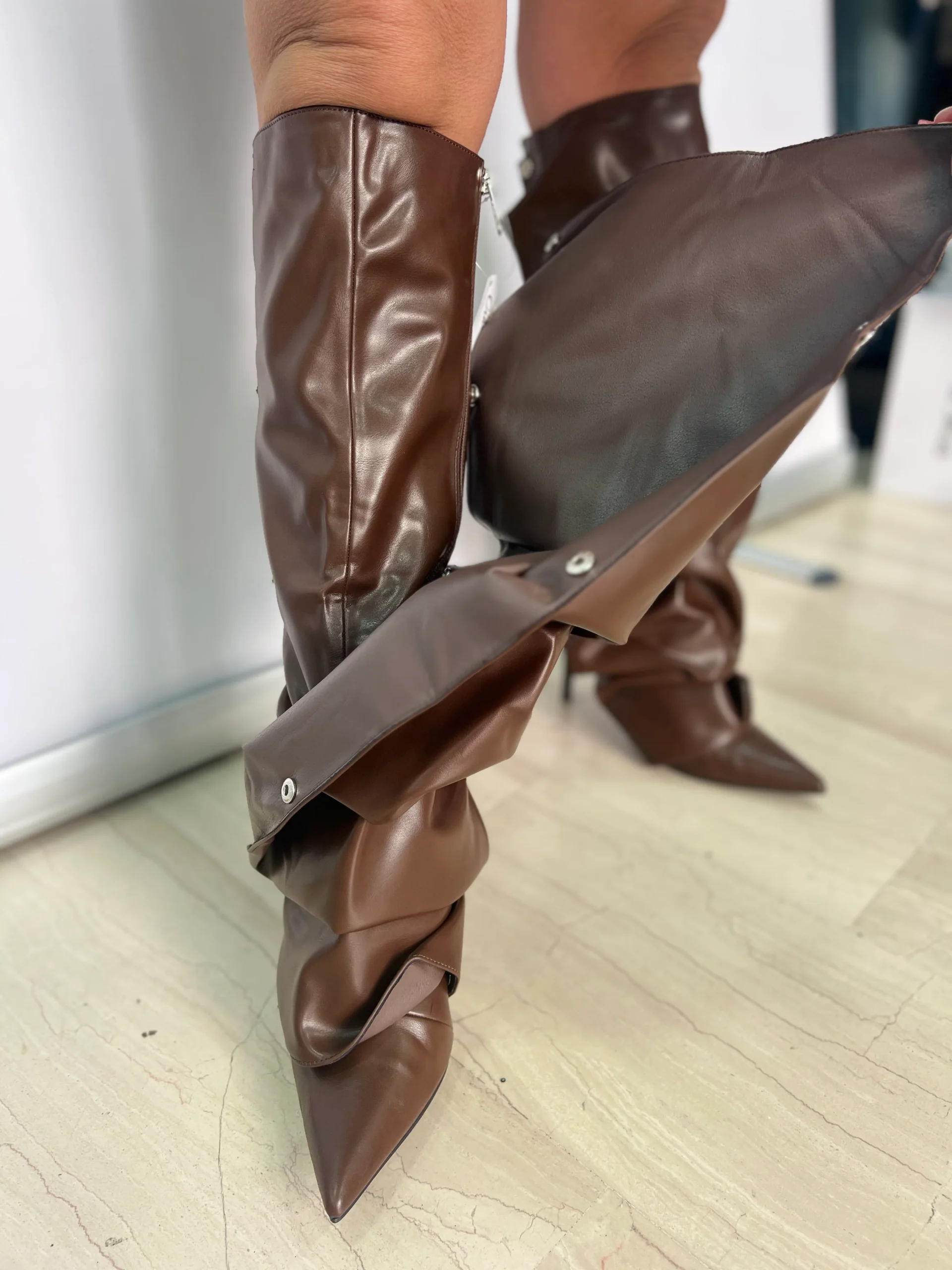 Stivali donna al ginocchio dal design grintoso e contemporaneo, perfetti per valorizzare ogni look con un tocco deciso e femminile. Il modello presenta una linea affusolata con punta pronunciata e tacco a spillo, mentre la lavorazione morbida e leggermente drappeggiata dona movimento e carattere alla silhouette. I dettagli con bottoni metallici laterali aggiungono personalità e originalità al design. Ideali da abbinare ad abiti, gonne midi o jeans skinny per outfit autunnali e invernali sofisticati. Disponibili nell’elegante tonalità marrone, versatile e facilmente abbinabile. Vestibilità regolare, aderente sulla gamba ma confortevole grazie alla struttura morbida.