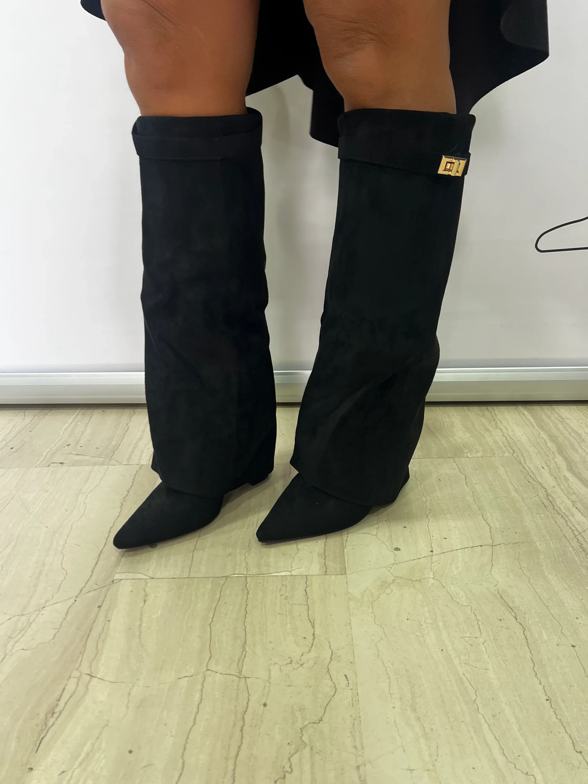 Dettaglio: Modello sotto il ginocchio con punta affusolata e decorazione metallica dorata laterale