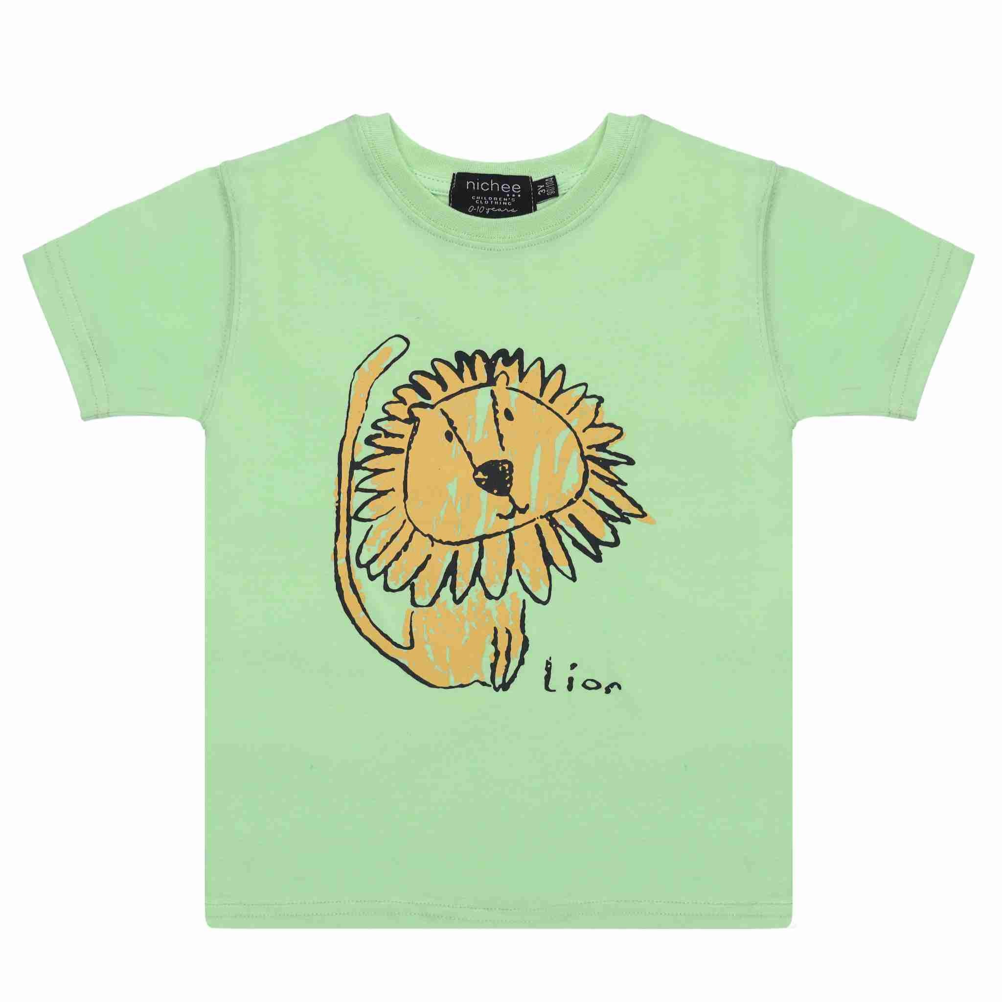 Per piccoli re della giungla: questa t-shirt paradise green con stampa leone è perfetta per bambini coraggiosi che amano gli animali e lo stile avventuroso.