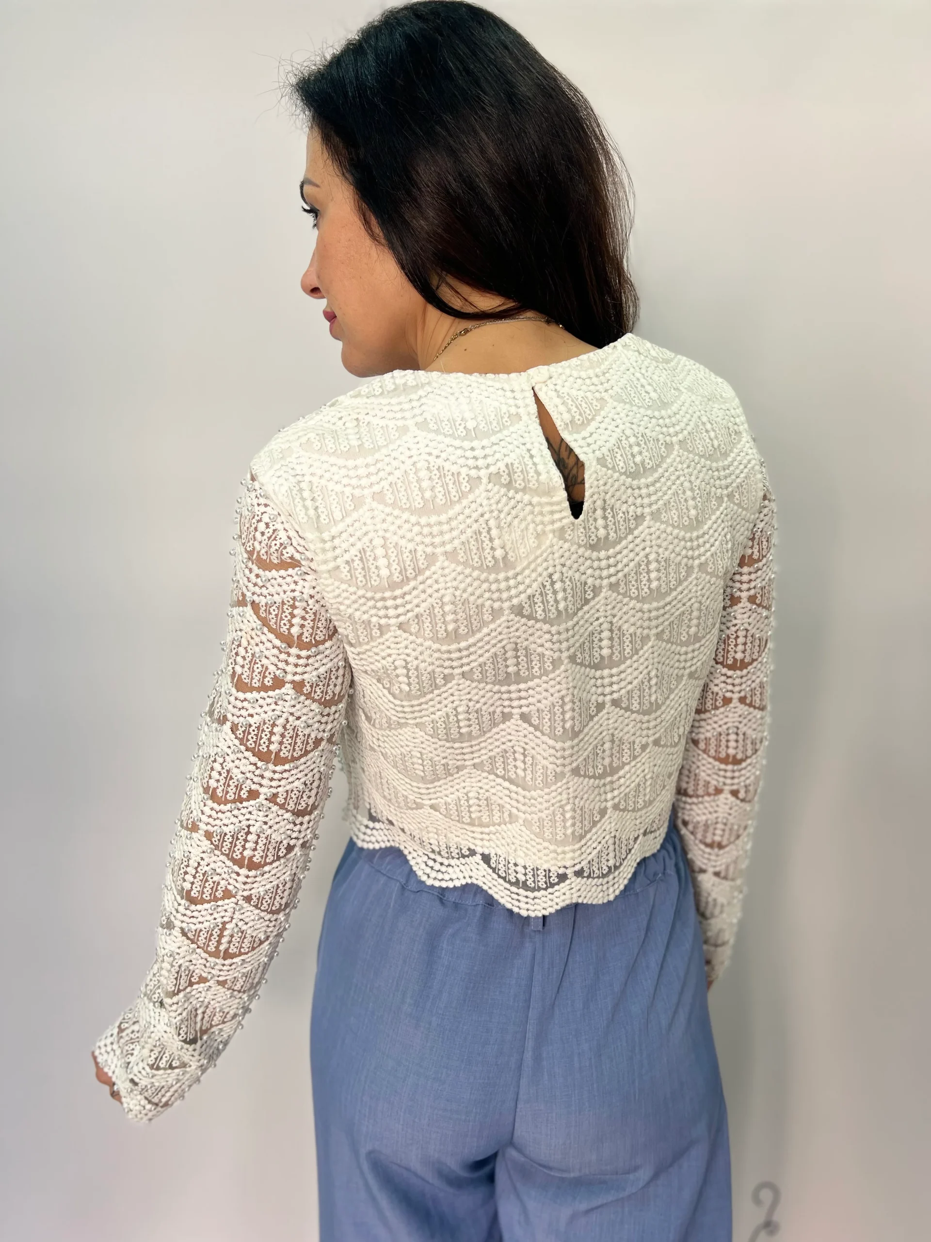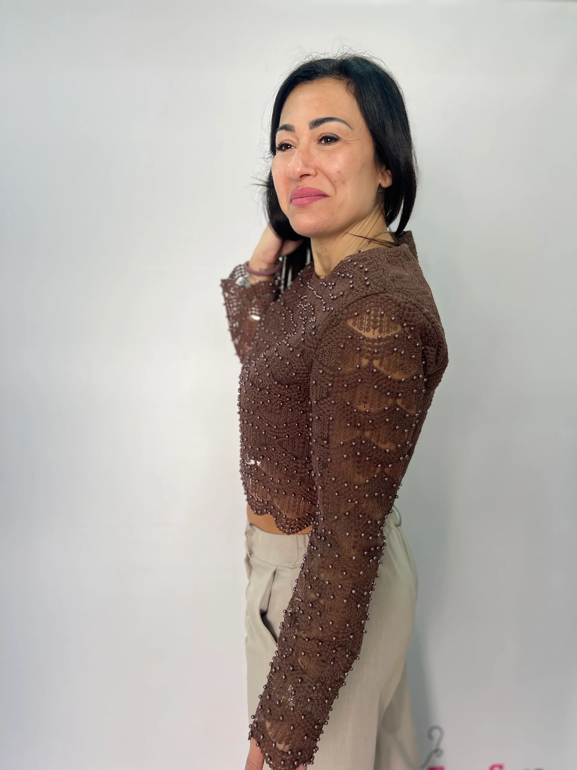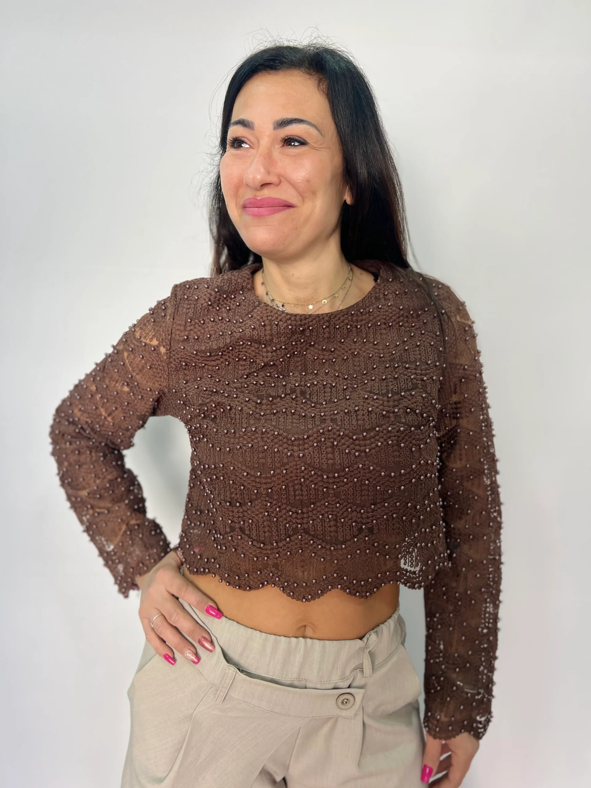 Top crop a manica lunga dal design raffinato e femminile, realizzato in delicato pizzo lavorato con applicazioni di micro perline tono su tono che donano luminosità e carattere al capo. La linea corta valorizza il punto vita, mentre la vestibilità aderente esalta la silhouette con eleganza. Perfetto per outfit da sera, cerimonie, eventi speciali o per impreziosire un look casual chic abbinato a pantaloni a vita alta o gonne. Disponibile nei colori bianco, marrone e nero, si distingue per il suo stile romantico ma contemporaneo, ideale per la stagione Primavera/Estate.