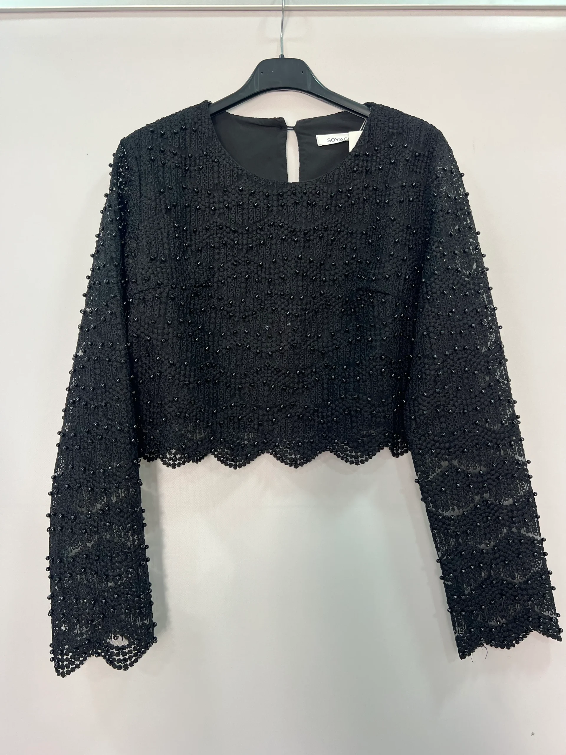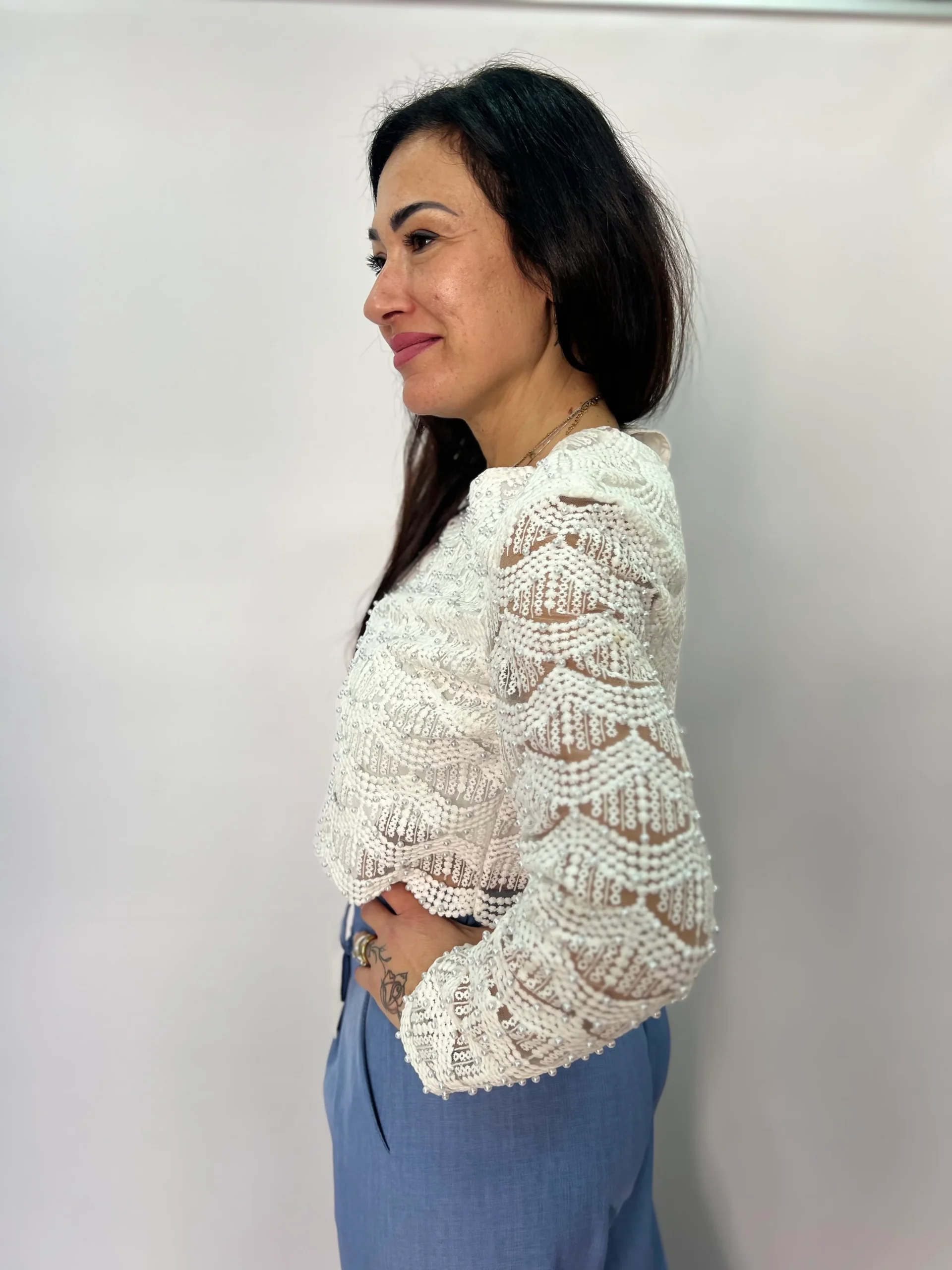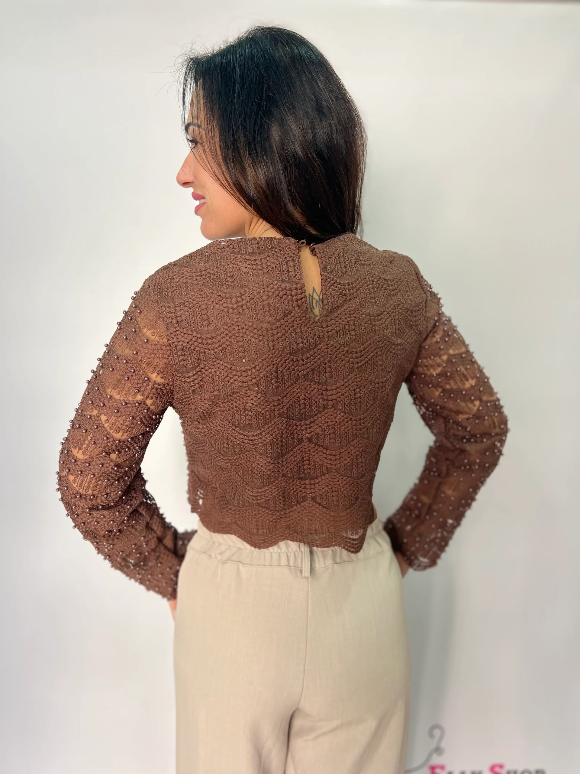 Top crop a manica lunga dal design raffinato e femminile, realizzato in delicato pizzo lavorato con applicazioni di micro perline tono su tono che donano luminosità e carattere al capo. La linea corta valorizza il punto vita, mentre la vestibilità aderente esalta la silhouette con eleganza. Perfetto per outfit da sera, cerimonie, eventi speciali o per impreziosire un look casual chic abbinato a pantaloni a vita alta o gonne. Disponibile nei colori bianco, marrone e nero, si distingue per il suo stile romantico ma contemporaneo, ideale per la stagione Primavera/Estate.